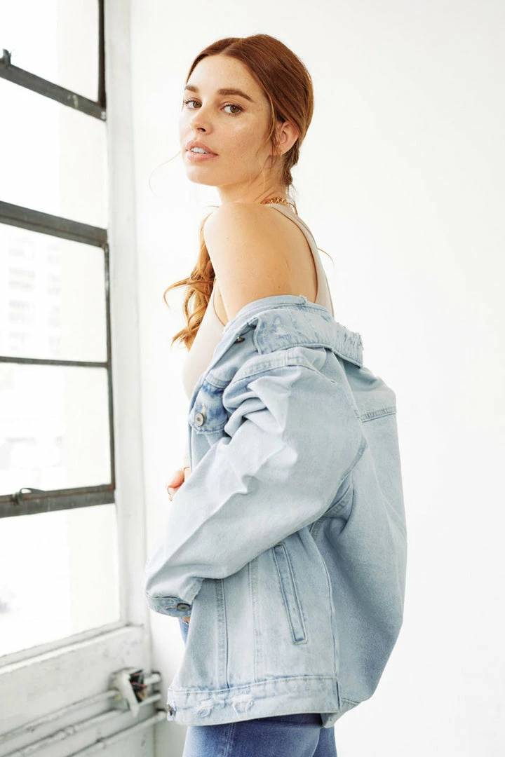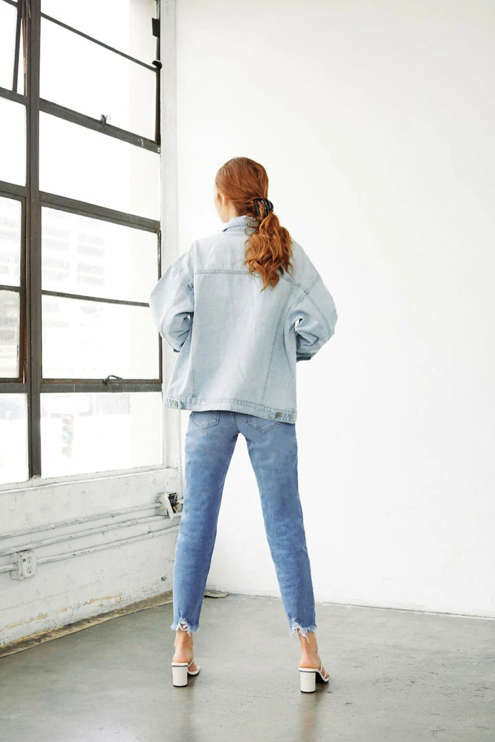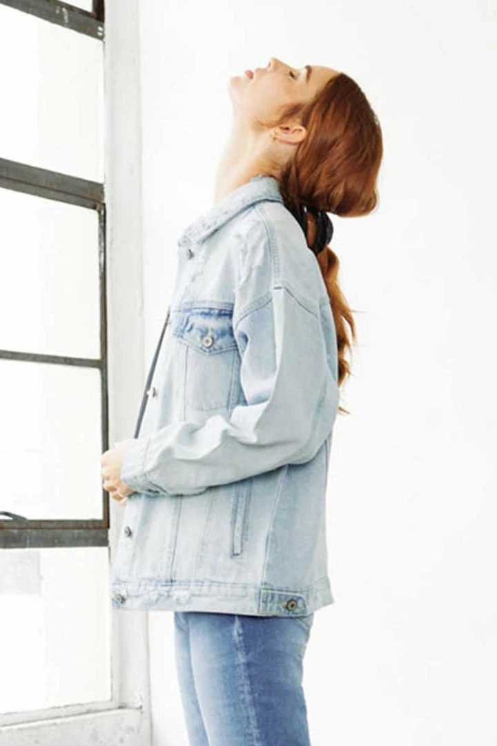 A light-washed denim jacket with an oversized fit that drapes over the body for a trendy look that goes well with any fit. Our Aaliyah Denim Jacket comes with minor distress for an edgy vibe, perfect for layering on warm summer nights or covering up during the colder seasons. Accented with gold-colored hardware for an added luxe look. Features a basic collar, button-down closure, two side pockets, finished with two button-flap pockets at the chest.