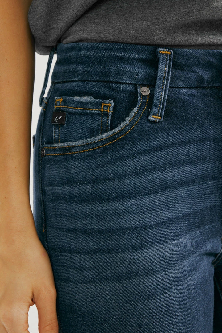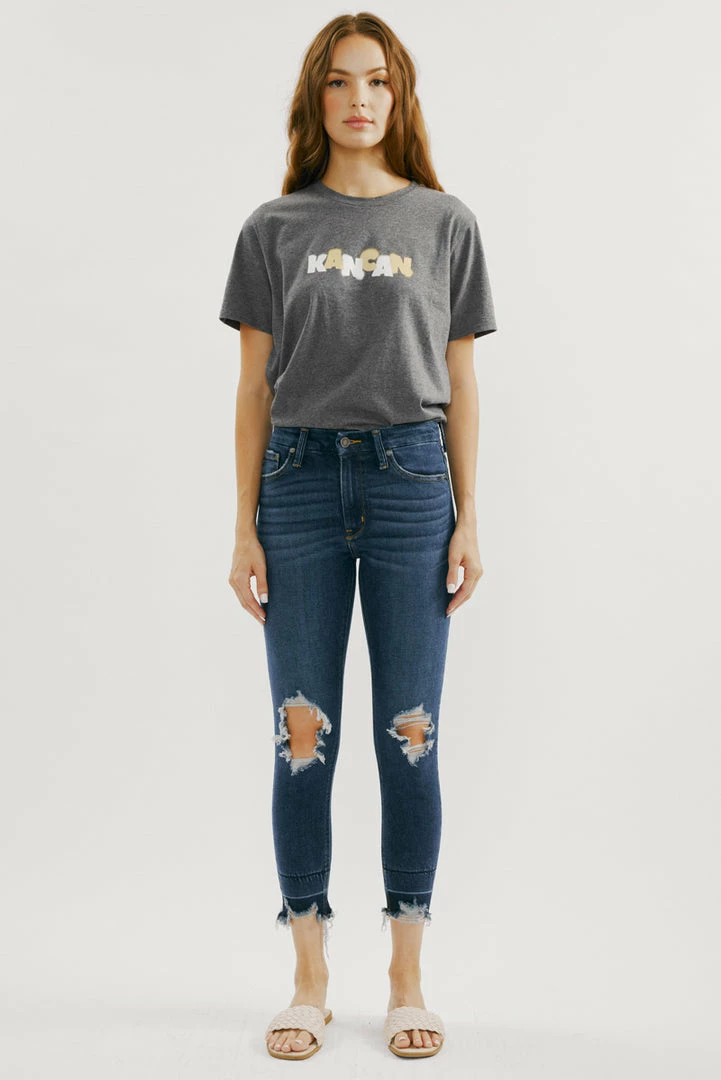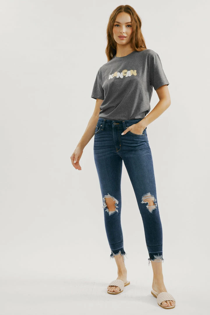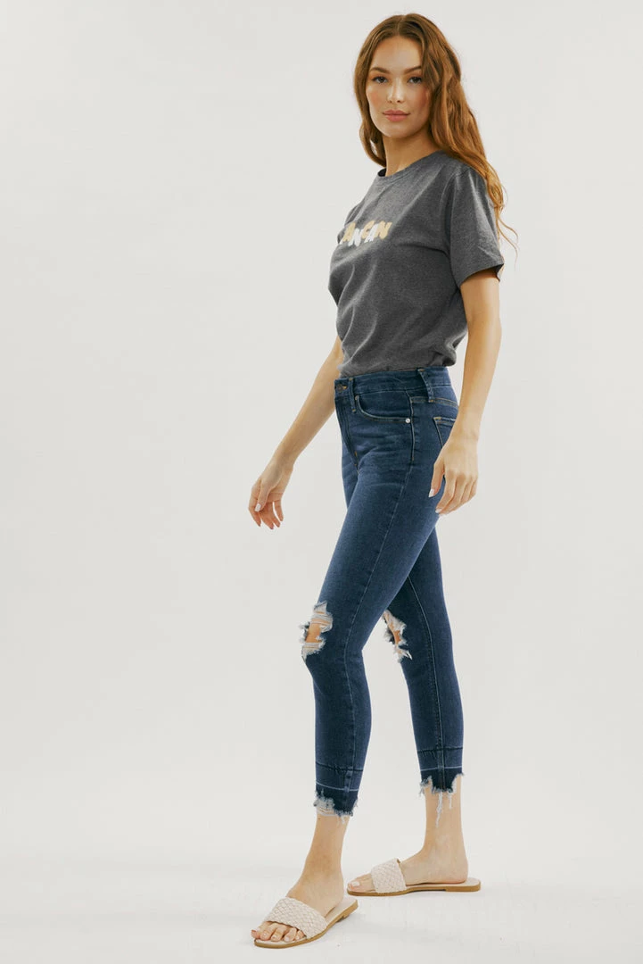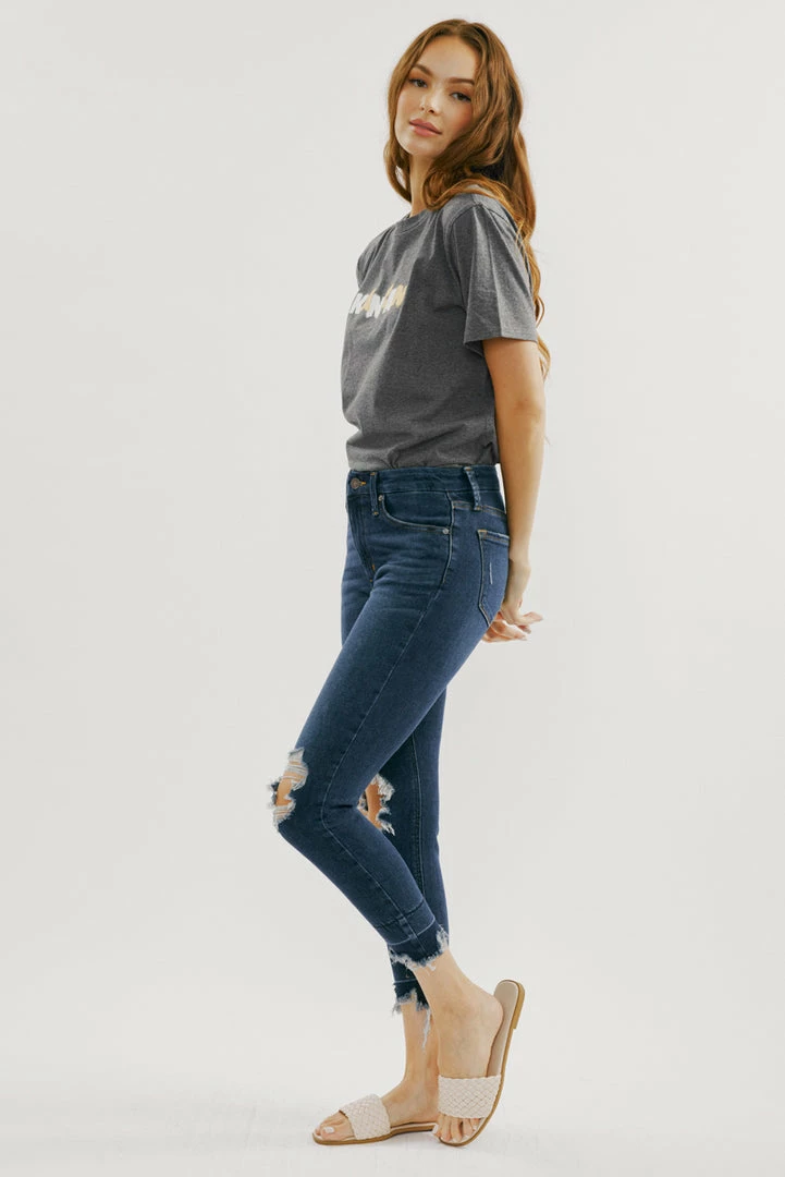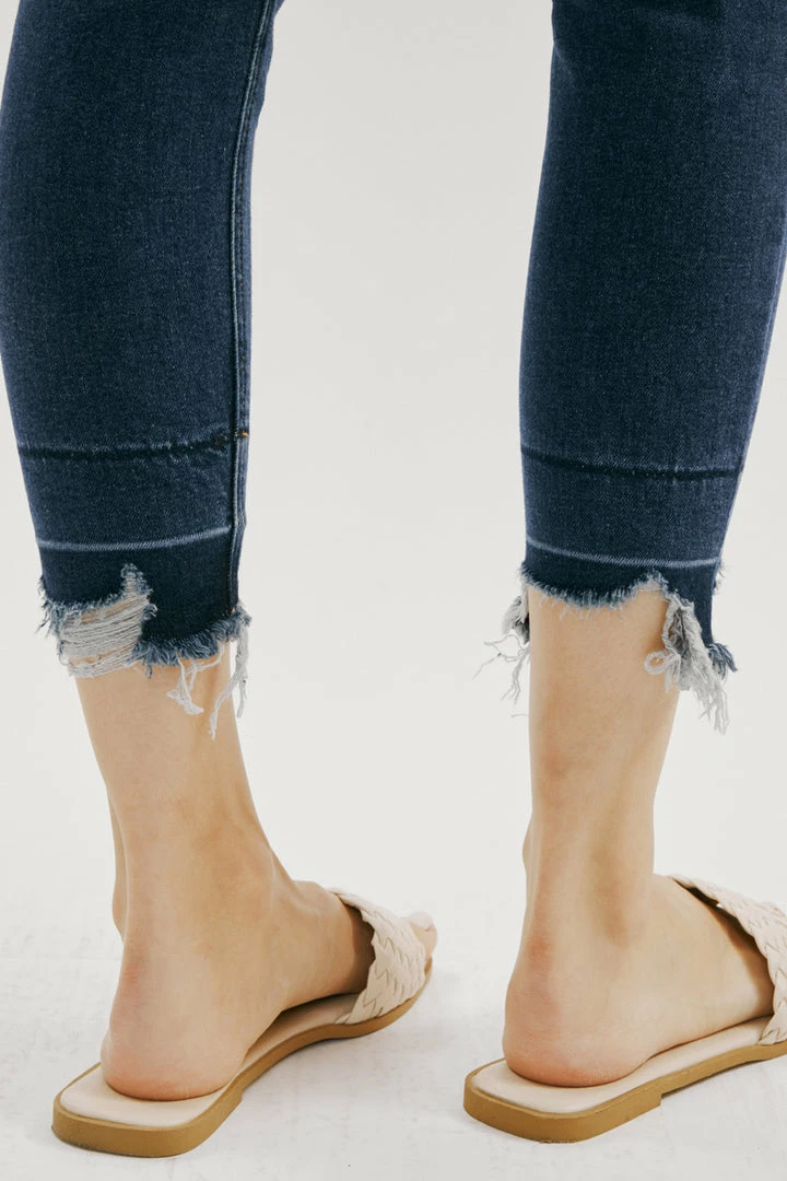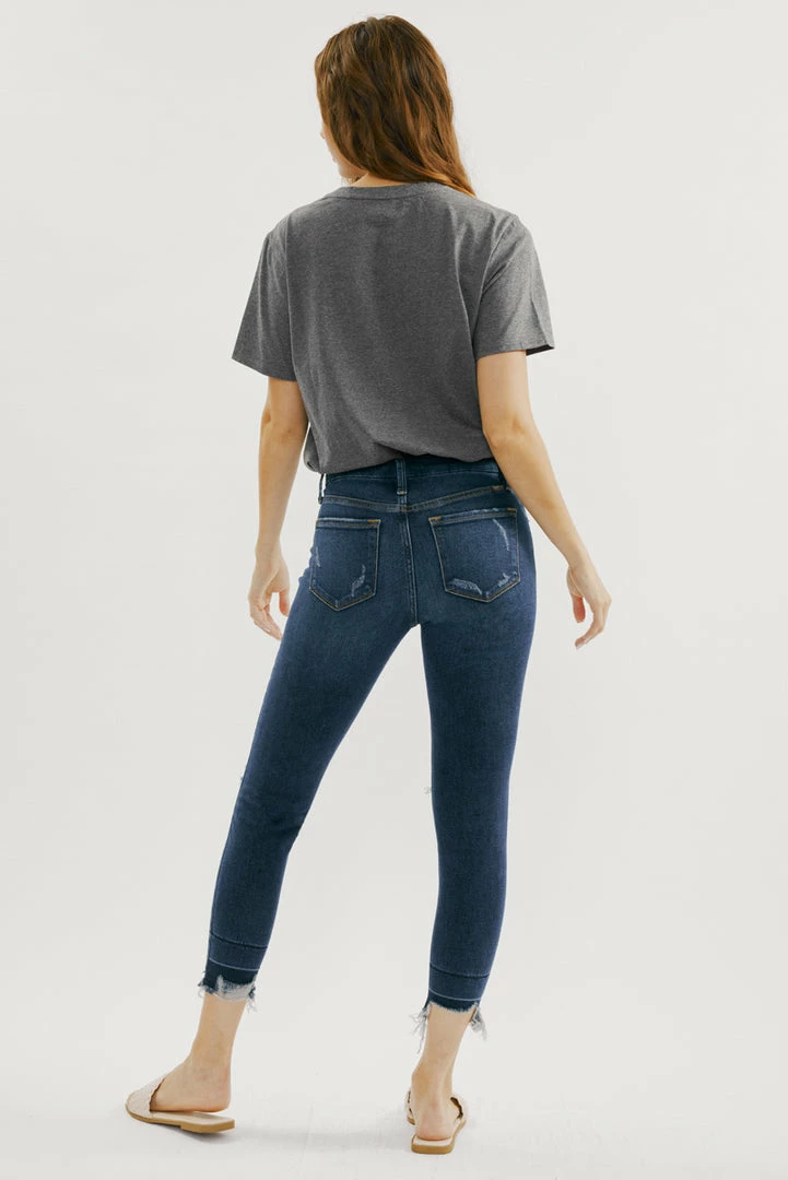 Our Ahri High Rise Jeans come in an ankle skinny fit with a lightly faded wash, 3D whiskering, and distress detail on the knees, back pockets. It comes with a raw staggered hem featuring distress detail that gives it a more rugged chic look. Sits above the natural waistline as it tapers down the leg creating a figure-flattering silhouette that’s perfect for dressing up or down. Made with smooth stretch denim that allows you to move with ease without bagging out after each wear. Features a classic five-pocket design, single-button front, and zip-fly closure.