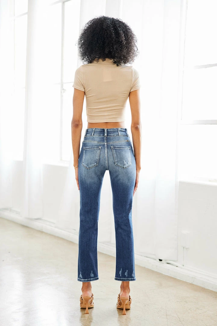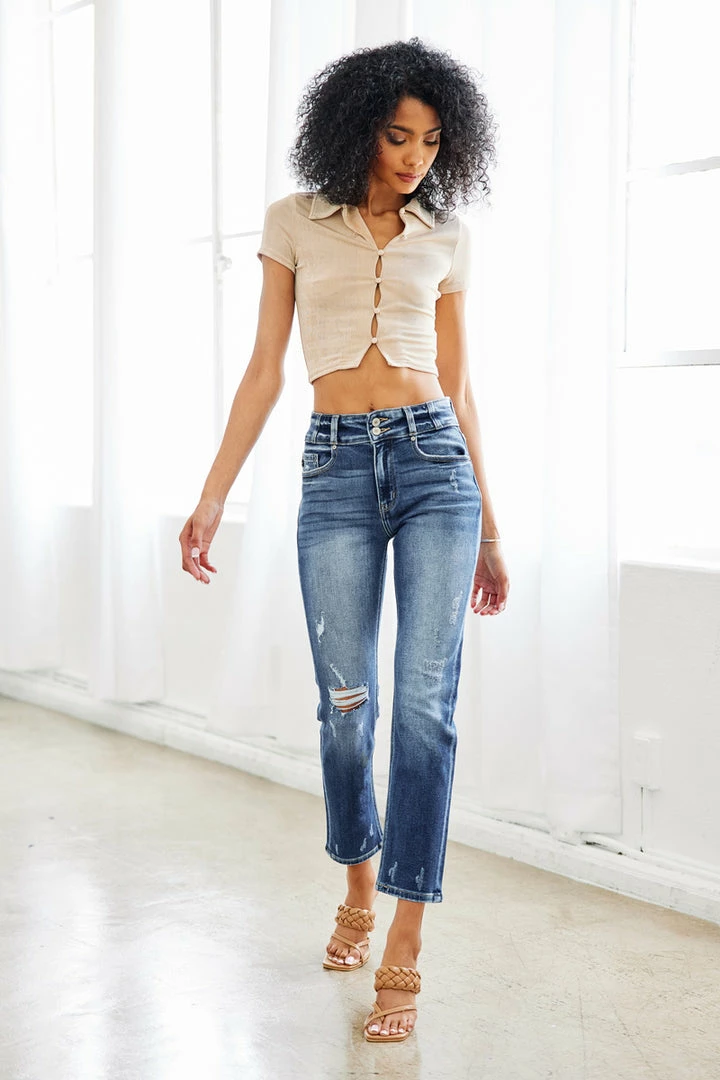 Show off your sleek yet trendy style with this pair of high-rise straight jeans featuring distressing at the knees, single-button closure with zip fly, and a 5-pocket design.