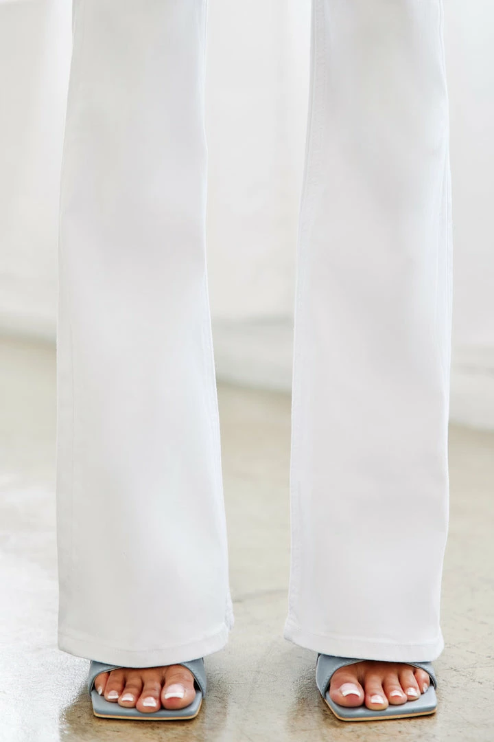Our Alaska Mid Rise Jeans come in a classic flare cut in an opulent white color that was made to stand out. Sits right at the natural waistline as it gently tapers down the leg and begins to flare out at the calf. Made with super-stretch denim that keeps you feeling comfortable all day and won’t bag out after each wear. Features a classic five-pocket design, single-button front, and zip-fly closure.
