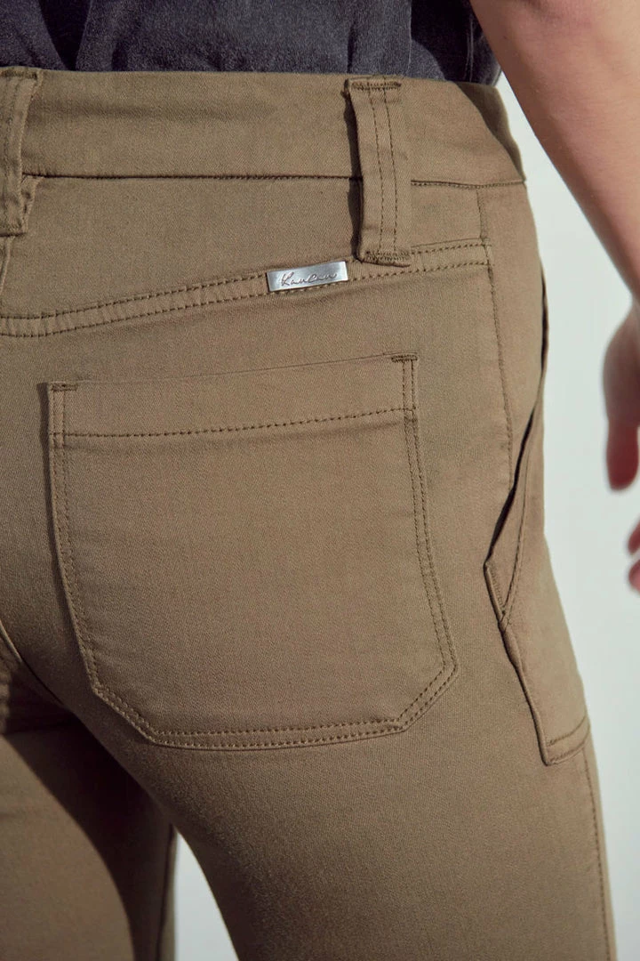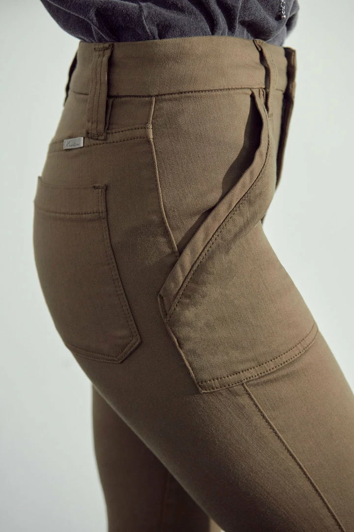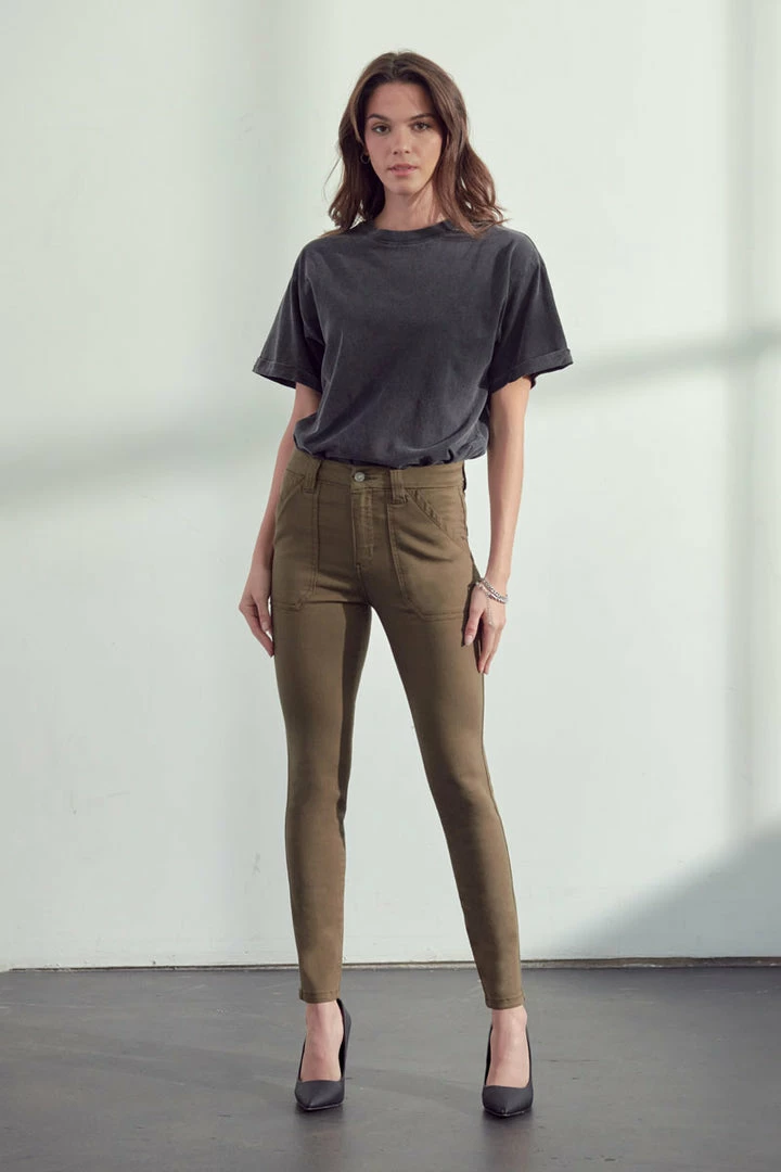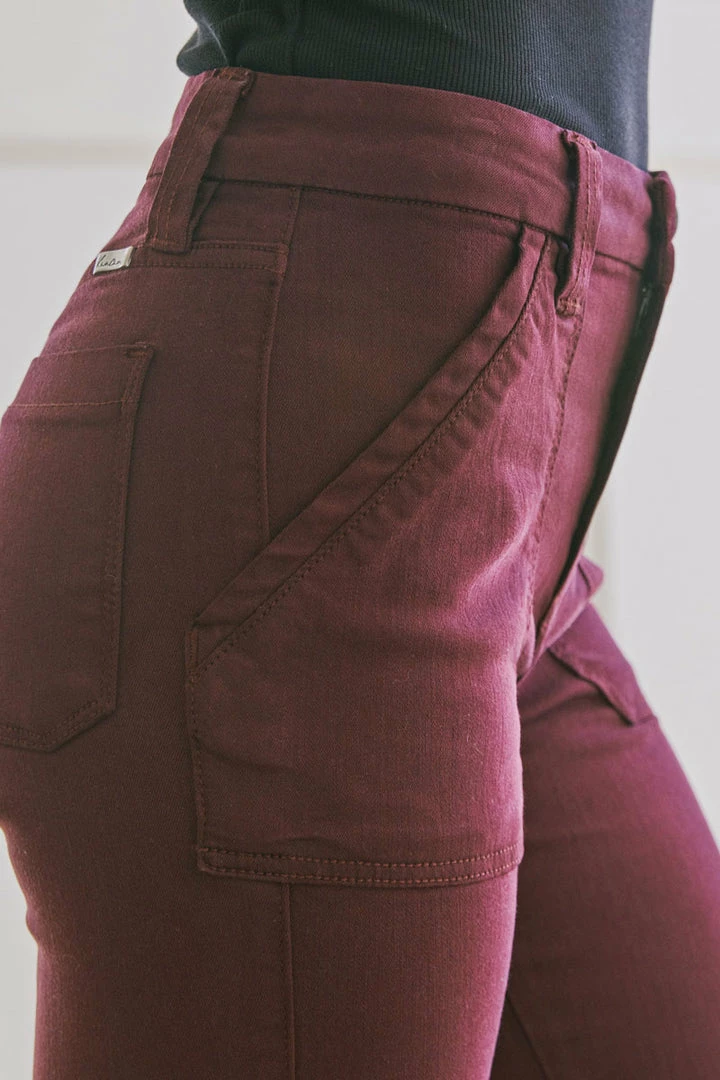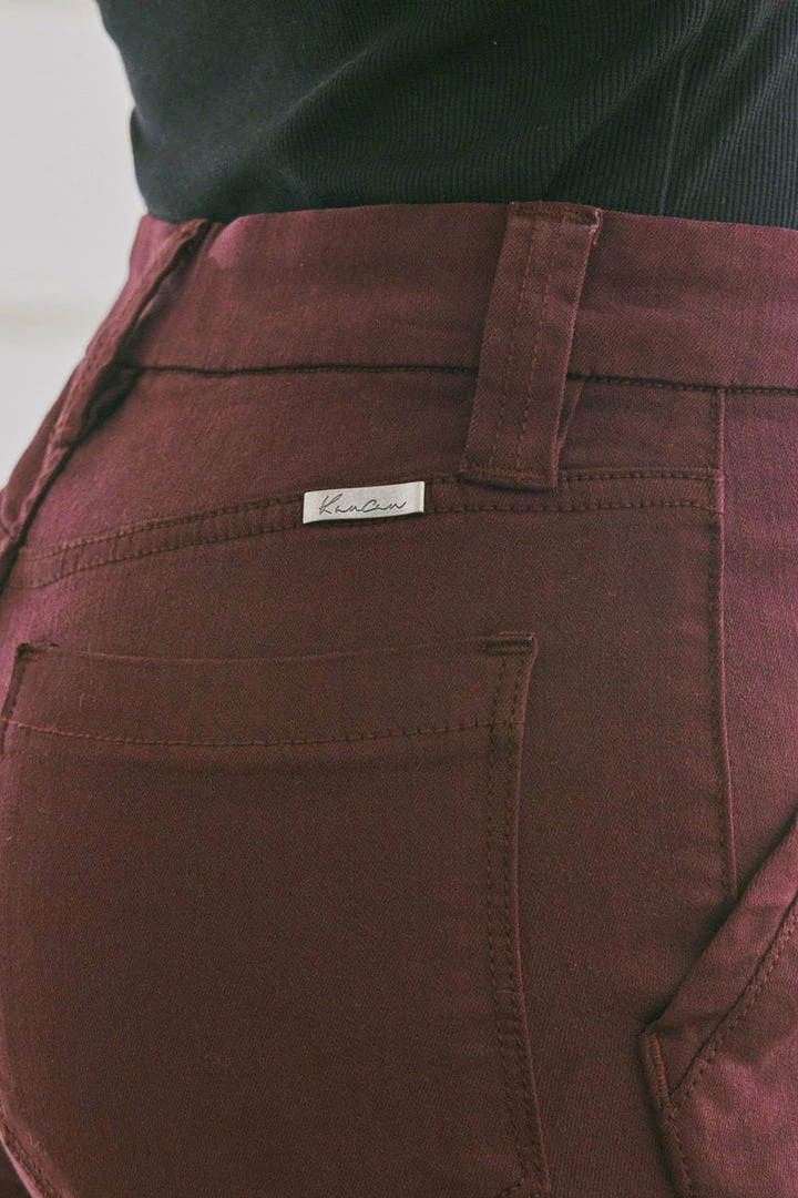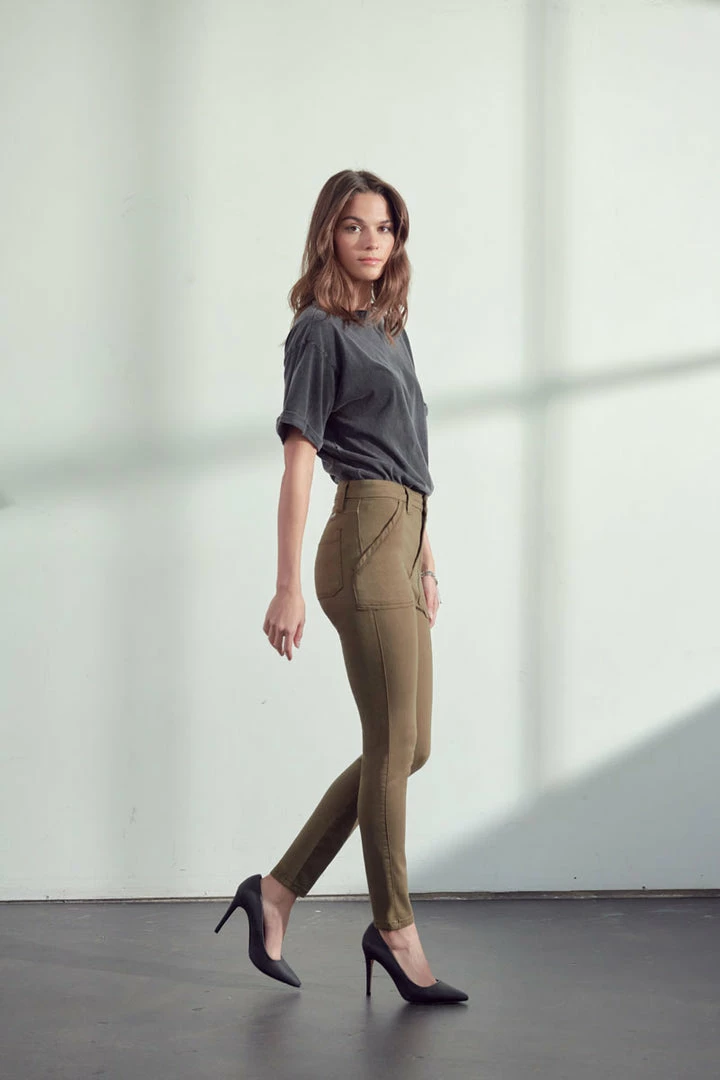 Our Anaya jean comes in burgundy and olive with front patch pockets. This high-rise style sits right above the waistline and shows off the natural body glass shape and elongates the legs. These classy jeans are the perfect business casual piece that can also be easily spiced up for a night out.