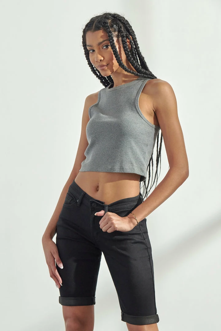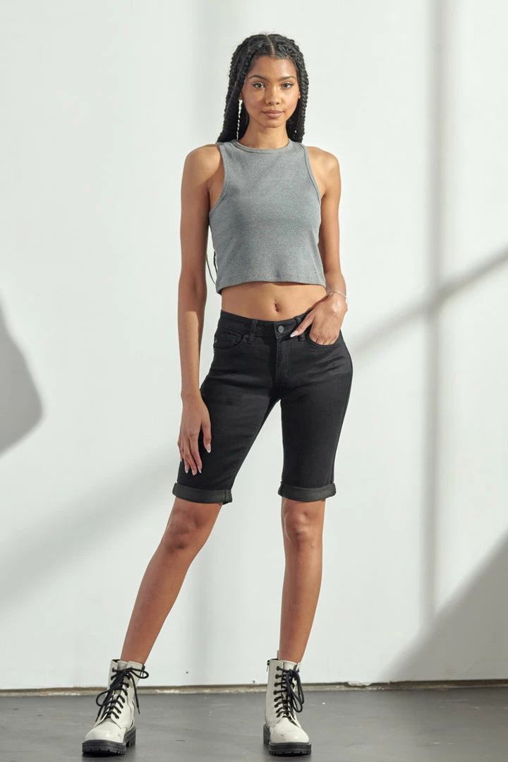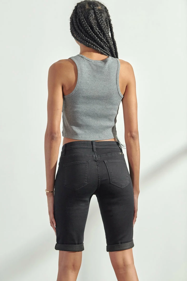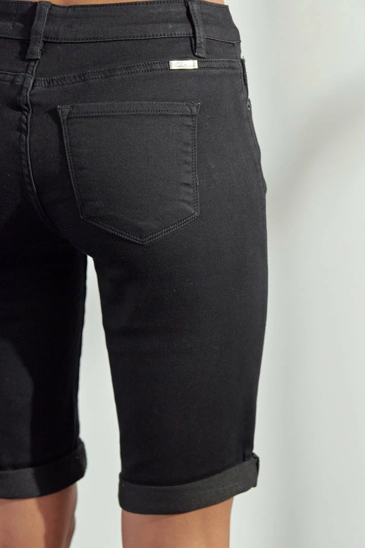 Basic black Bermuda denim shorts featuring cuffed hems, regular 5 pockets, a single button fastening, zip, fly, and a standard belt loop.