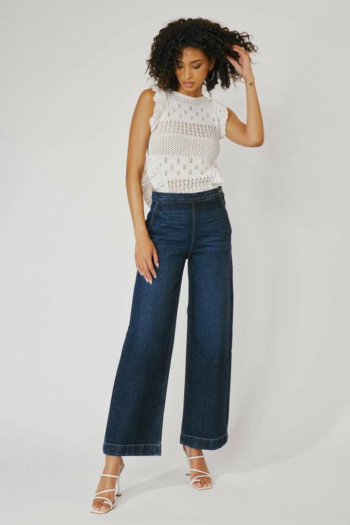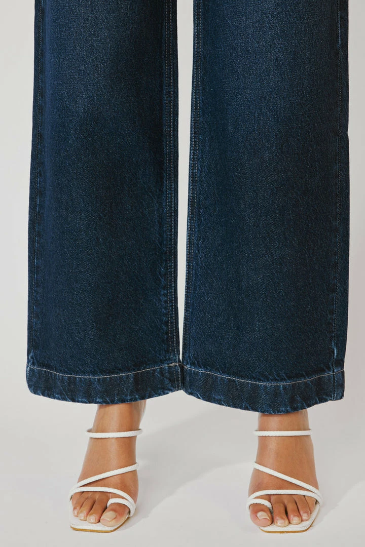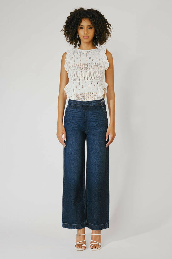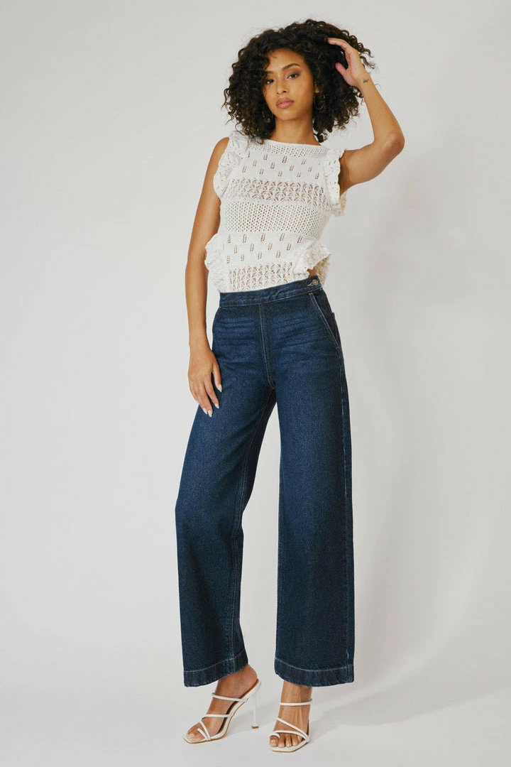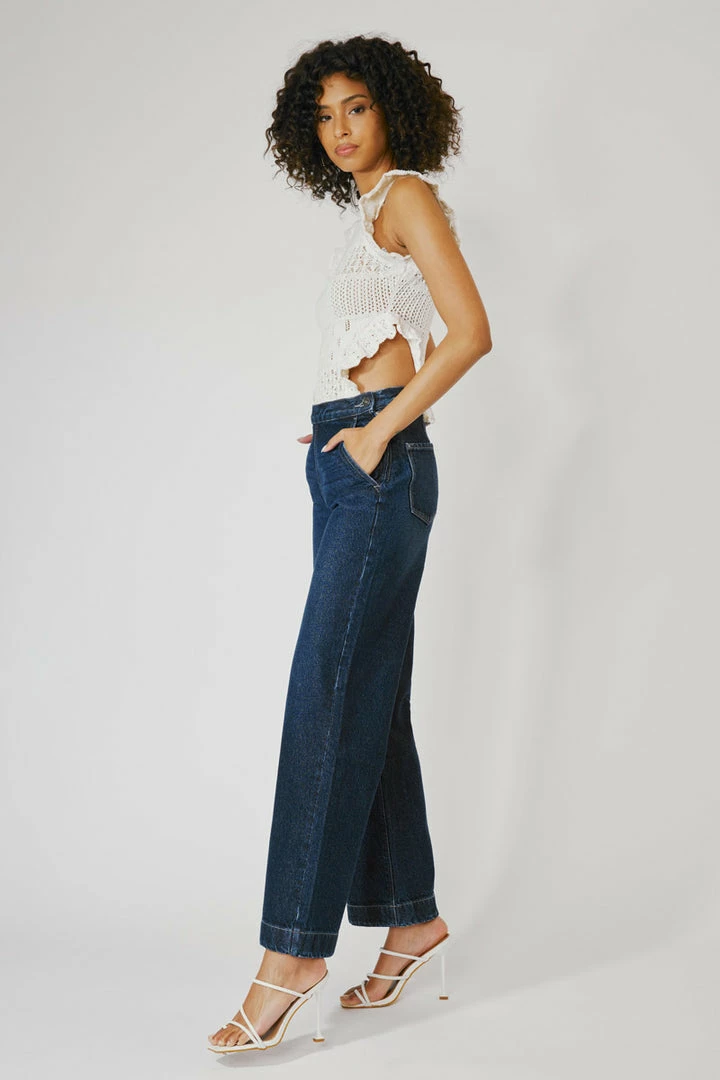 Denim with a sophisticated wide-leg silhouette that drapes over the body for a relaxed fit. Our Anthea Ultra High Rise Wide Leg Jeans sit high above the waist for an easy fit that will elongate the legs. Made with lightweight rigid denim that allows you to move freely while maintaining its shape after each wear. Features a side waist zipper and front button closure, front slanted pockets, back darts, and back patch pockets.Â
