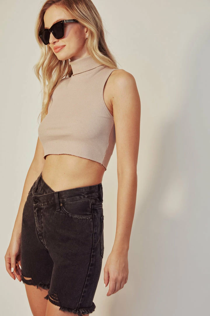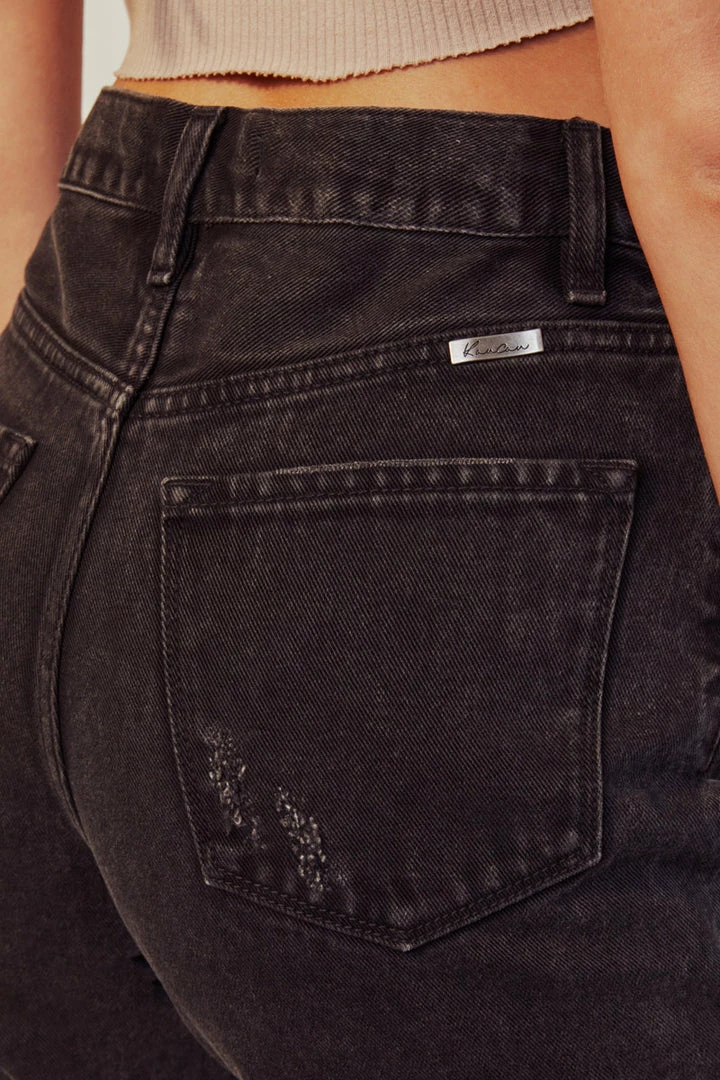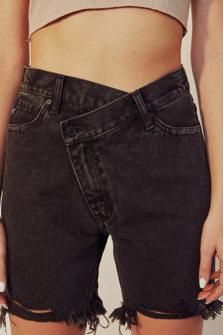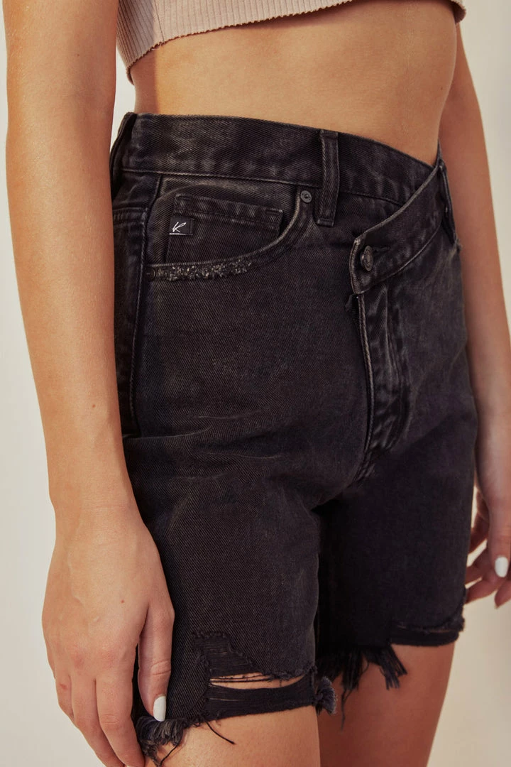A washed black Bermuda short with slight destruction on the front and back with raw hem detail for an edgy, lived-in look. Our Arabella Ultra High Rise shorts are a unique take on a classic Bermuda short, with its loose fit and cross-over button front, this short is a must-have for your summer wardrobe. Made with rigid denim for a not-too-stiff fit that’s comfortable and won’t bag out. Features a classic five-pocket design, cross-over button front with a hidden button on the inside of the waistband, zip-fly, finished with black-colored hardware.