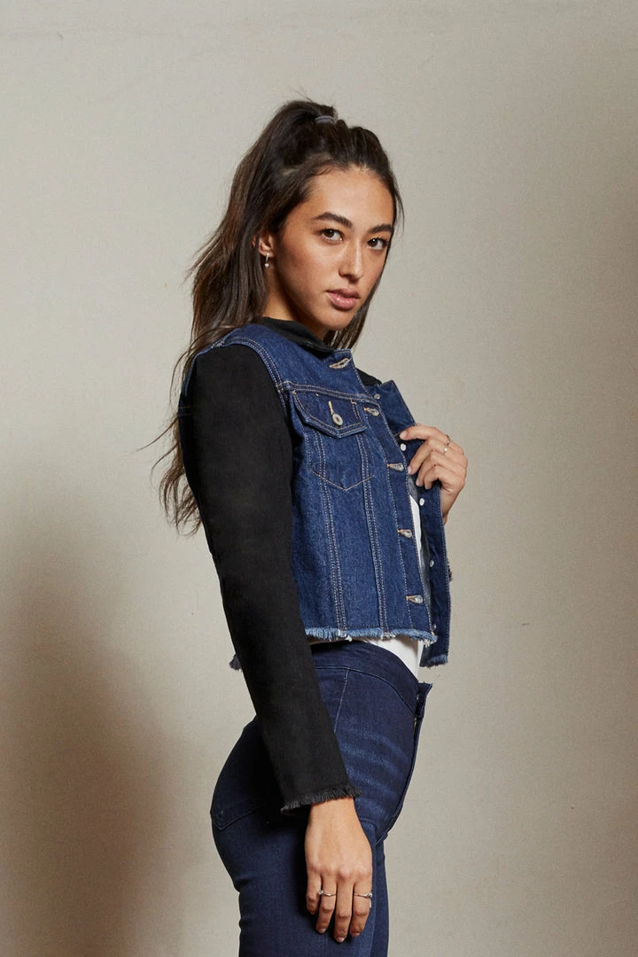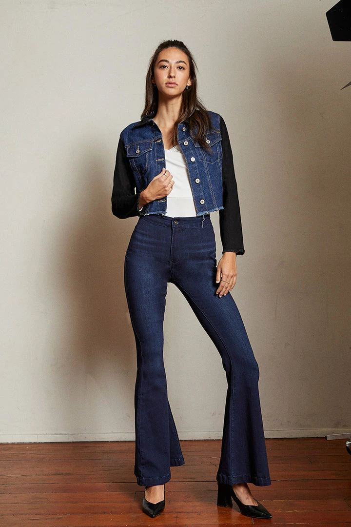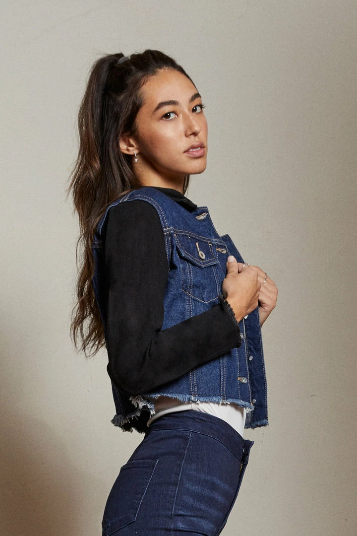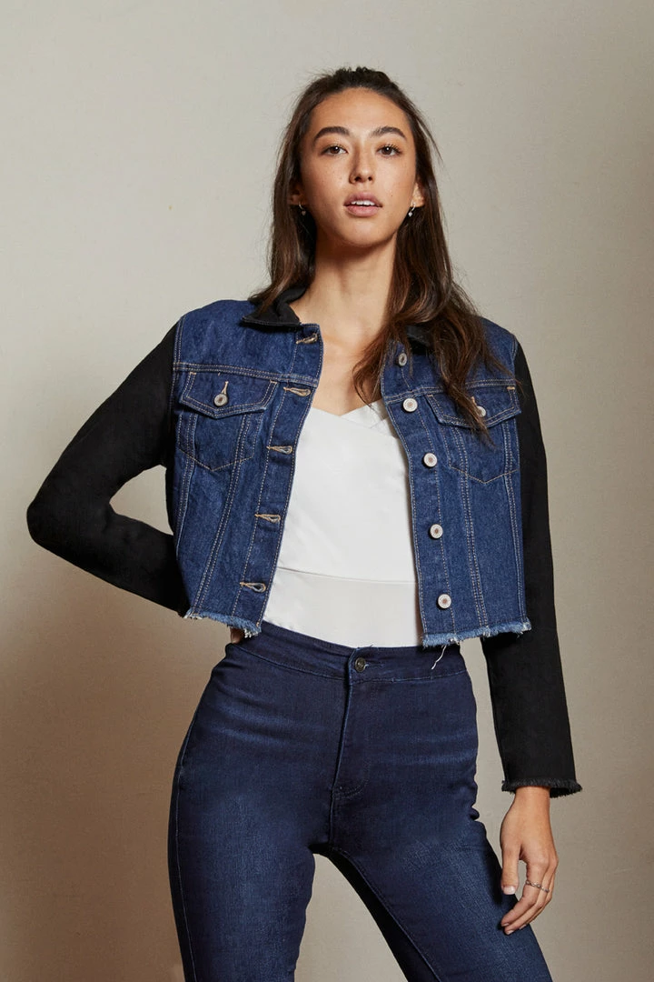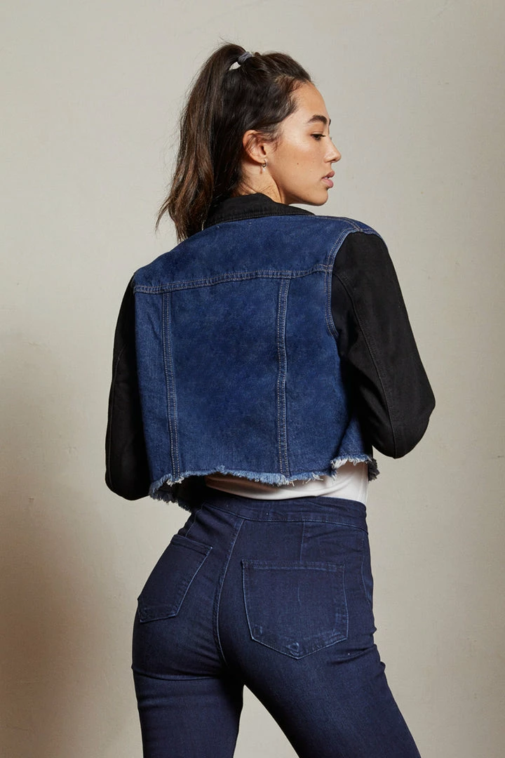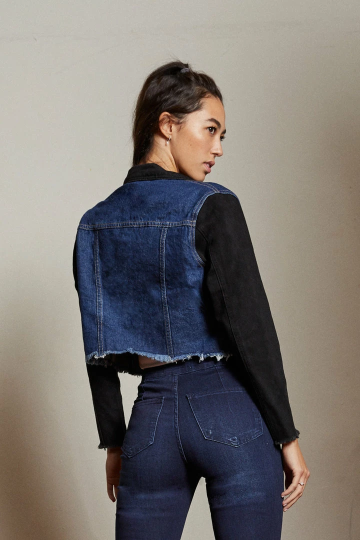 Dark stone-washed two-tone relaxed crop denim jacket designed for those who are looking for a unique and flattering denim jacket.