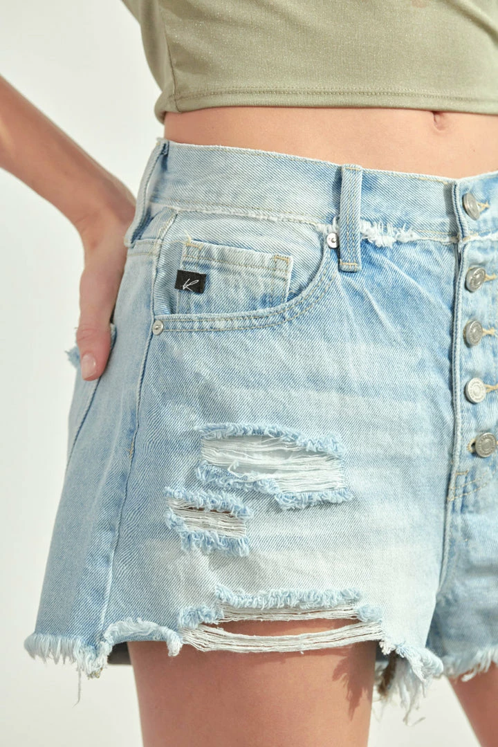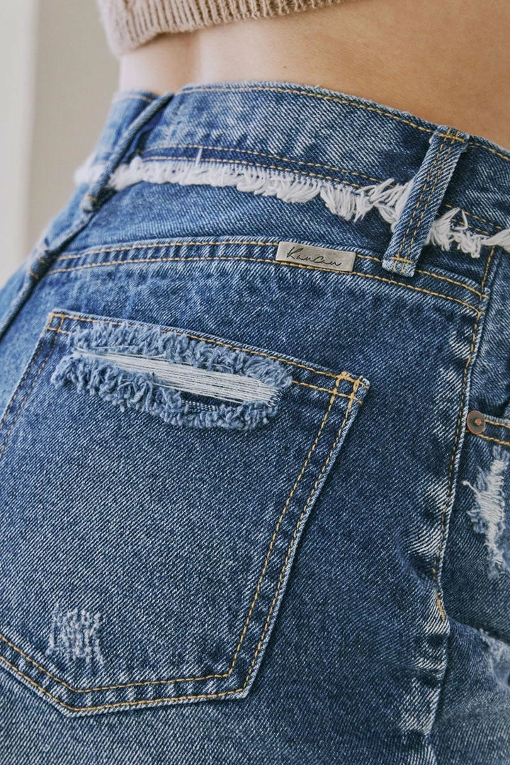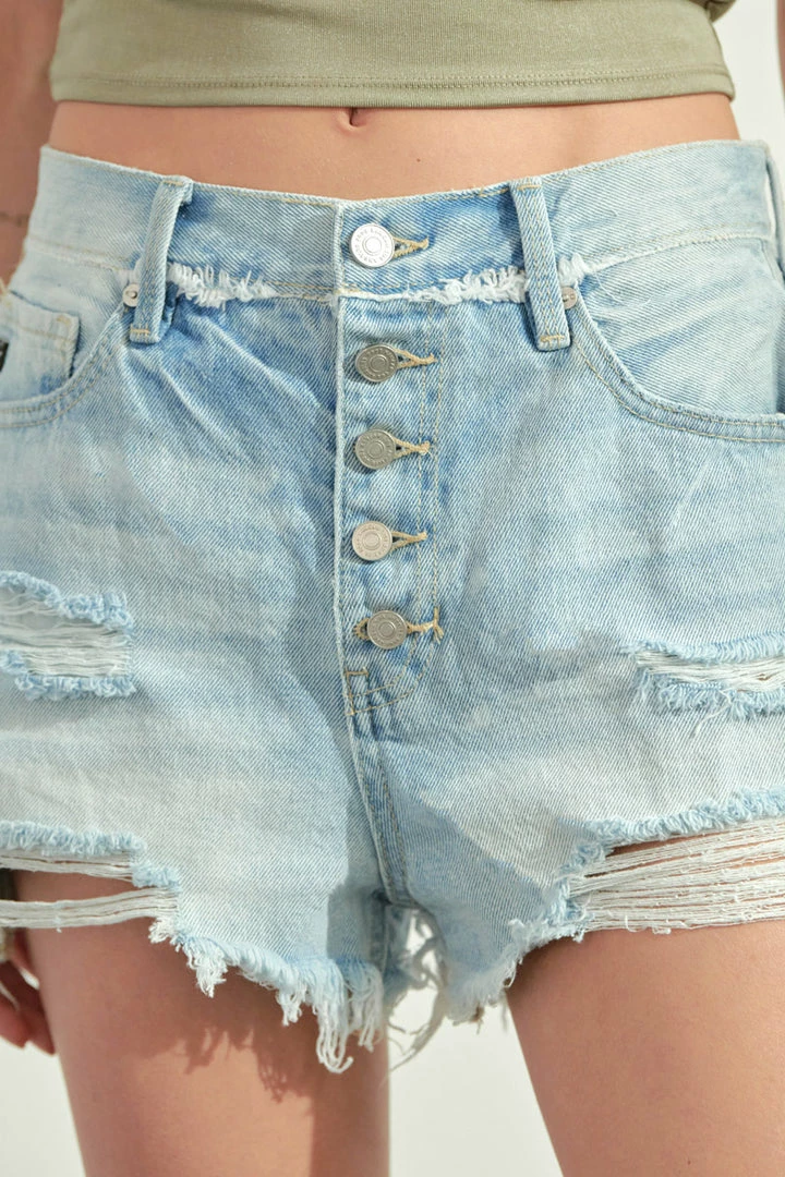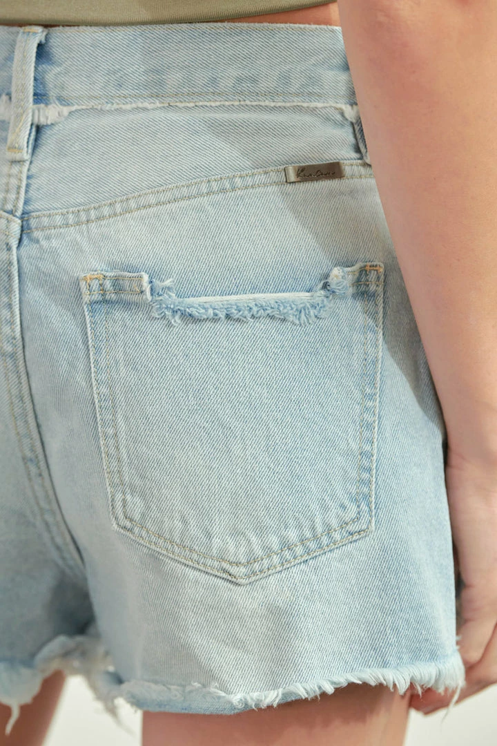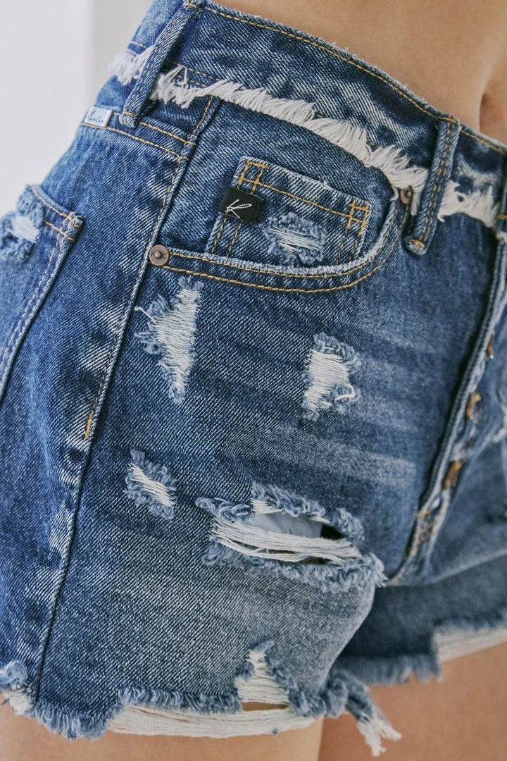 A medium and dark-washed short with optimal distress and a raw hem for an edgy look and feel as well as frayed detail along the trim of the waistband. Our Aura Ultra High Rise Shorts come in a cool denim structure that was made for summer days. Sitting high above the waist as it relaxes down the hips and thigh for a comfortable fit. Comes complete with a classic 5-pocket design, and a 5-button front.