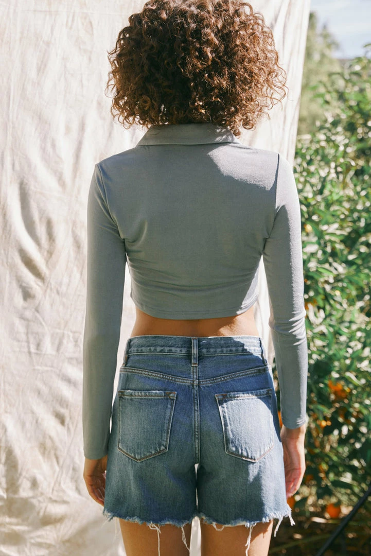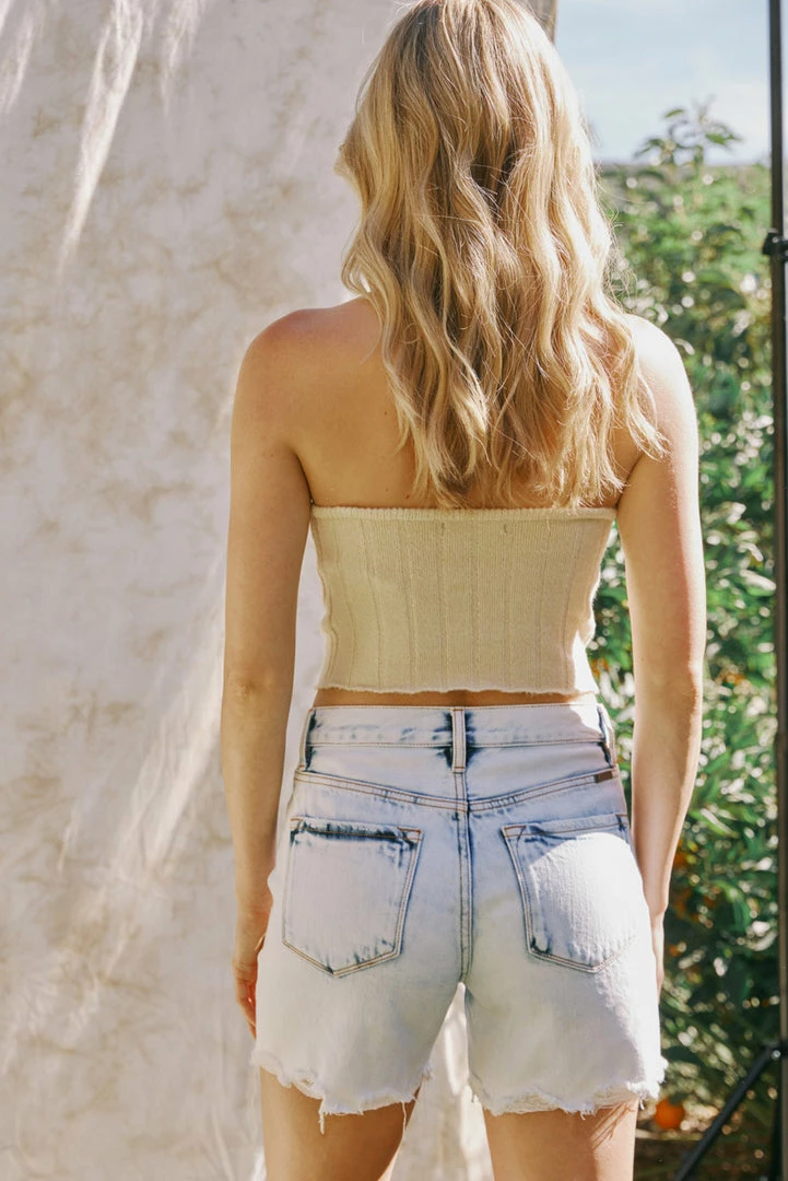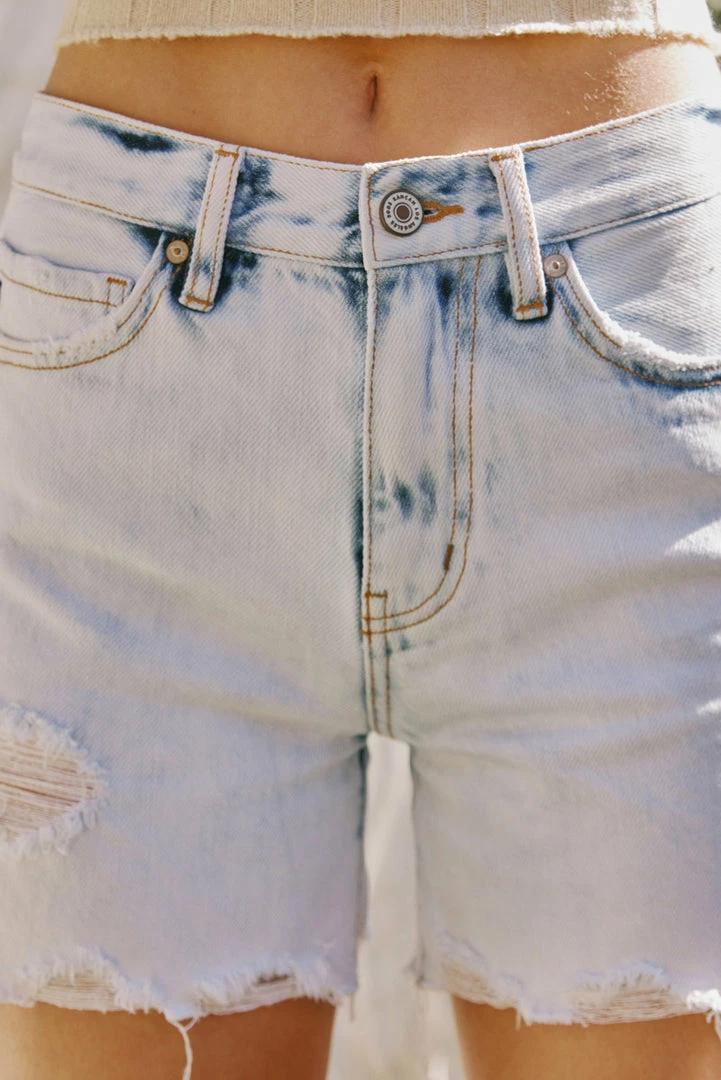 AÂ medium and acid-washed short with subtle distress and a raw hem for an edgy look and feel. Our Bellini High Rise Shorts come in a cool denim structure that was made for summer days. Sitting above the waist as it relaxes down the hips and thigh for a comfortable fit. Comes complete with a classic 5-pocket design, and a 5-button front.