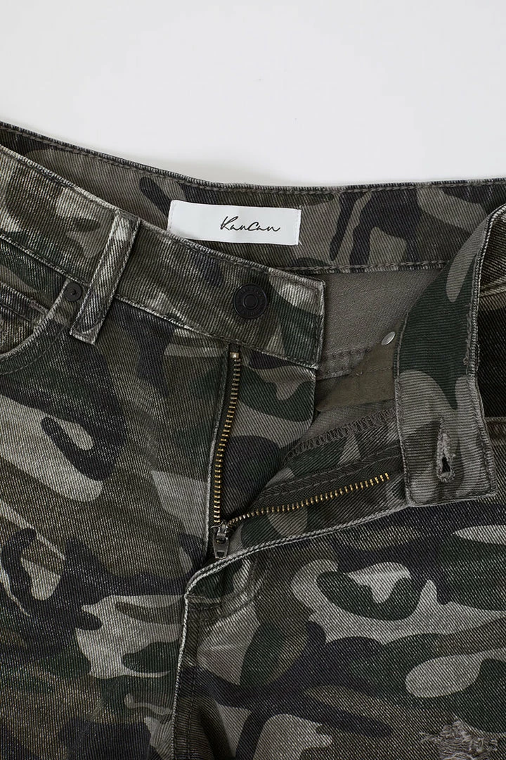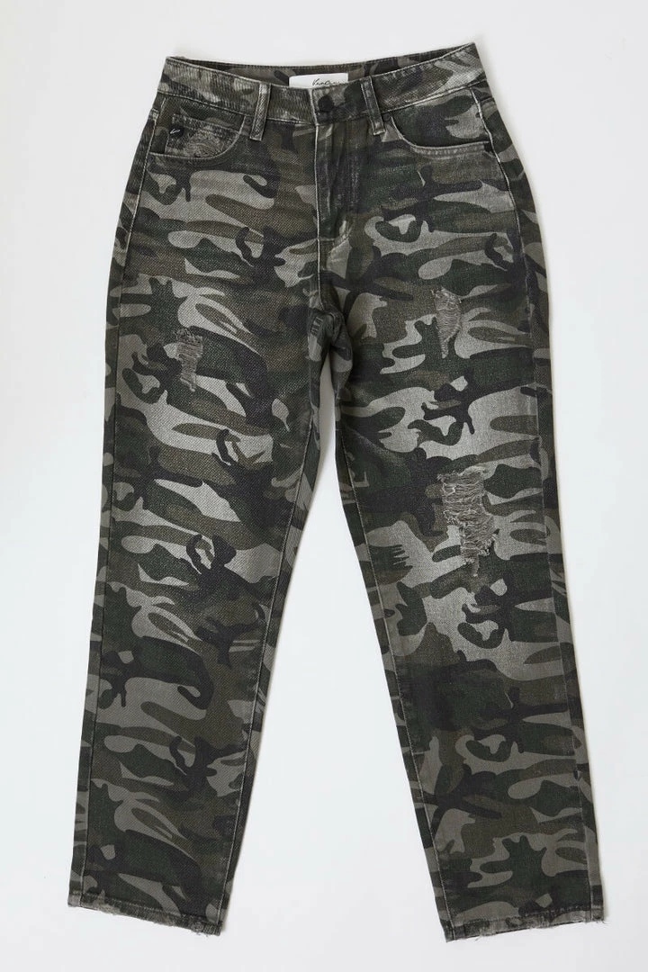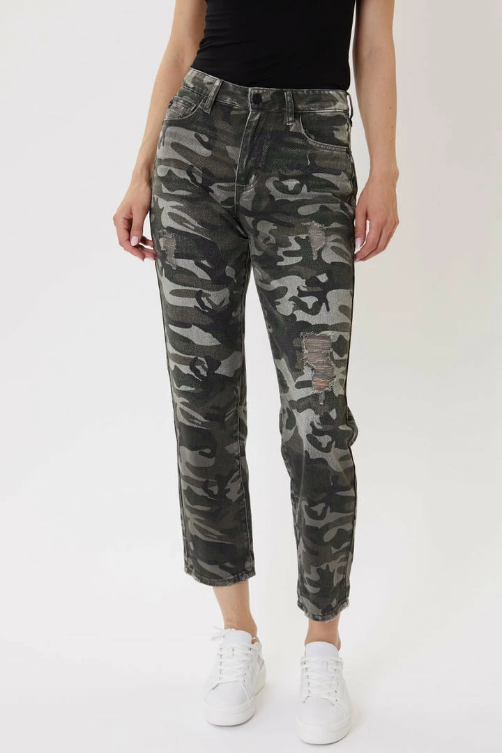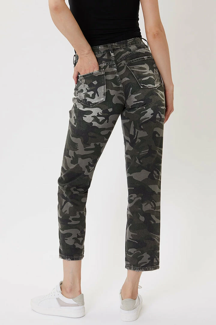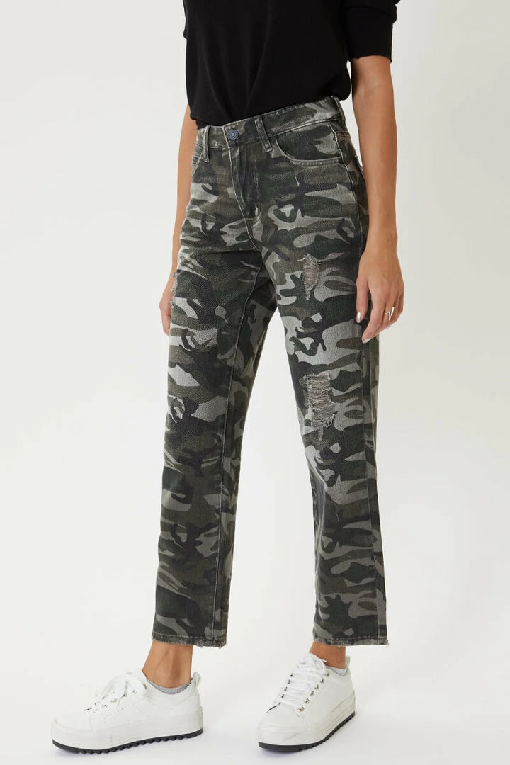 Bring out your playful side with these camo-print boyfriend jeans with a relaxed fit.  The green camo print allows you to keep the rest of your outfit simple. Featuring slight distressing on the thighs, single-button closure, and a 5-pocket design. Pair it with a simple tee and sneakers, or you can create a bolder look with boots and an oversized sweatshirt!