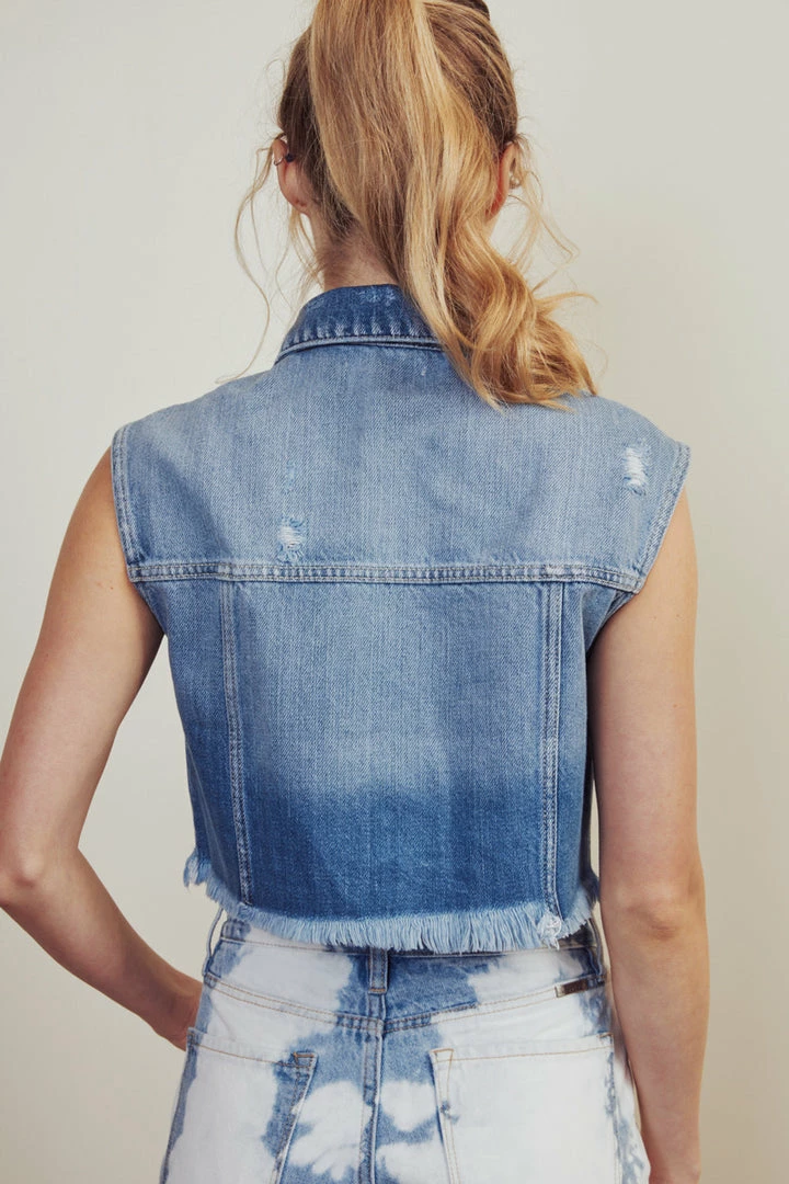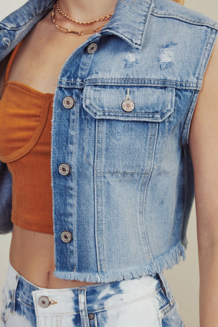 The Billie 90’s cropped vest is an instant wardrobe favorite. This chic medium-washed vest is perfect to pair with shorts or jeans. Featuring a frayed hem, basic collar, and front flap pockets.Â