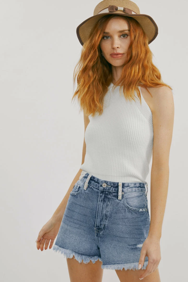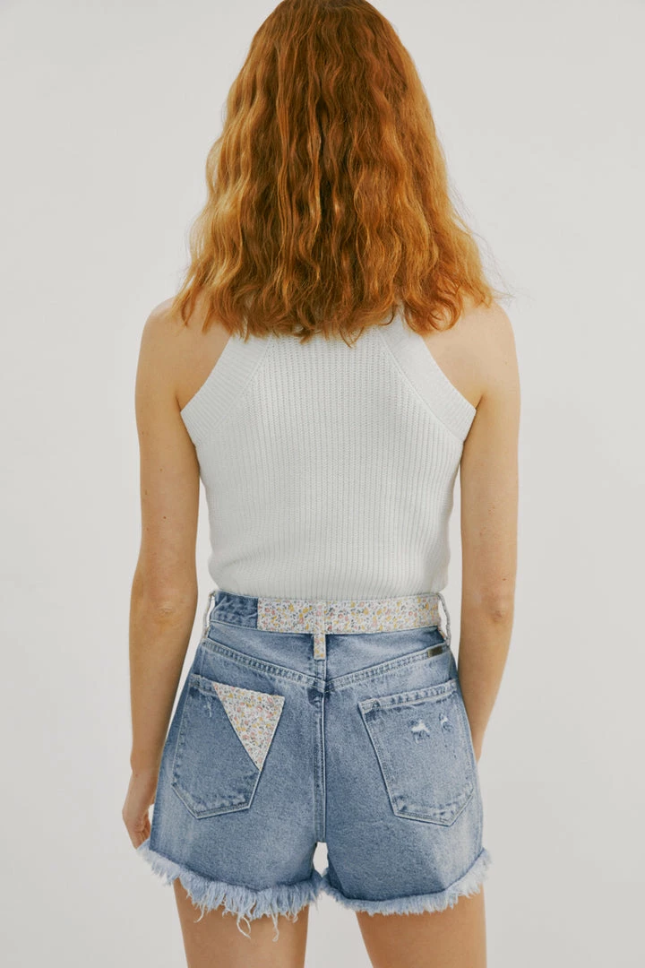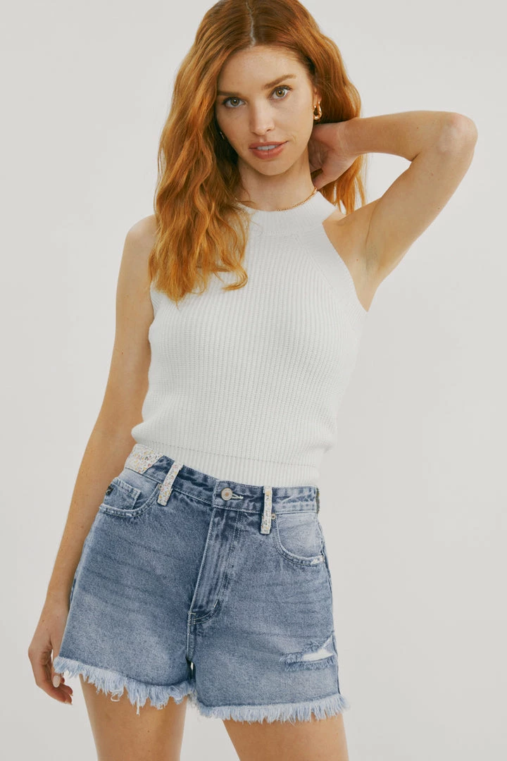 Create your next chic outfit with this pair of medium-washed shorts with floral detail on the belt loops, waistband, and upper left pocket. This piece comes with very subtle distress detail along with a trendy frayed hem for a more lived-in look. Comes in a classic short fit made with authentic non-stretch denim, a 5-pocket design, a single-button closure, and a zip fly.