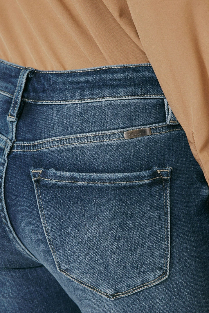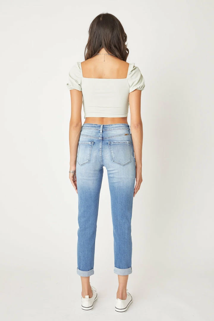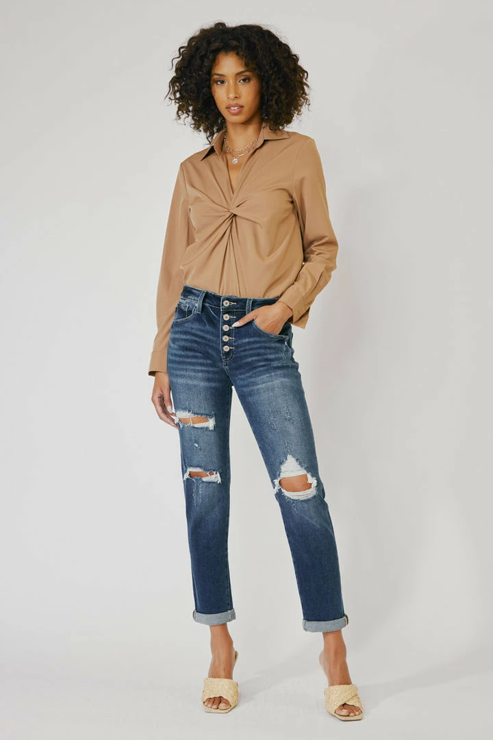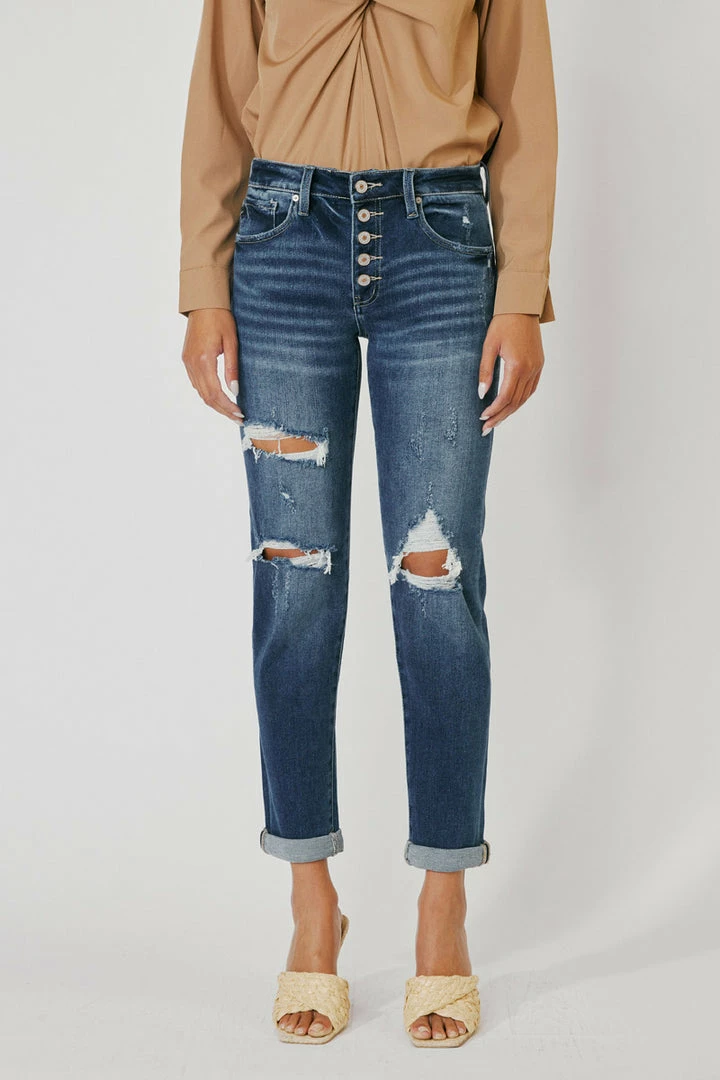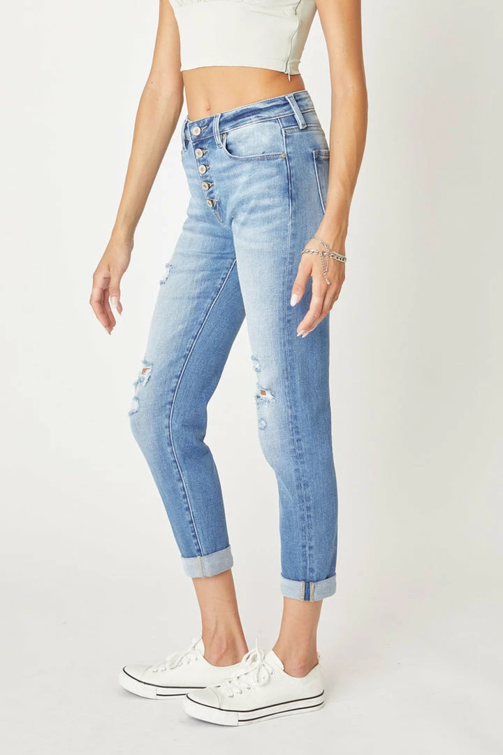 Our Cali Mid Rise Boyfriend Jeans come in dark, medium wash, and white featuring whiskering, and slight destruction on both legs. Sits right at the natural waistline as it relaxes down the leg revealing a relaxed silhouette. Made with comfort-stretch denim that holds its shape while allowing you to move with ease for comfortable wear all day long. Comes in a classic five-pocket design and four-button button-up closure. Finished with subtle contrast stitching and gold-colored hardware.