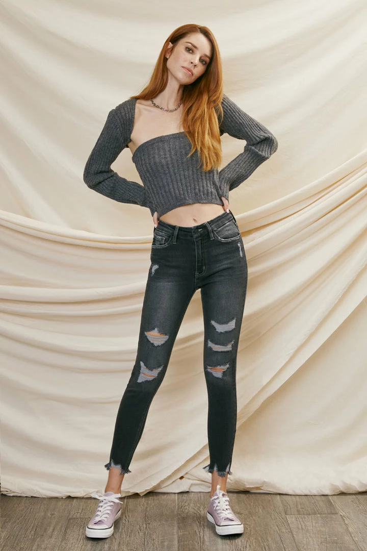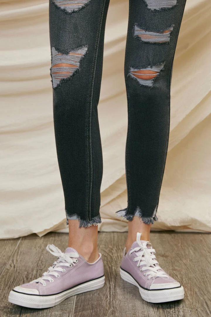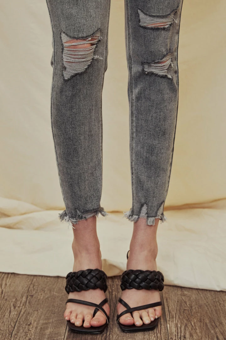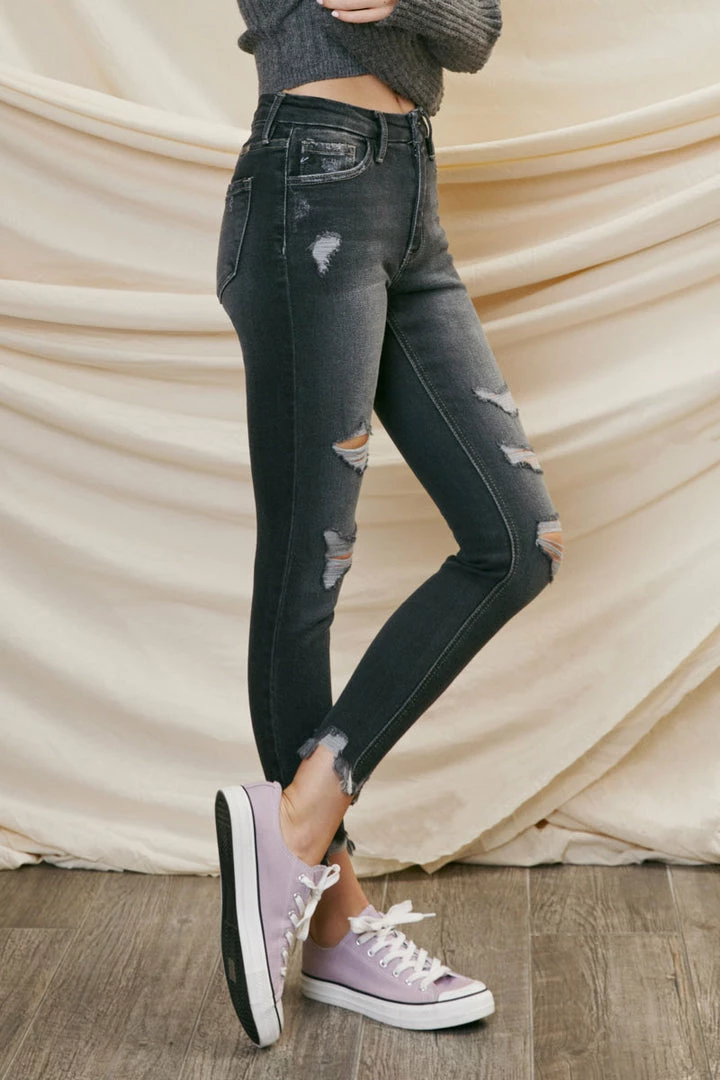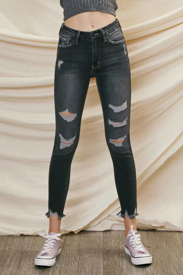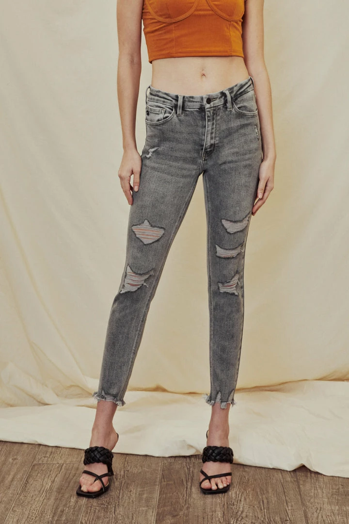 A light and dark washed grey denim jean with heavy destruction on both legs for an edgy, worn-in look. Our Calista High Rise Jeans come in a stretchably soft denim fabric that moves with you as it accentuates your every curve. Sits above the natural waistline as it tapers down the thigh and leg for a classic ankle skinny fit. Finished with a raw hem for a distinctly unique design. Features a five-pocket design, single-button front, and zip-fly closure.