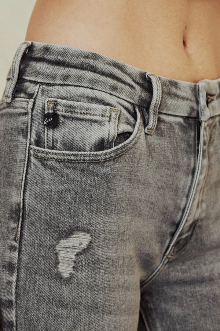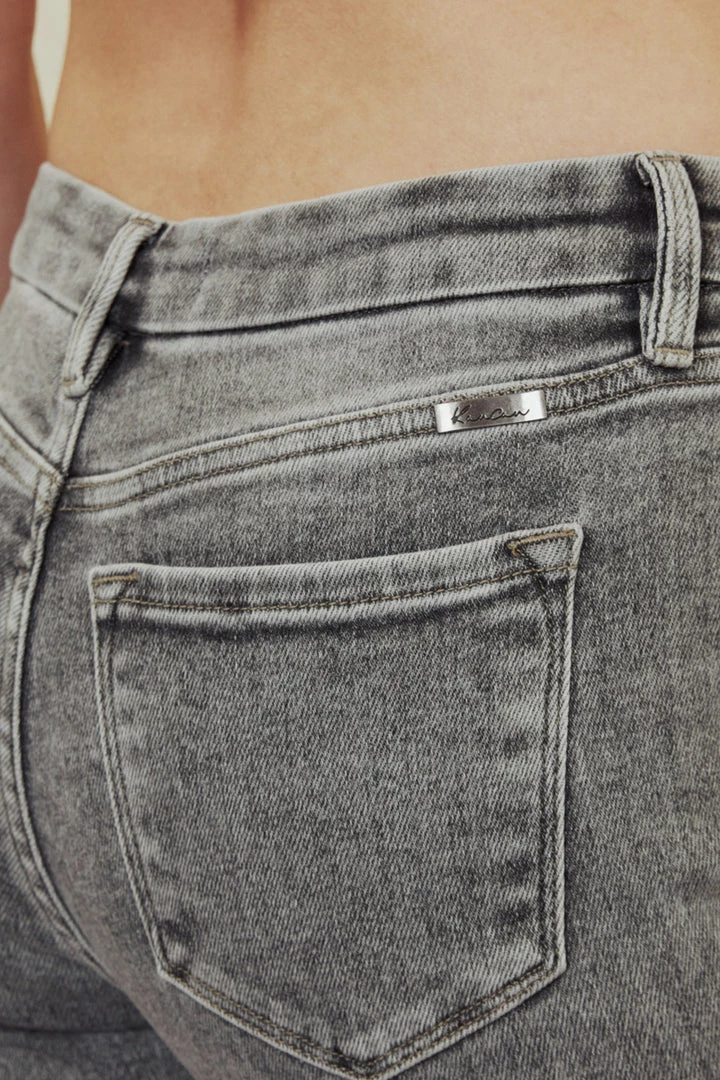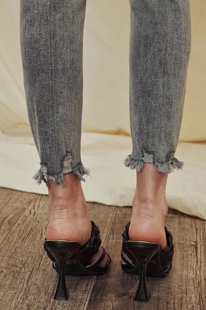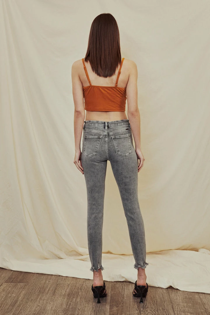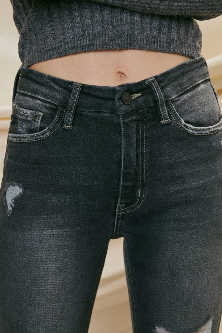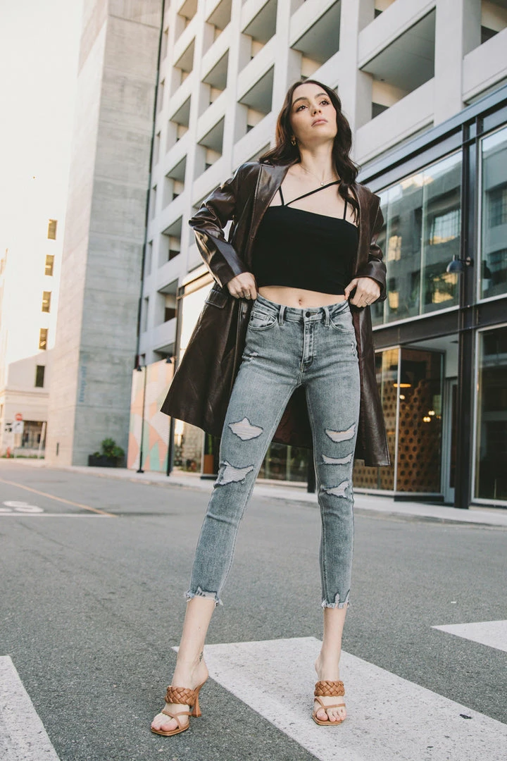 A light and dark washed grey denim jean with heavy destruction on both legs for an edgy, worn-in look. Our Calista High Rise Jeans come in a stretchably soft denim fabric that moves with you as it accentuates your every curve. Sits above the natural waistline as it tapers down the thigh and leg for a classic ankle skinny fit. Finished with a raw hem for a distinctly unique design. Features a five-pocket design, single-button front, and zip-fly closure.