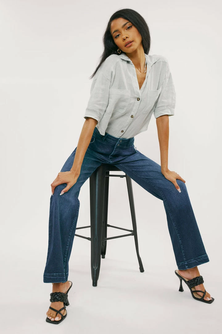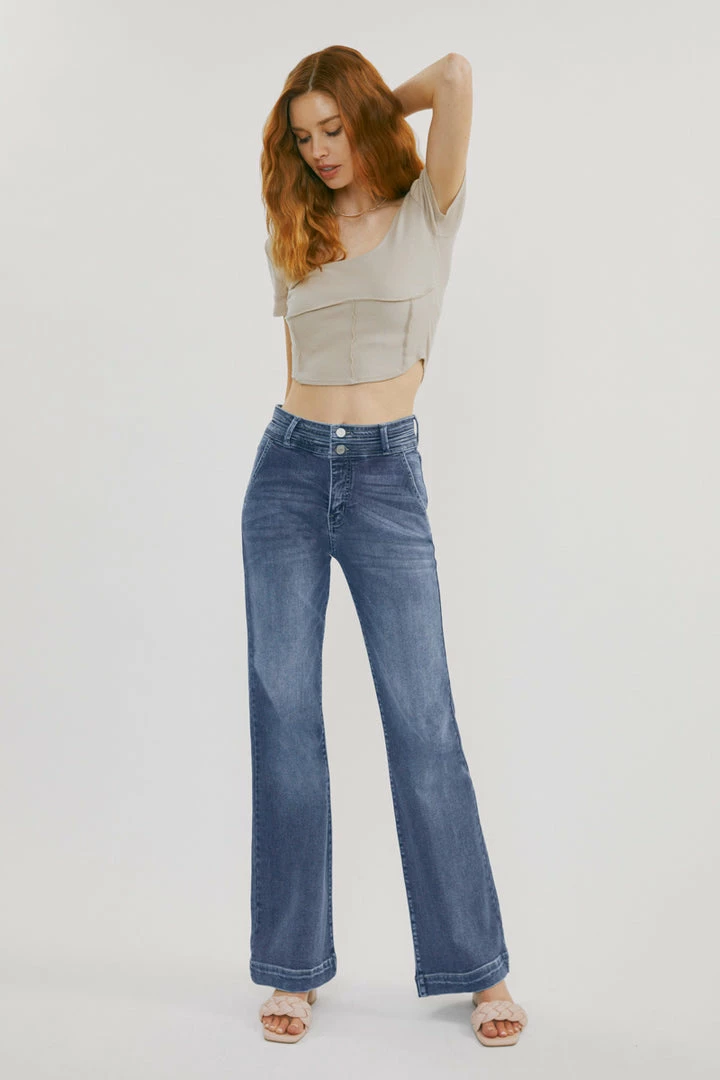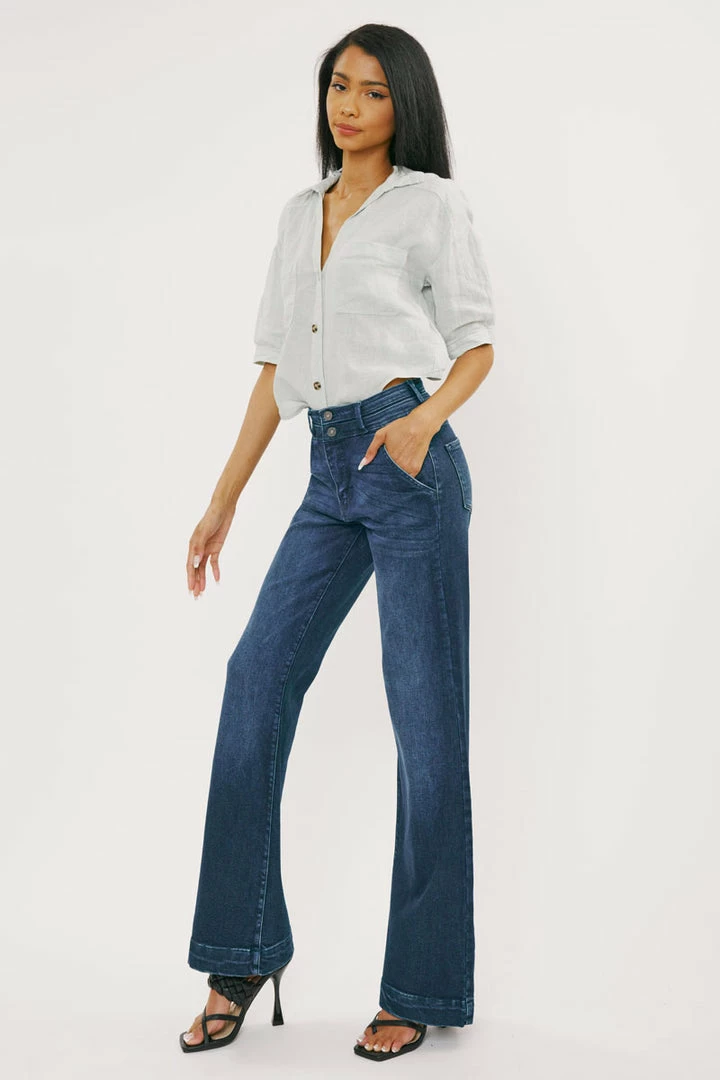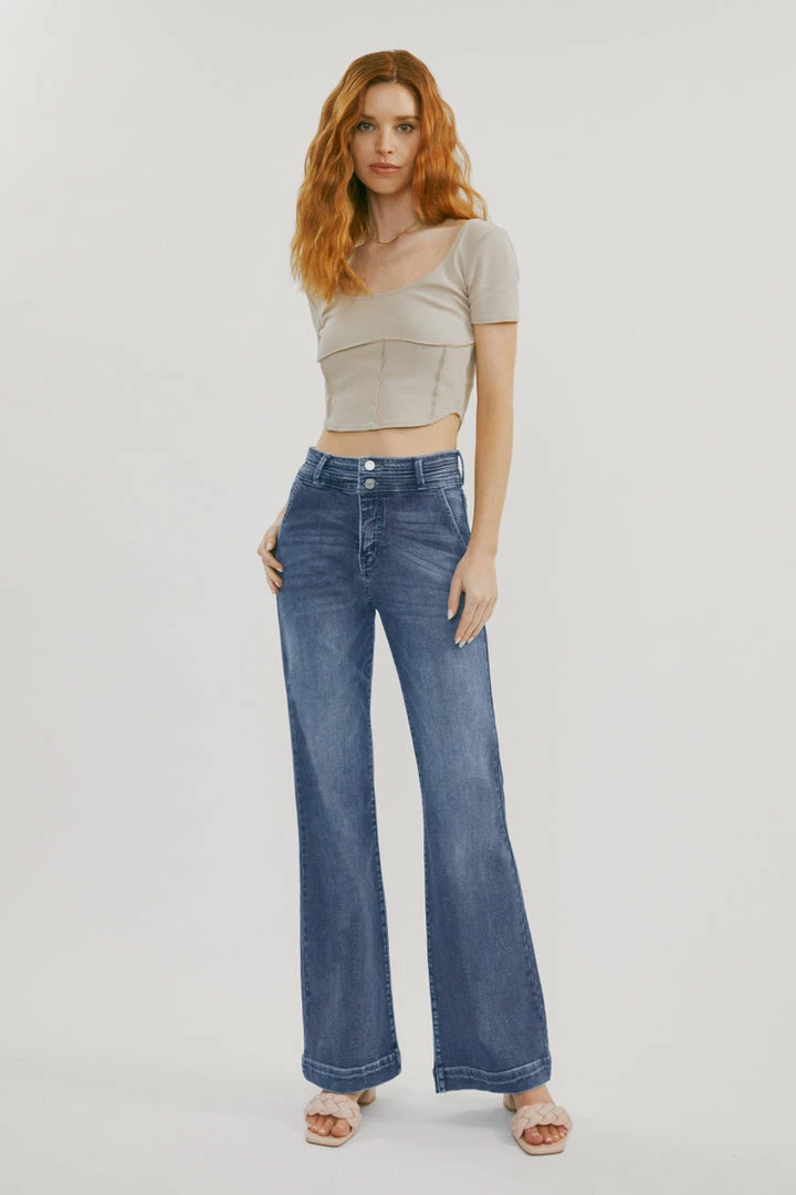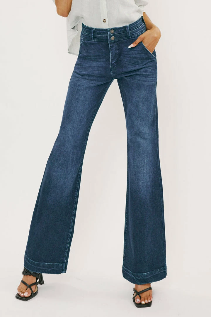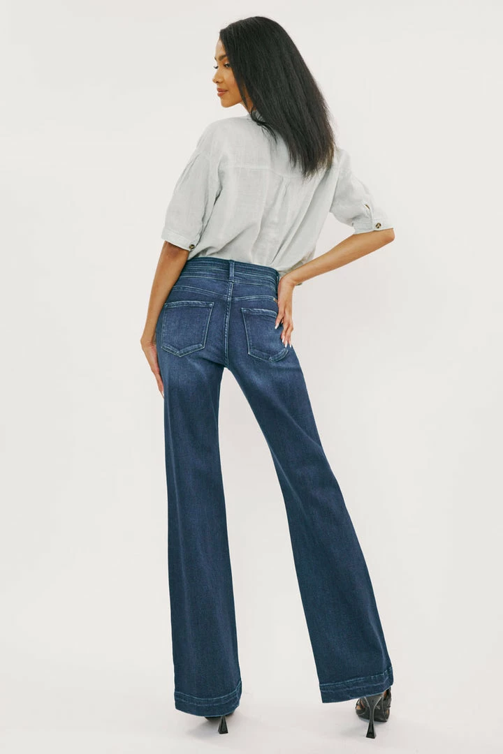 Our Carlyle High Rise Flare Jeans come in lightly faded denim with whisker details and a contrasting trim detail along the hems. Sits high above the natural waistline as it flares out down the leg with a classic wide-leg flare fit. Made with stretch-stretch denim that holds its shape while giving you a classic denim feel. Features a 4-pocket design with front slanted pockets, a double-button front closure, and a zip-fly.