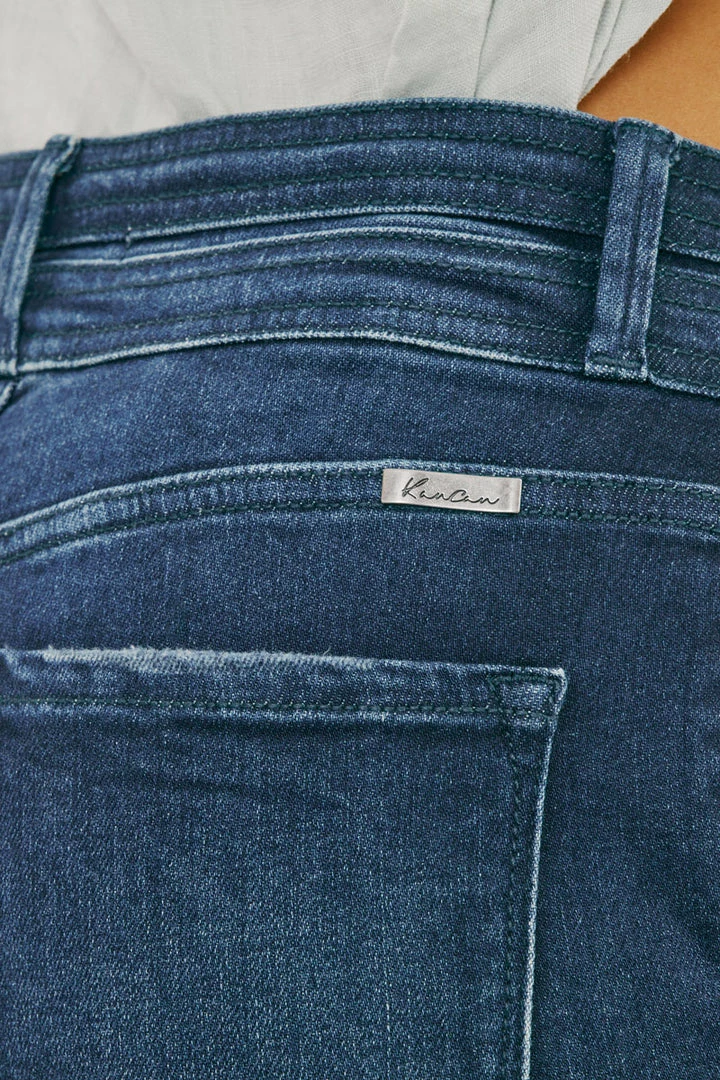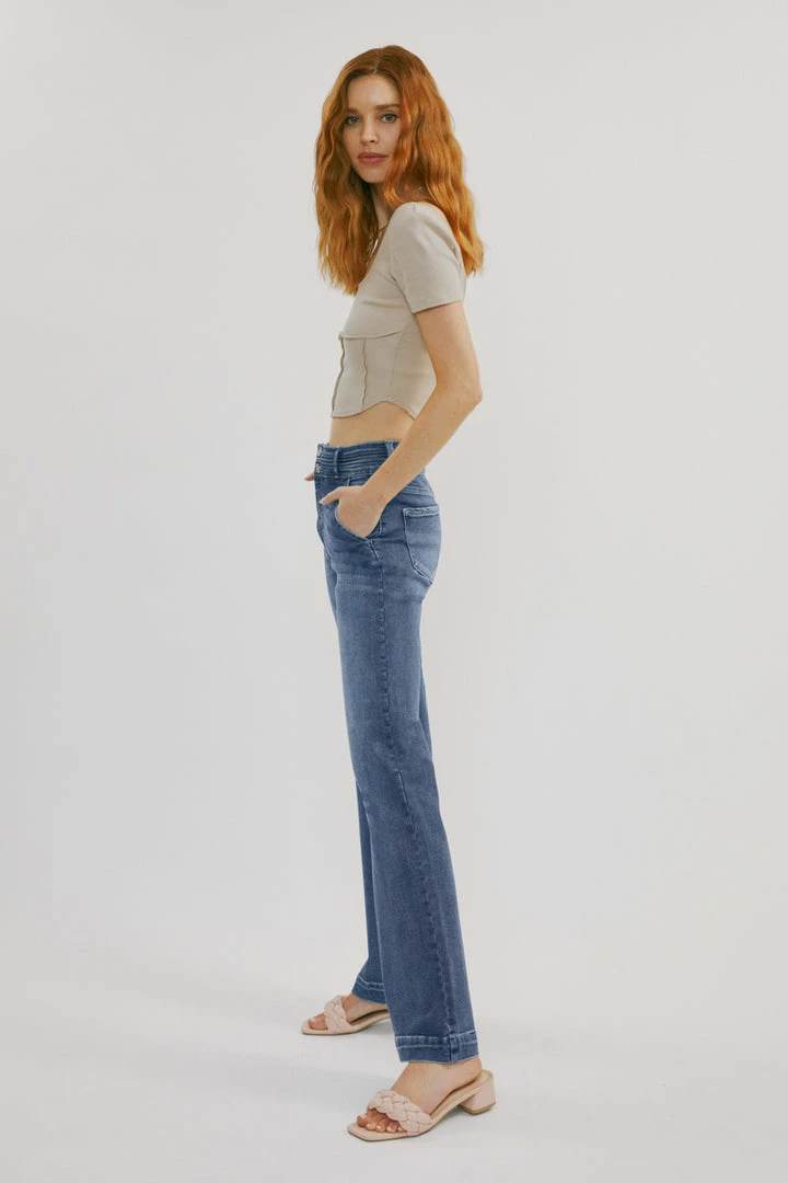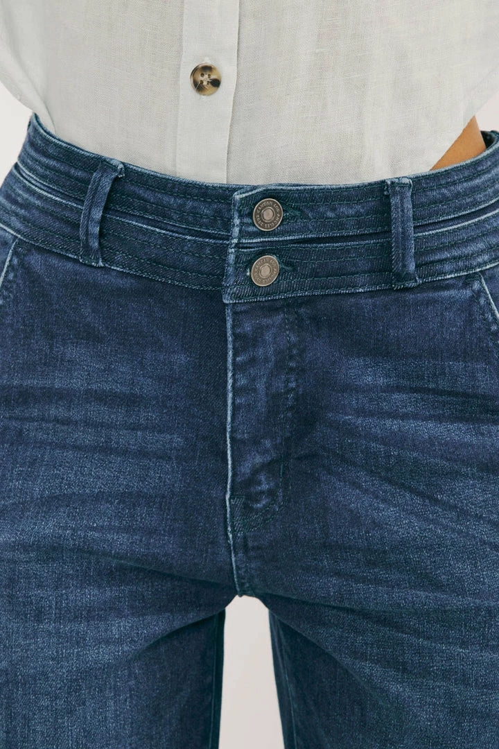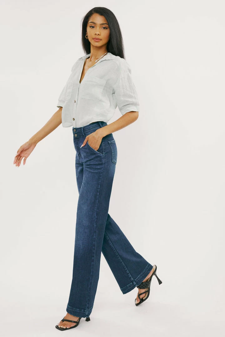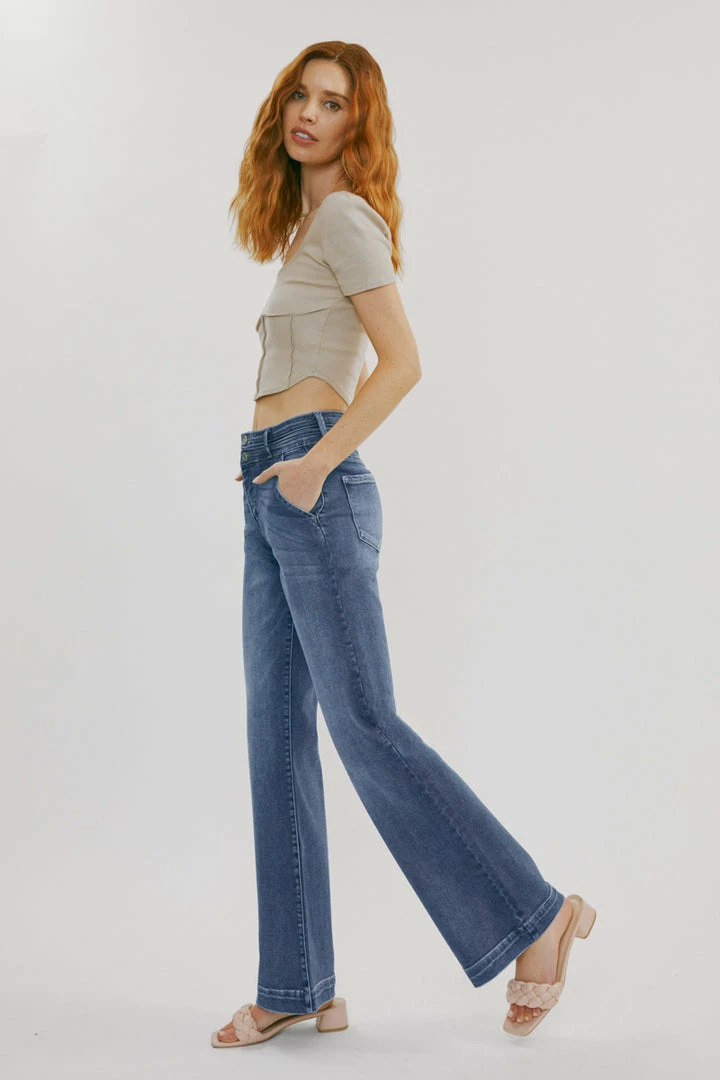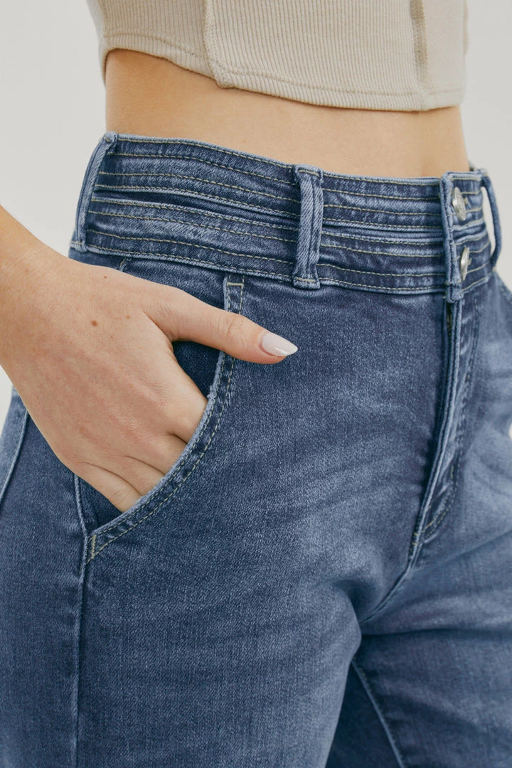 Our Carlyle High Rise Flare Jeans come in lightly faded denim with whisker details and a contrasting trim detail along the hems. Sits high above the natural waistline as it flares out down the leg with a classic wide-leg flare fit. Made with stretch-stretch denim that holds its shape while giving you a classic denim feel. Features a 4-pocket design with front slanted pockets, a double-button front closure, and a zip-fly.
