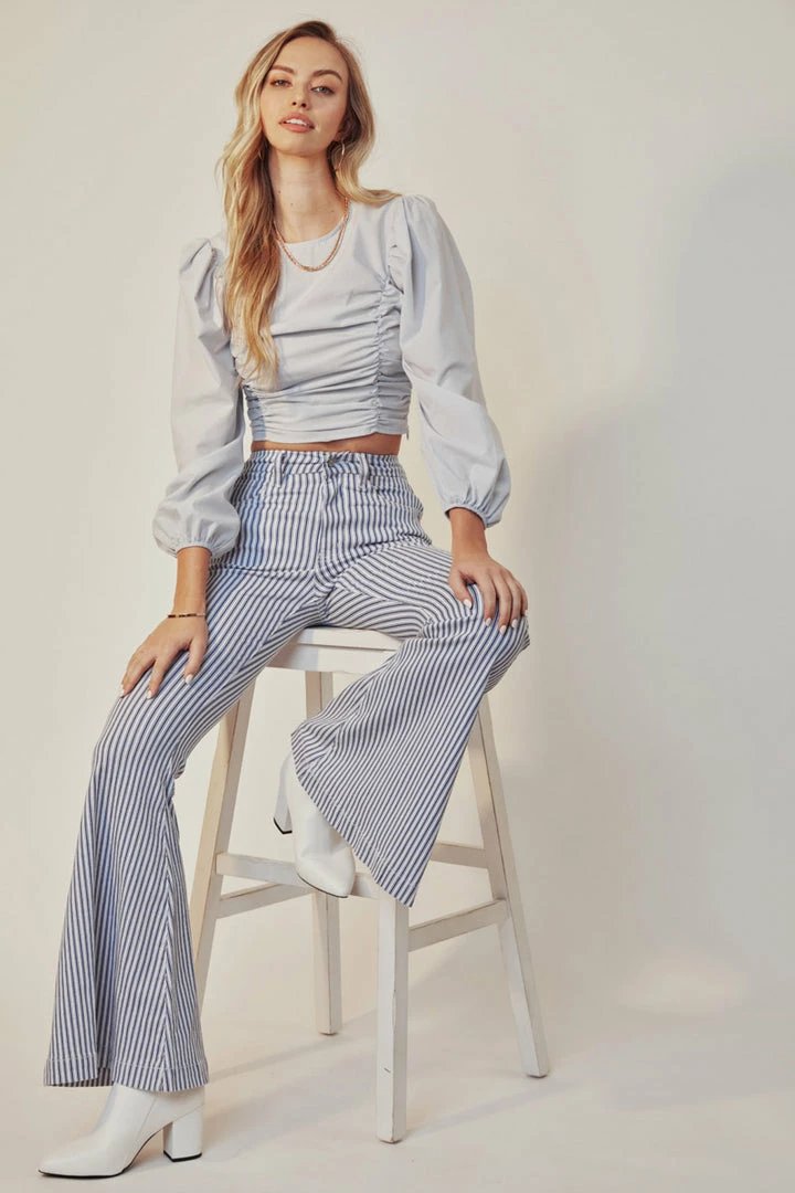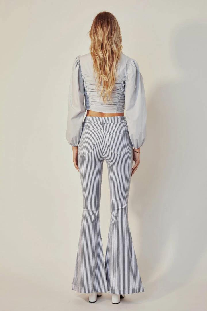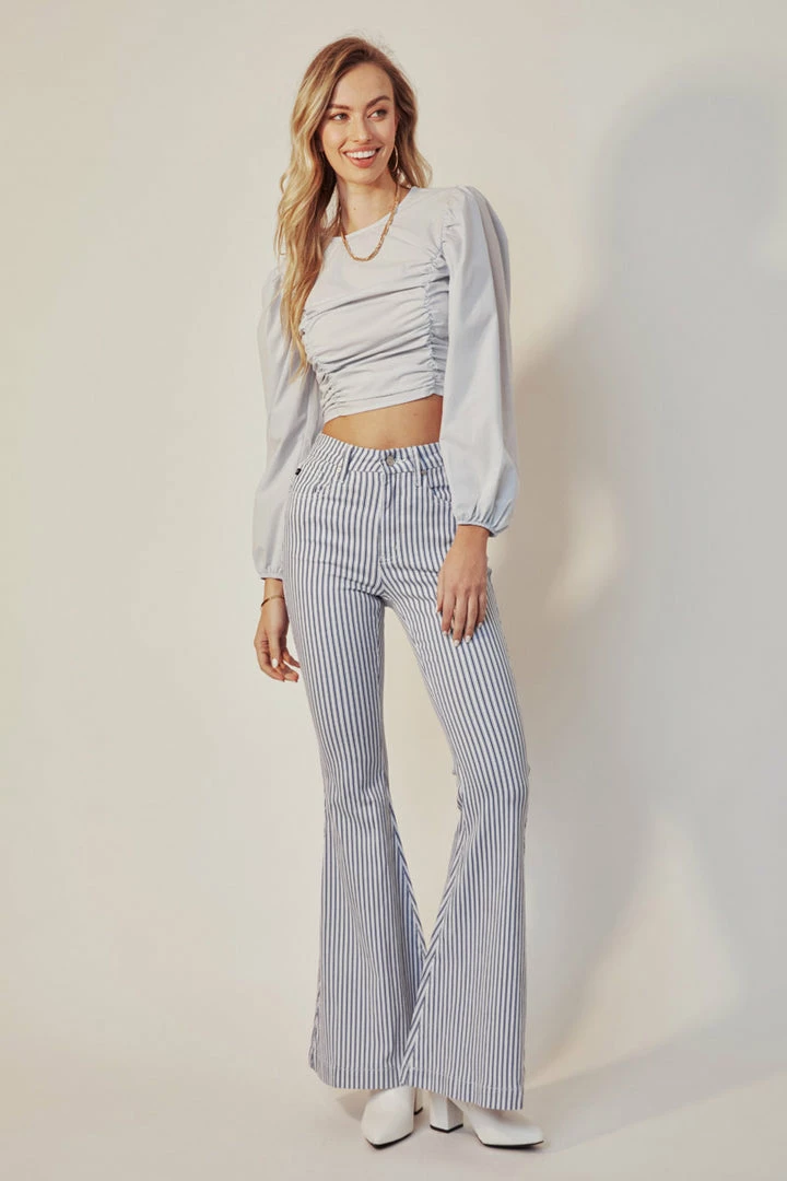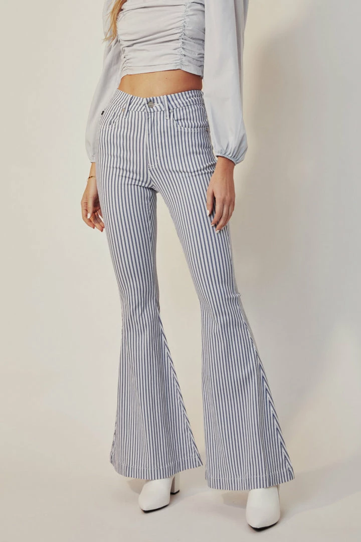 Our Carmen High Rise Super Flare has got you covered on chic and stylish. This striped super flare shows a lined pattern that accentuates the curves from your body figure. Made with stretch denim that moves with your body as it maintains its shape even after multiple wears. Features a classic five-pocket design, silver-colored hardware, single-button front, and zip-fly closure.