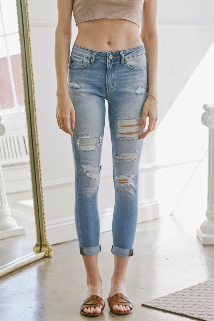 Medium washed form-fitting ankle-length skinny featuring light fading, whiskering, heavy distress throughout, and cuffed hem.