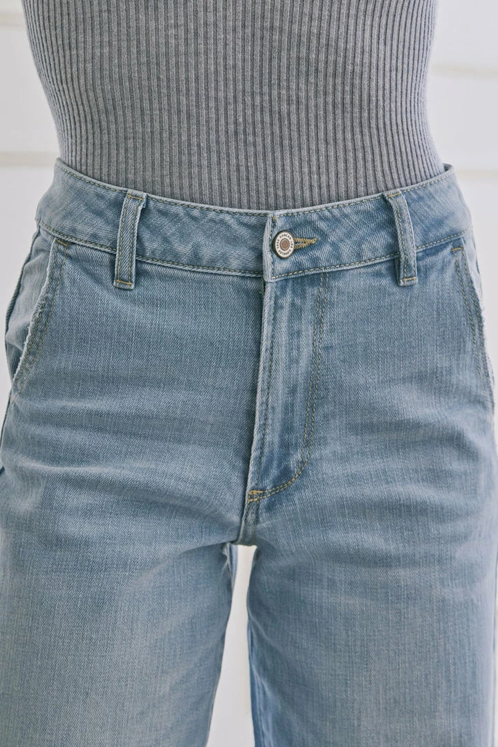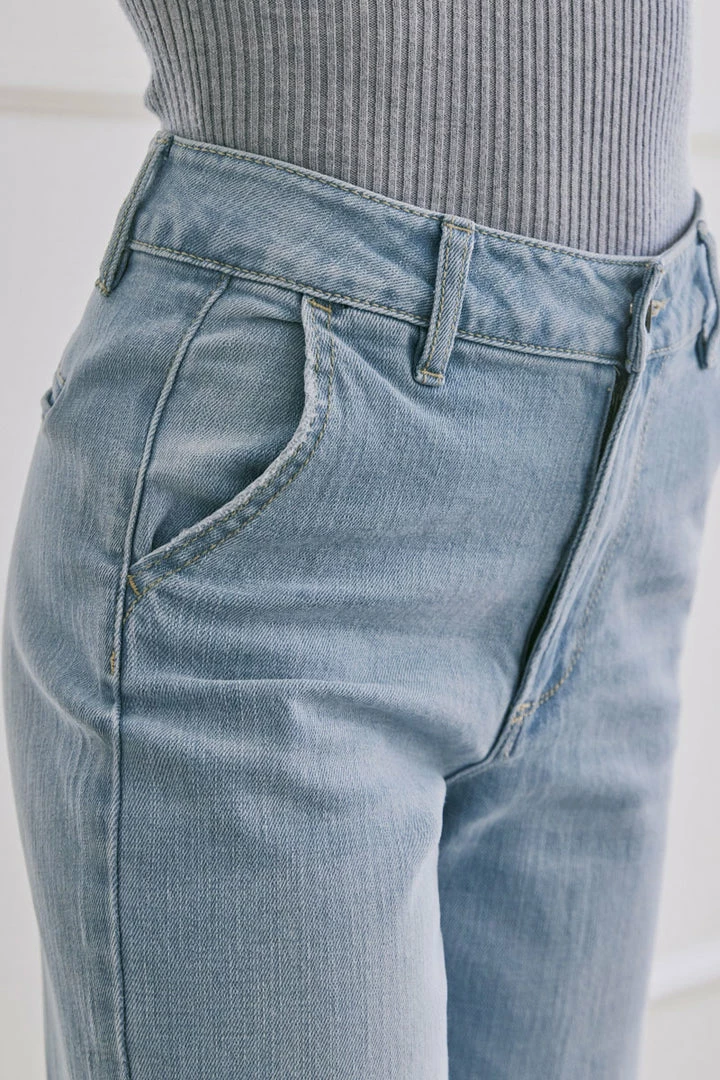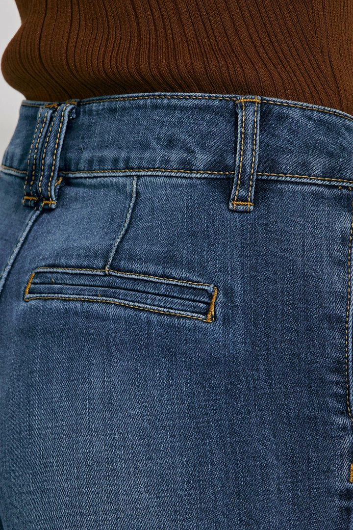 - Single-button front closure, Zip fly, 2 front and 2 back faux welt pockets