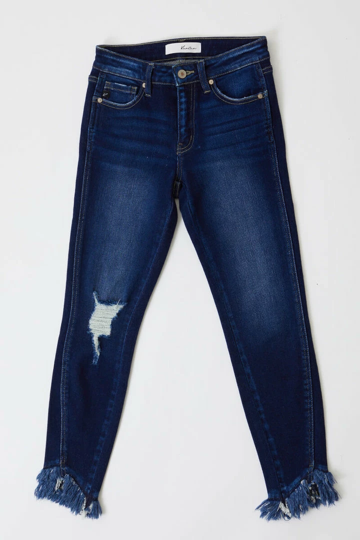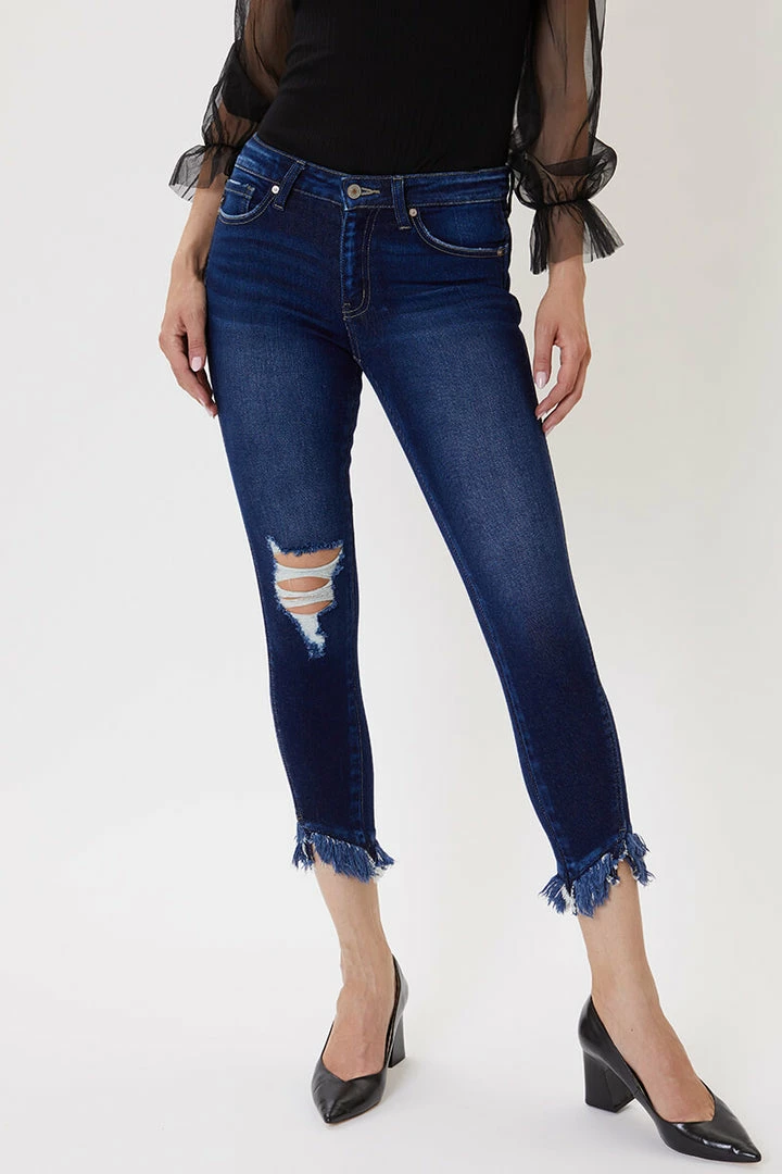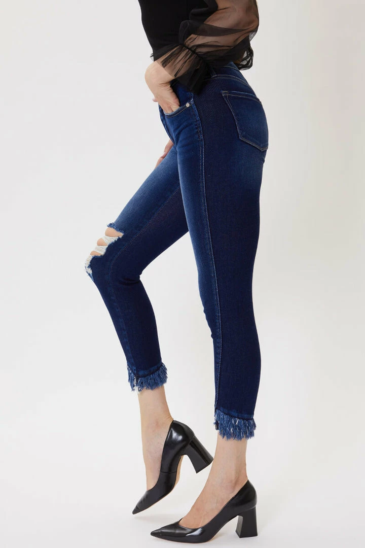 Bring out the fun with this pair of dark wash ankle skinny jeans! Featuring distressed detailing on the right knee, frayed hem, whiskering, and a 5-pocket design with zip fly.