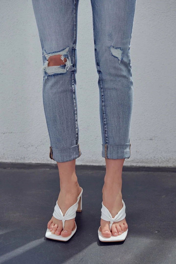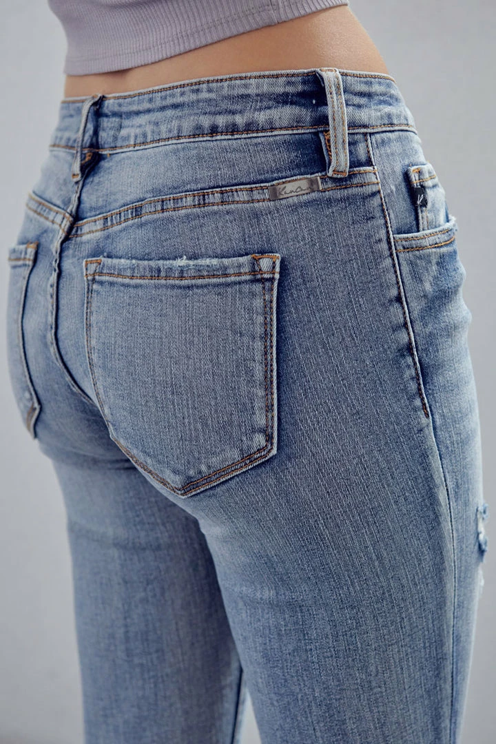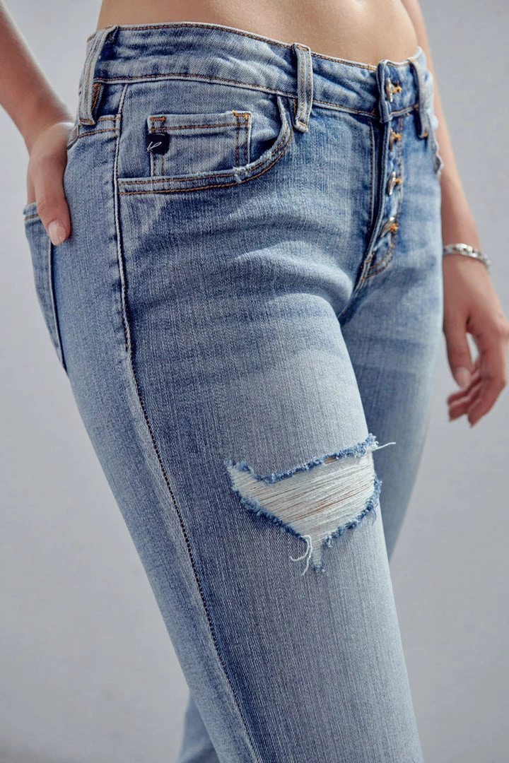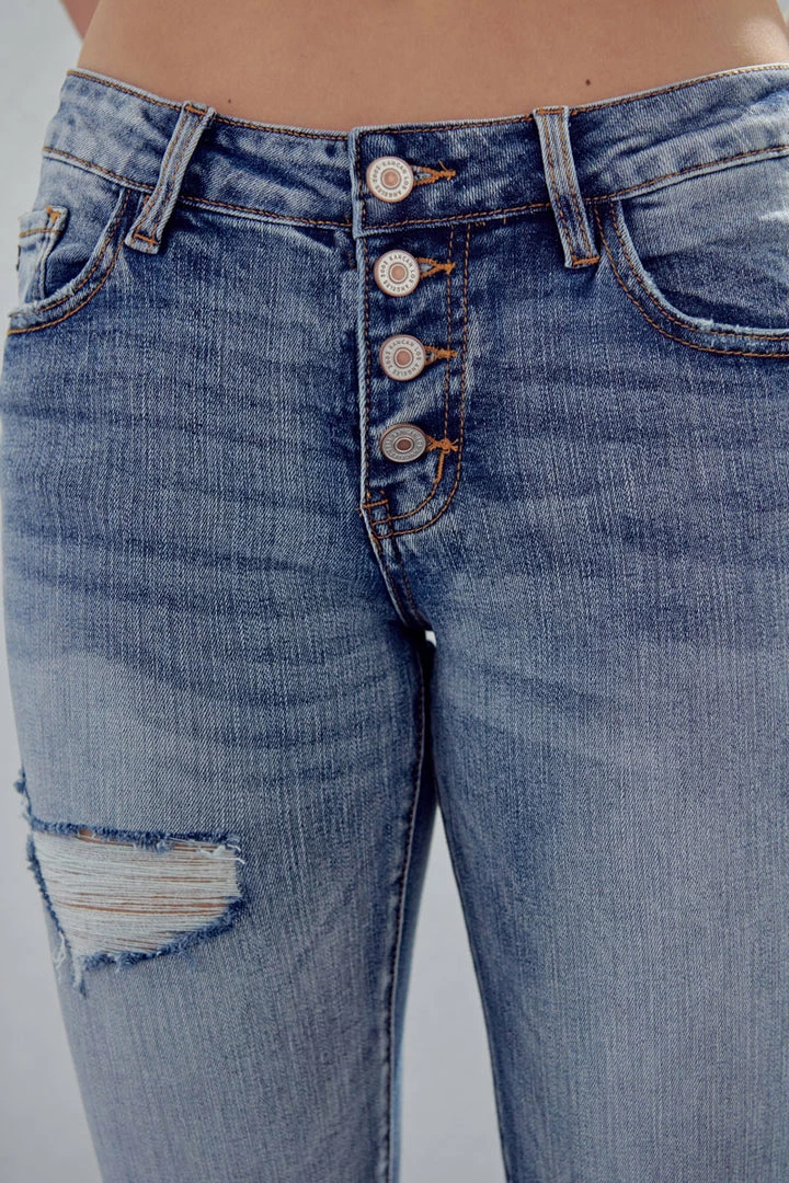 Our Clarie Mid Rise Boyfriend Jeans feature a washed-out medium blue tone with marbled detail, whiskering, and slight destruction on both legs. Sits right at the natural waistline as it relaxes down the leg revealing a relaxed silhouette. Made with comfort-stretch denim that holds its shape while allowing you to move with ease for comfortable wear all day long. Comes in a classic five-pocket design and four-button button-up closure along with a cuffed hem to give it a more casual feel. Finished with subtle contrast stitching and gold-colored hardware.