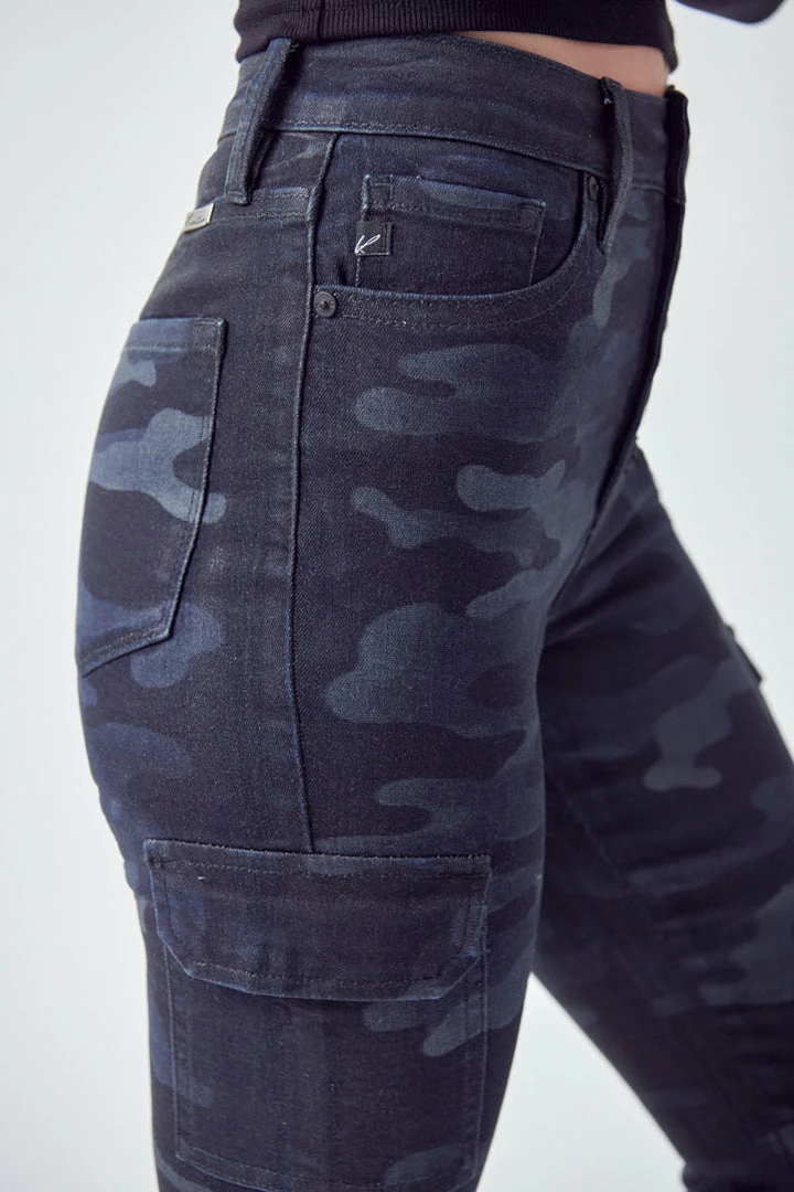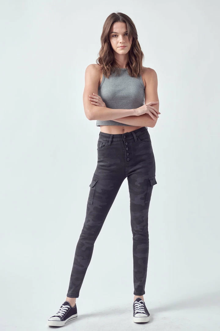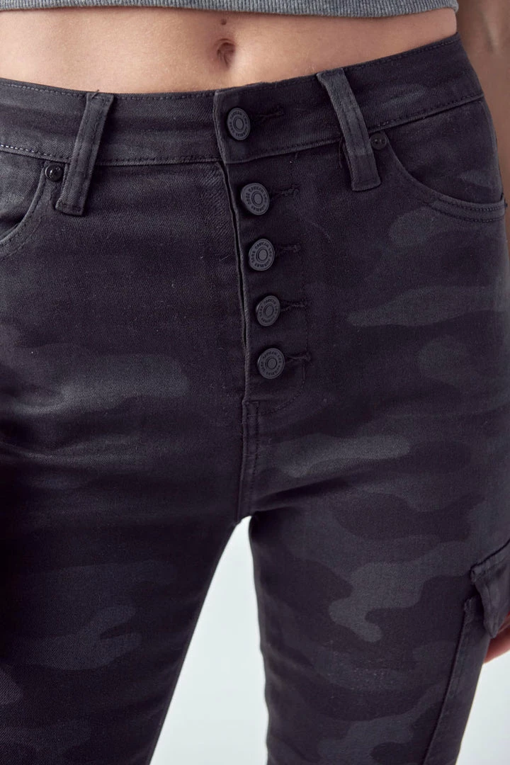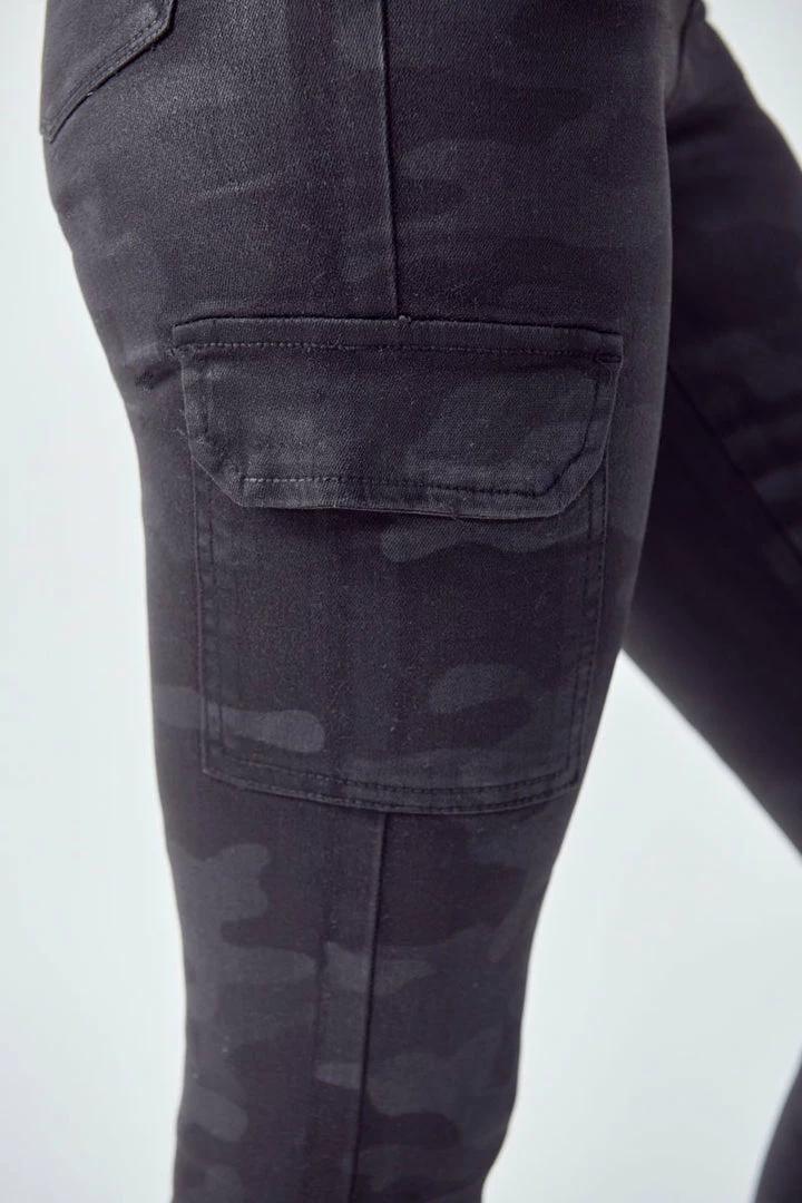 Show off your sleek yet trendy style with this pair of high-rise coated super skinny jeans featuring camo print available in black or blue. These coated jeans come in a classic skinny jean fit along with a 5- pocket design, a 5-button closure with black hardware.Â