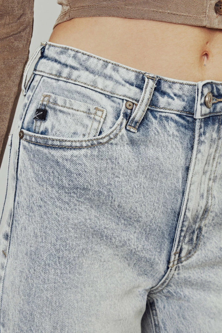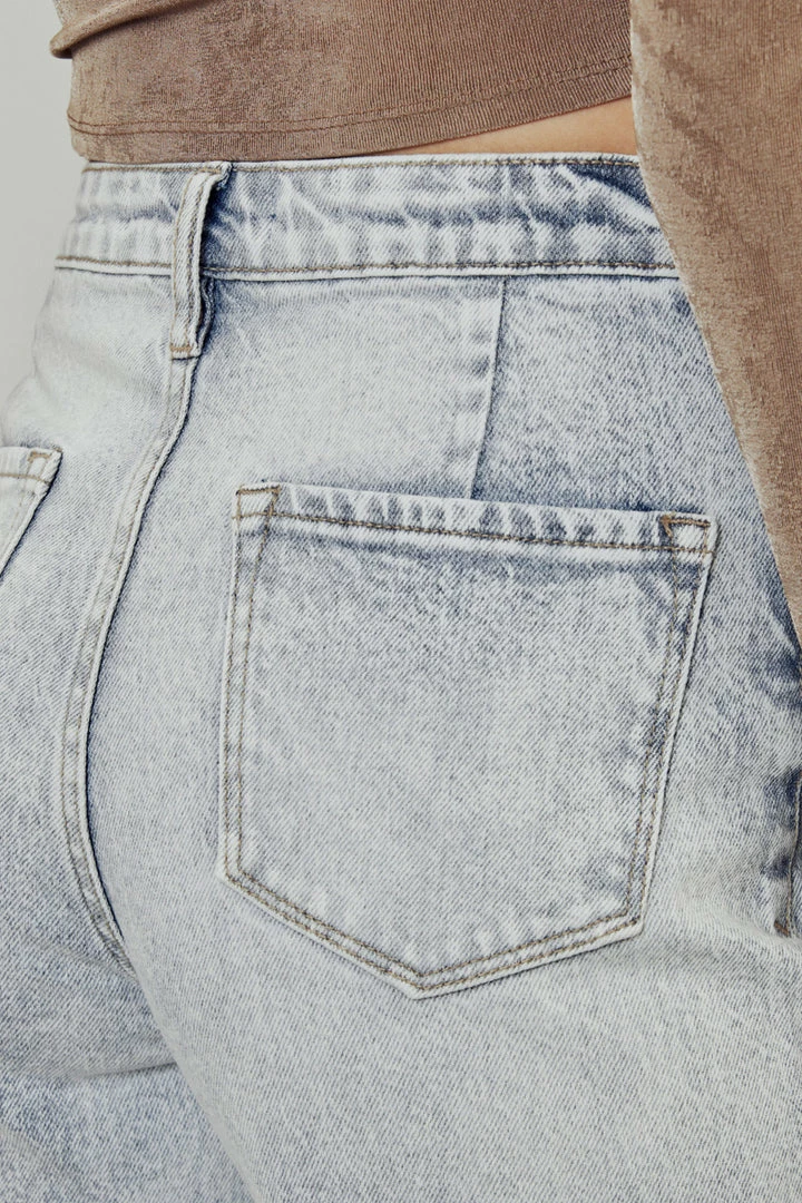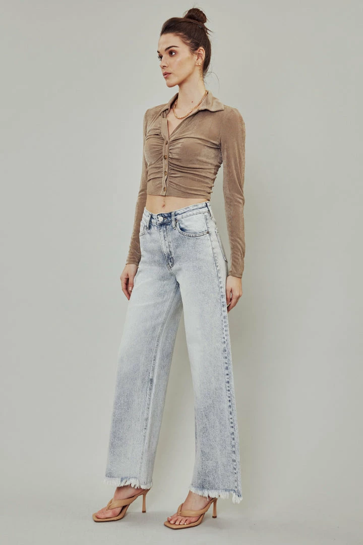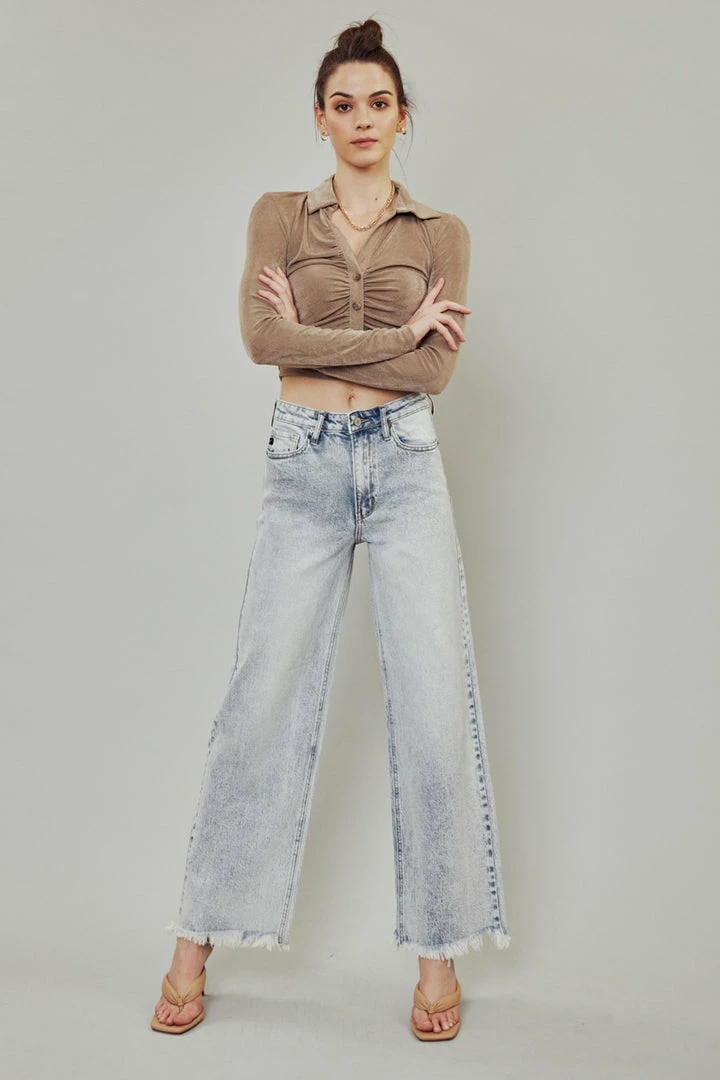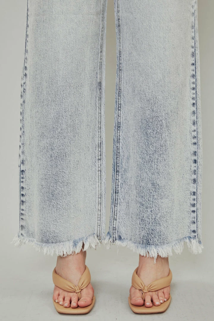 These Colbie wide-legged pants will be your next favorite denim fit. Fitted just above the waistline the pants flare out at the hips for that perfect silhouette look. Features a raw edged hem, back darts, light blue fading, 5-pocket style, and zip fly.