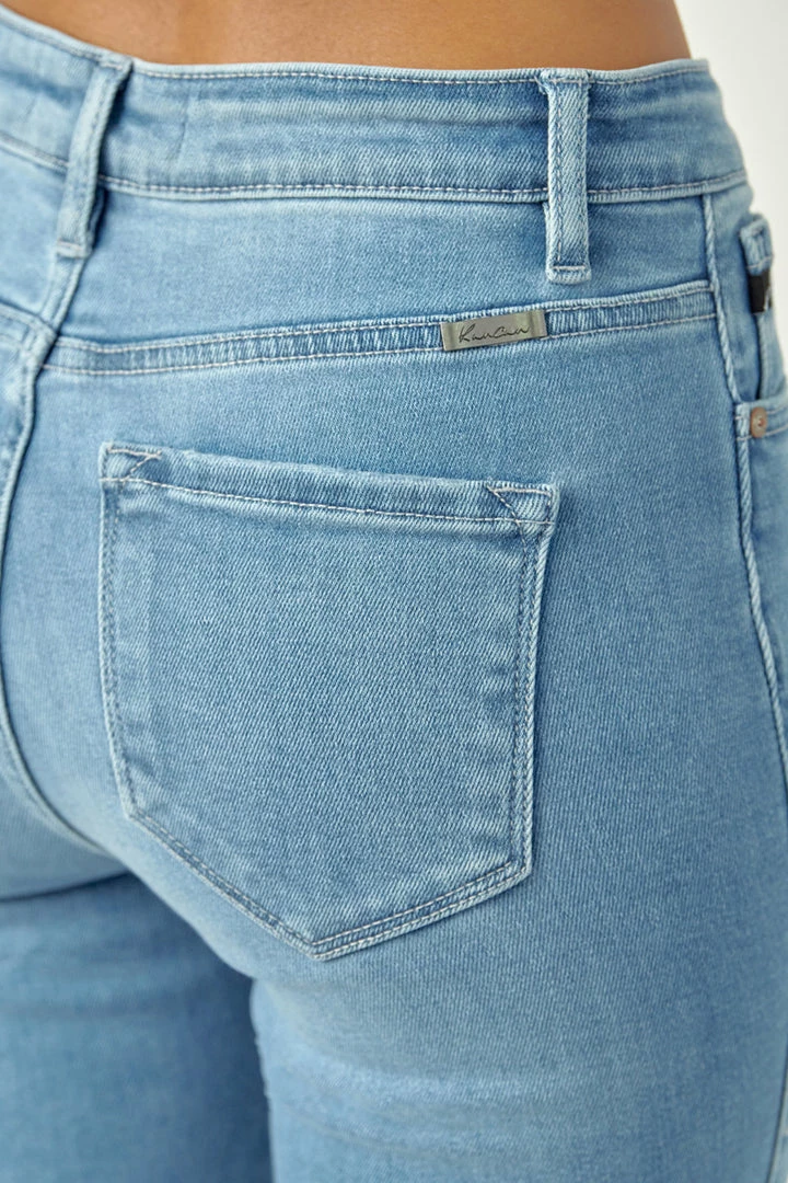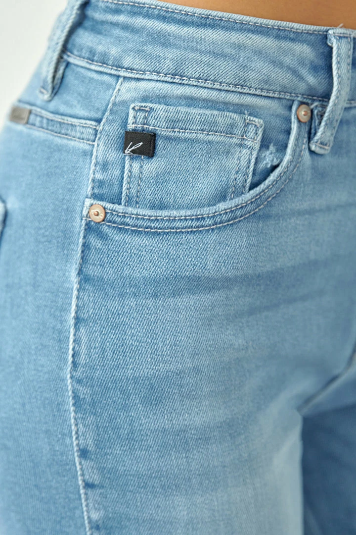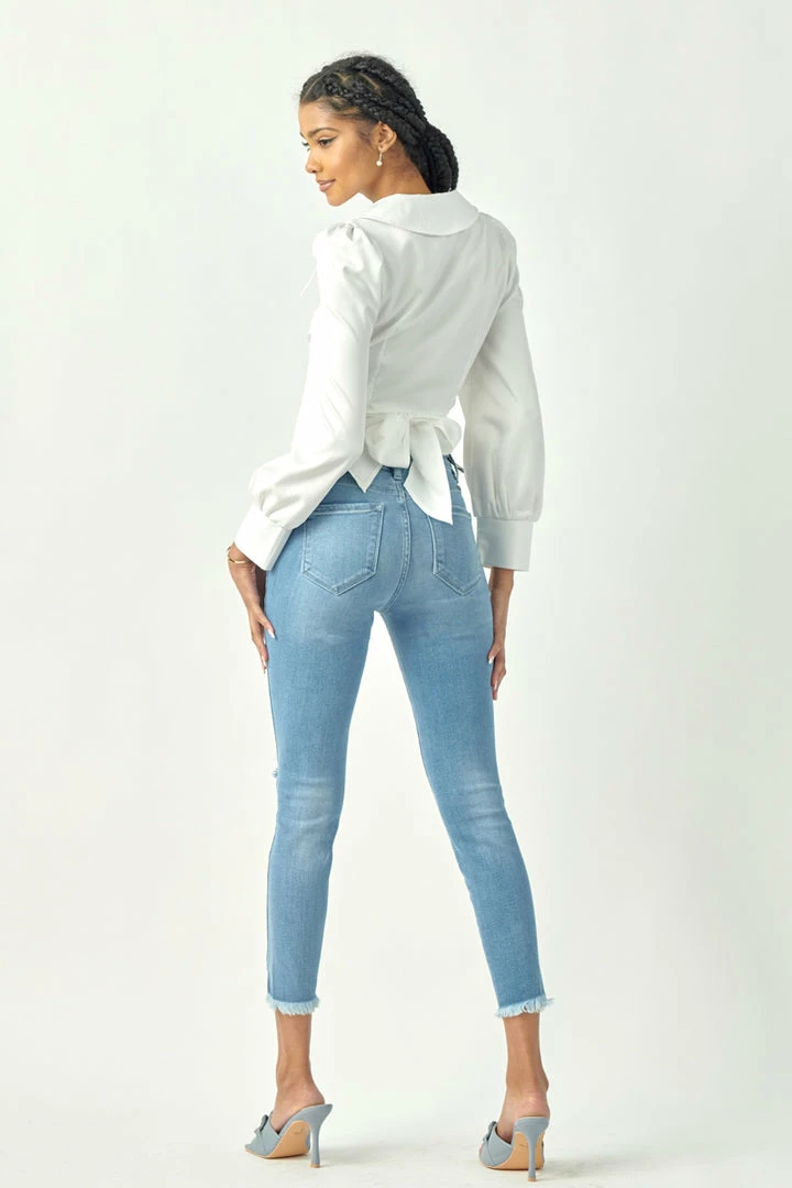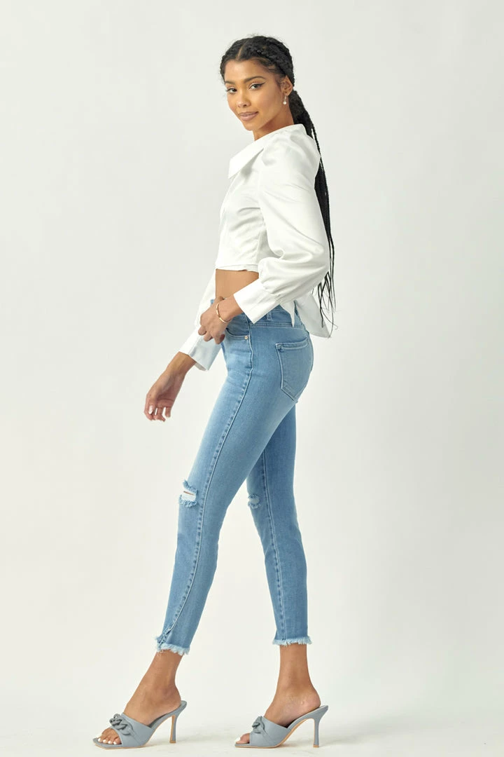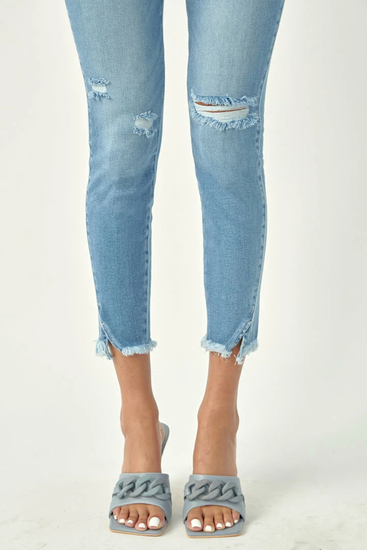 Our Courtney jean features a faded medium blue wash complete with distress on both knees and a uniquely frayed hem with a stylish accent. Sitting above the waist with a classic ankle skinny fit, it’s a denim staple everyone needs in their closet.