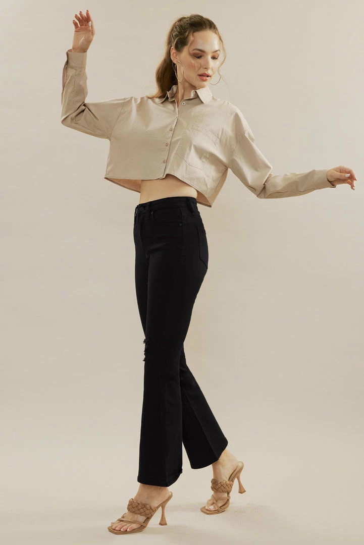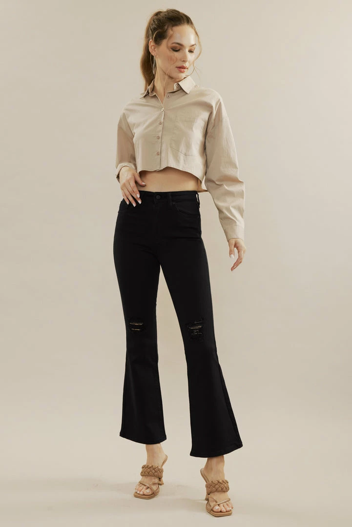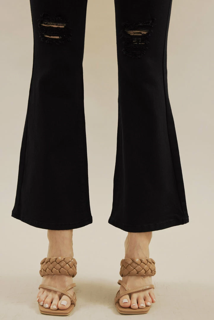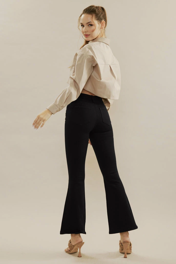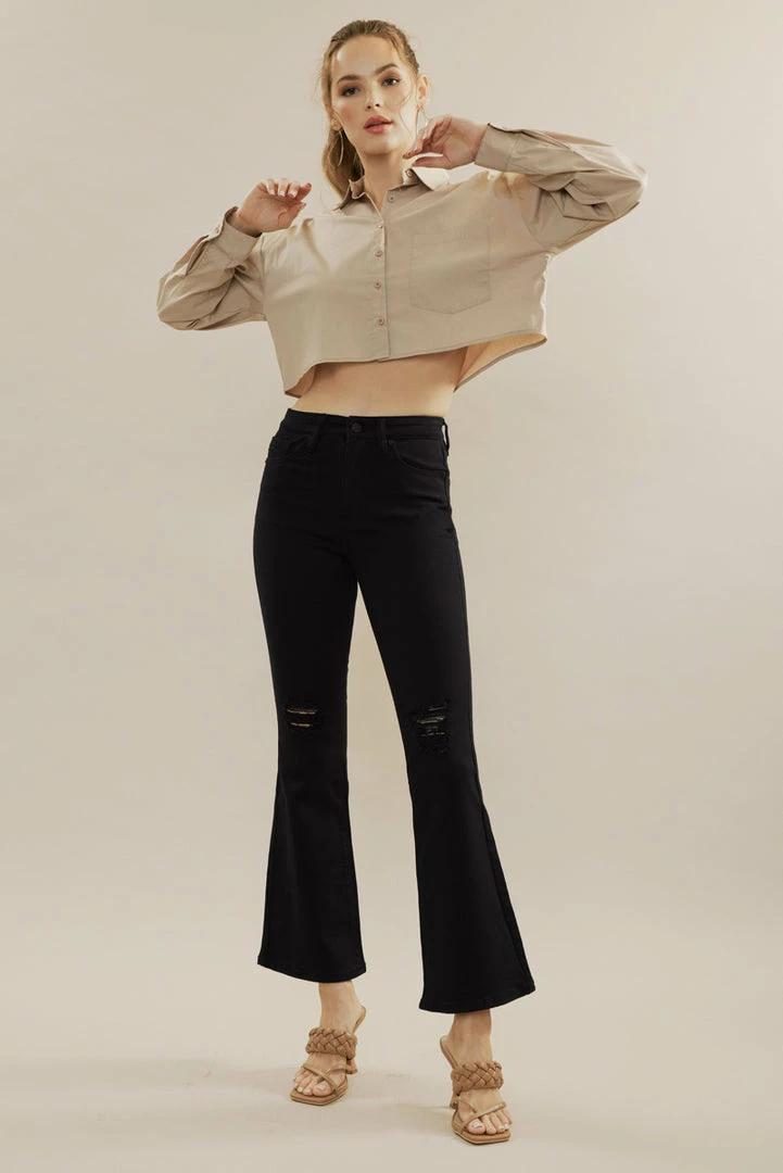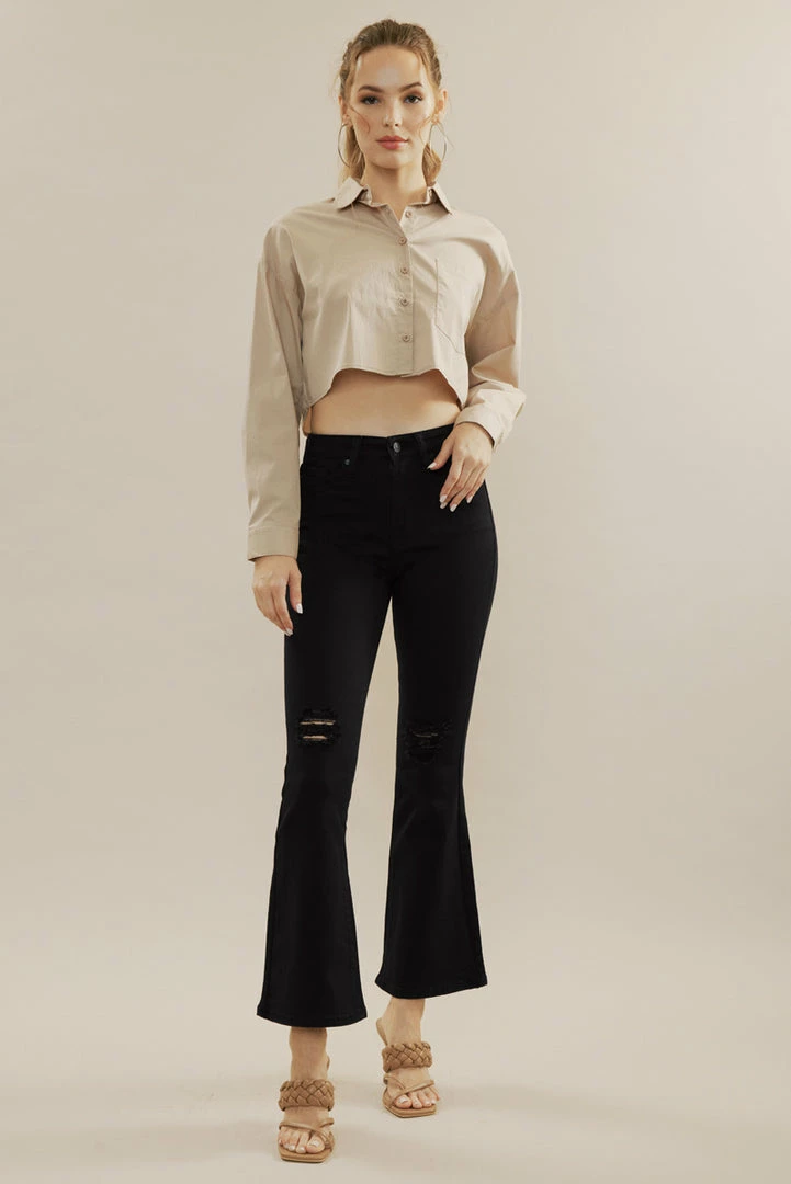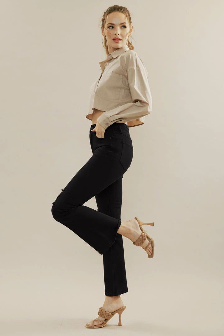 Cropped bootcut jeans with a modern trendy vibe available in crisp white and black. Featuring waist-accentuating fit, mild fading, whiskering, and unique uneven scattered hem.
