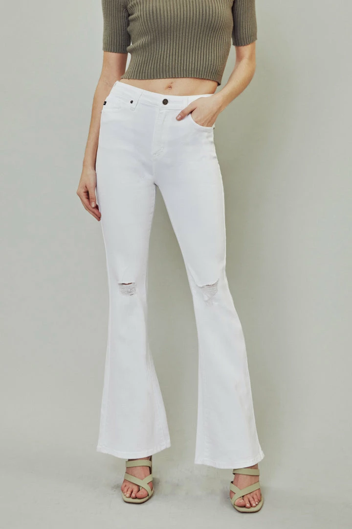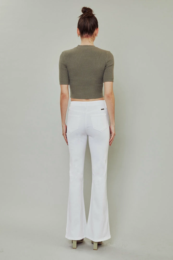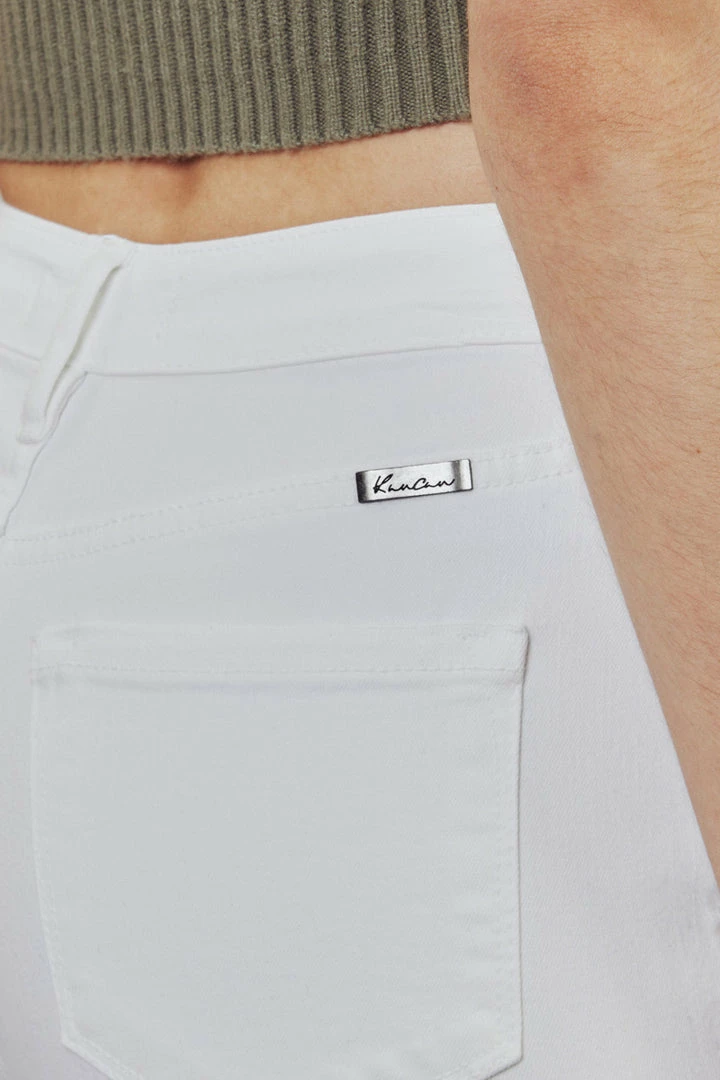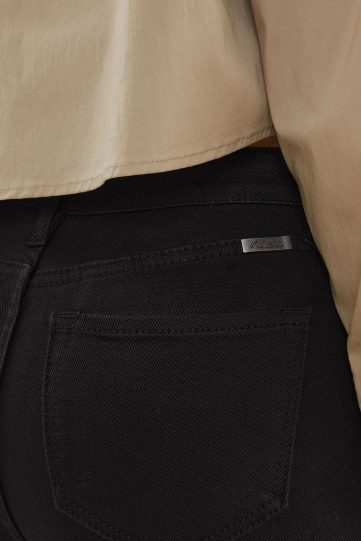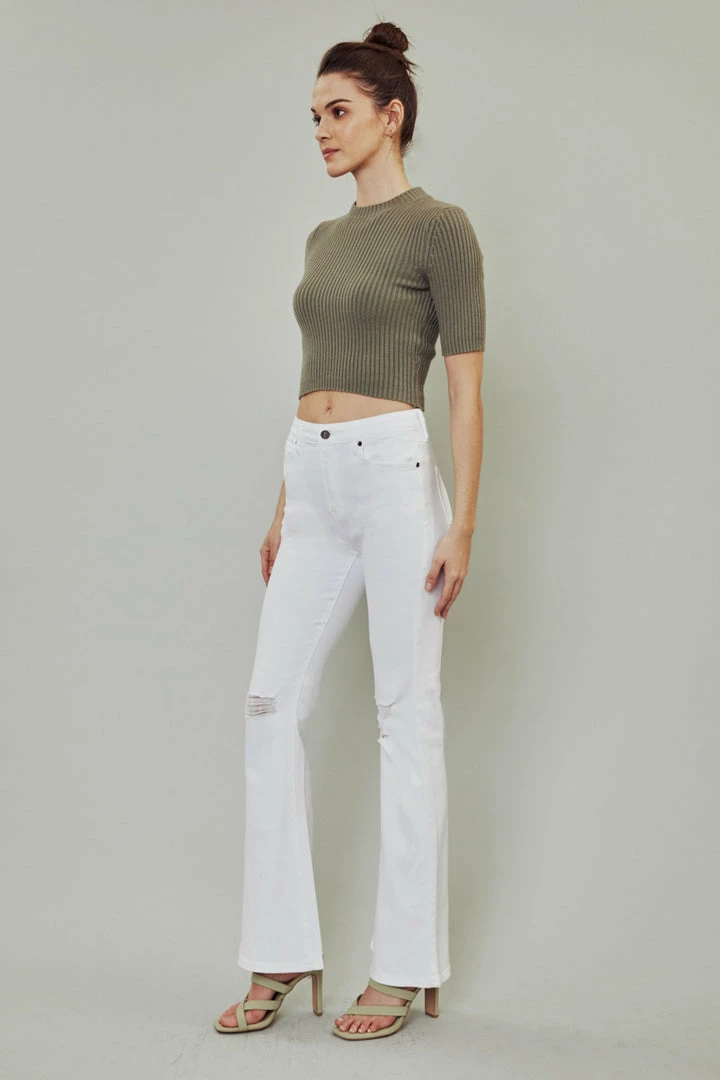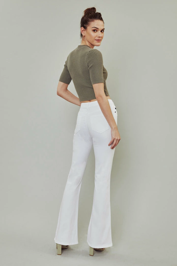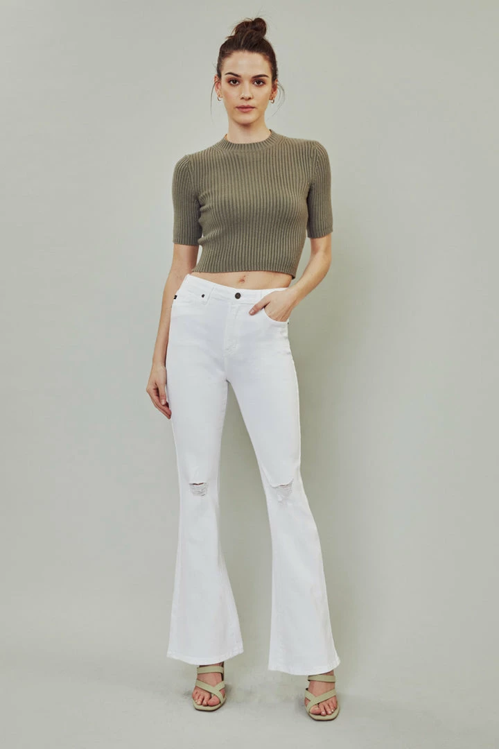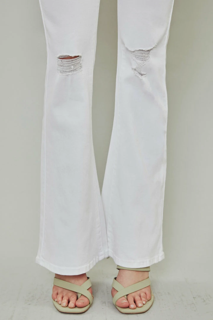 Cropped bootcut jeans with a modern trendy vibe available in crisp white and black. Featuring waist-accentuating fit, mild fading, whiskering, and unique uneven scattered hem.