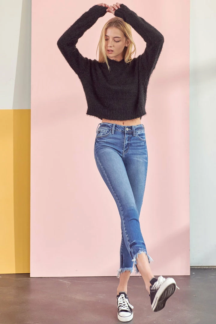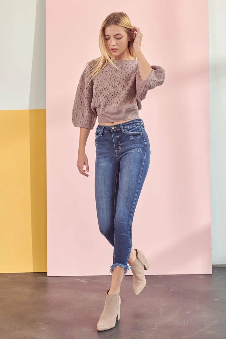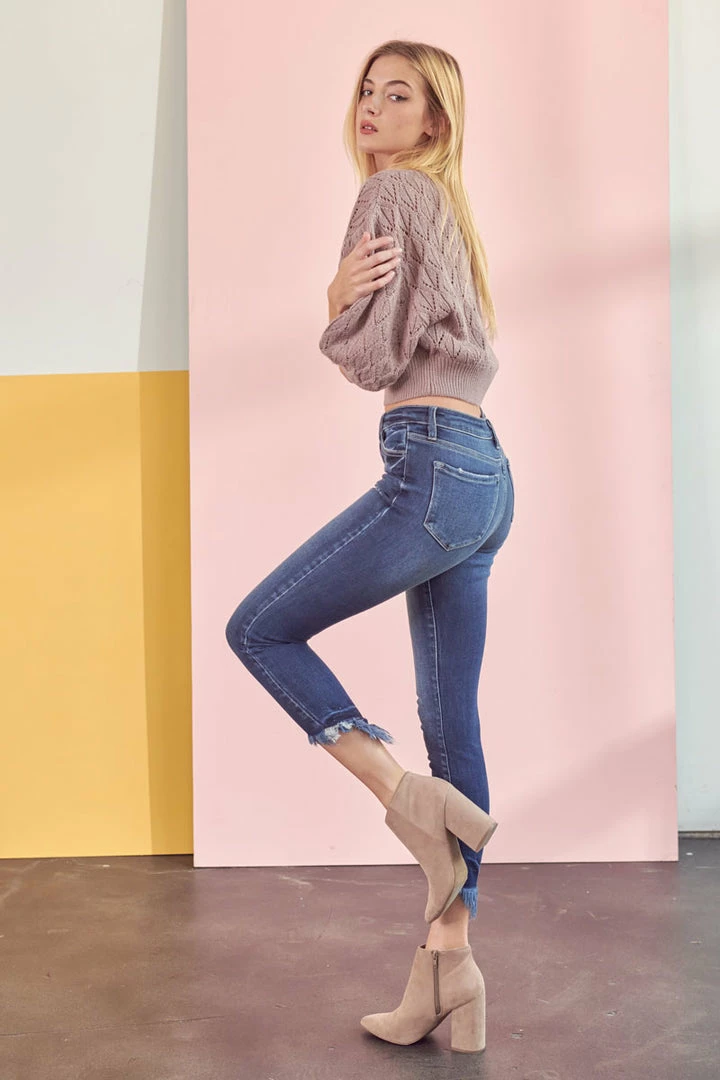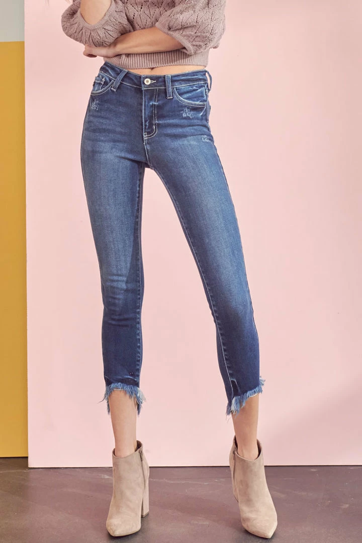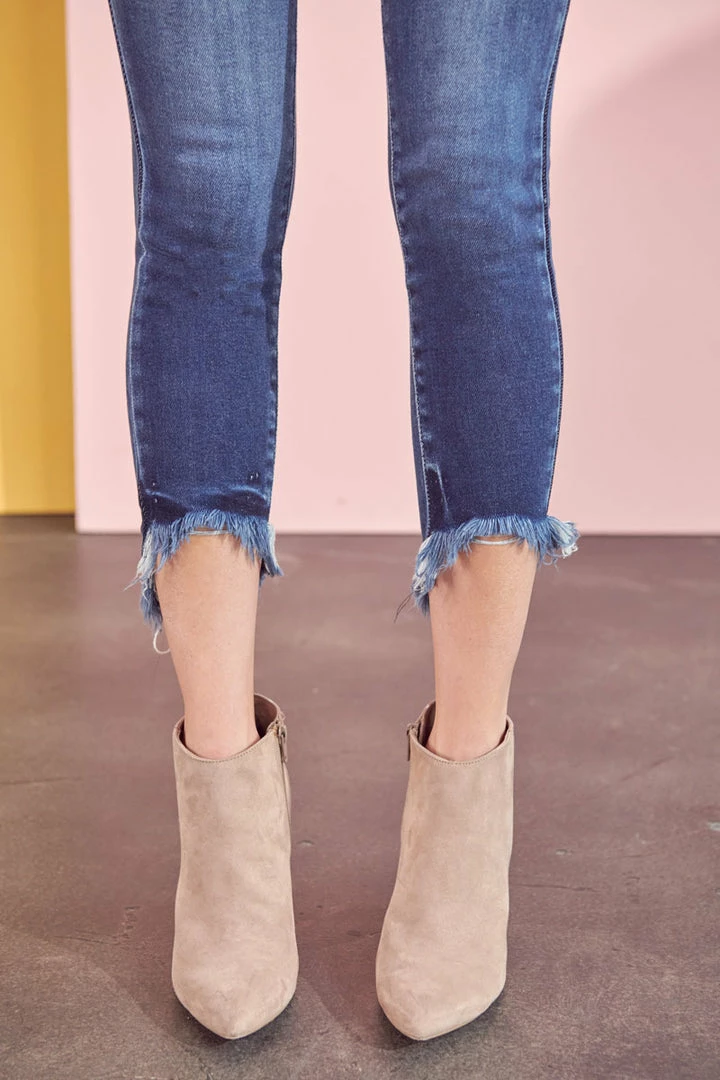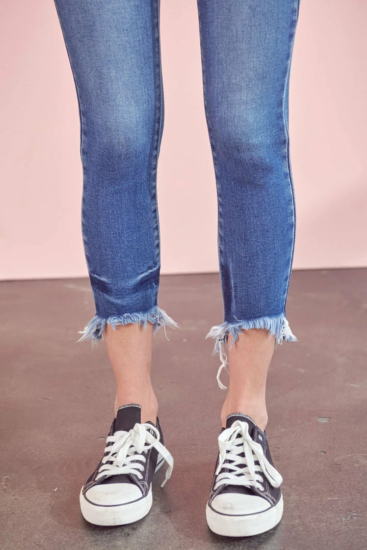 Indigo dark and medium washed ankle-length skinny that highlights slim silhouette, featuring light fading, subtle whiskering, and frayed scoop hem.