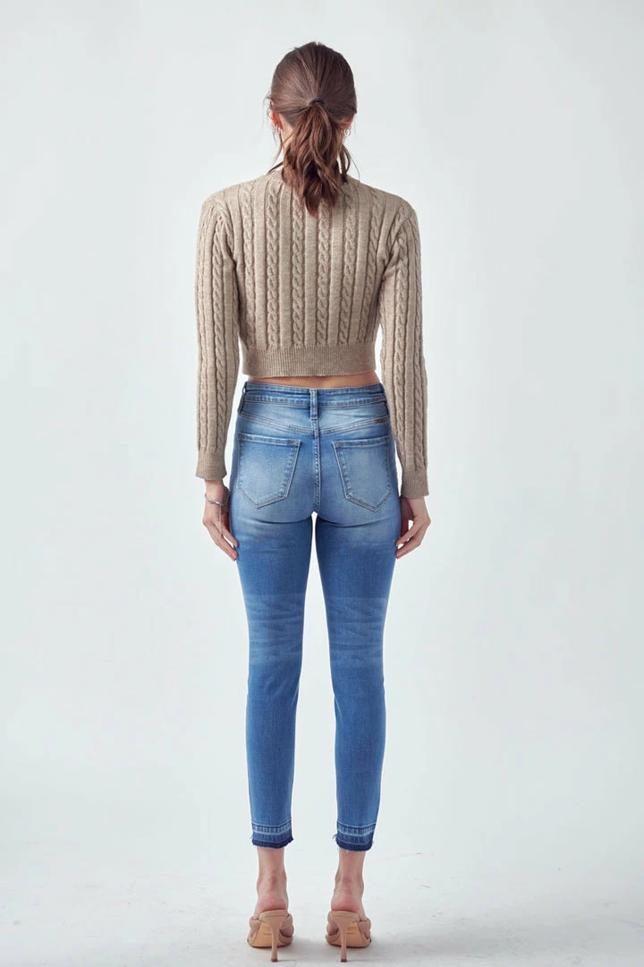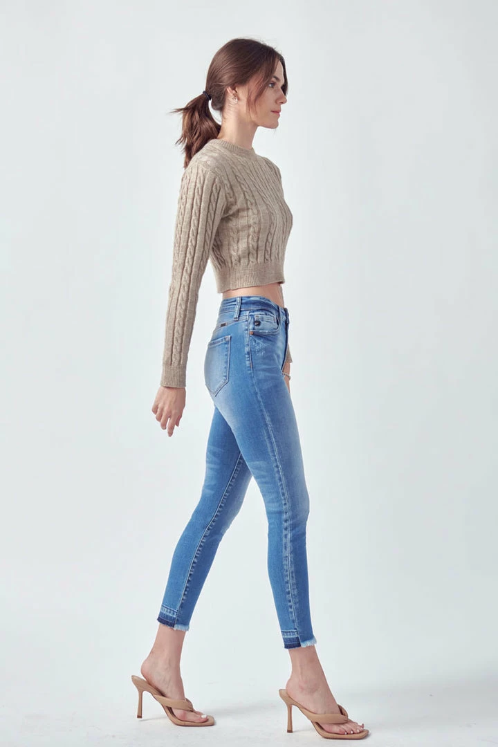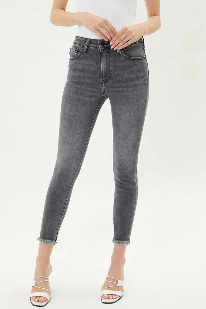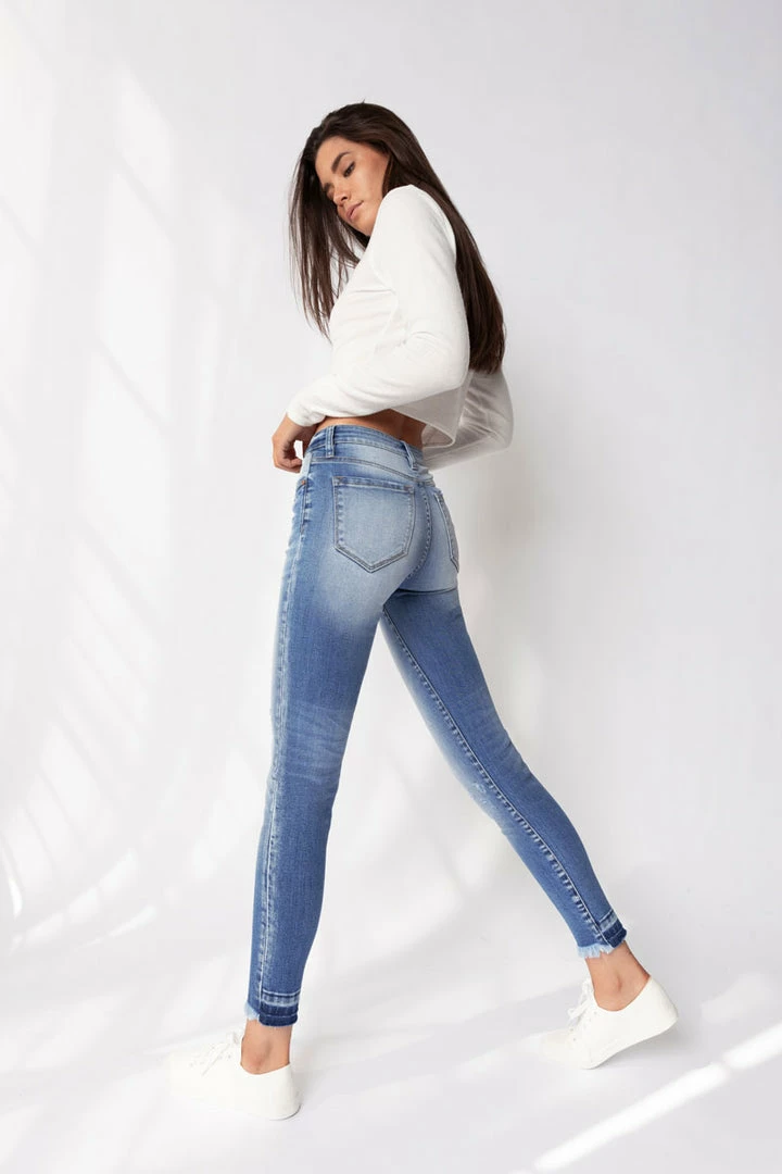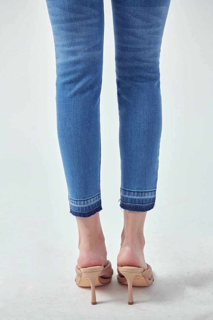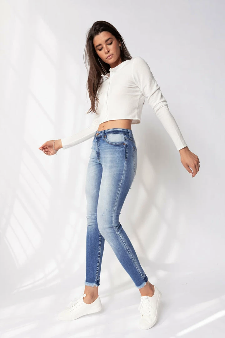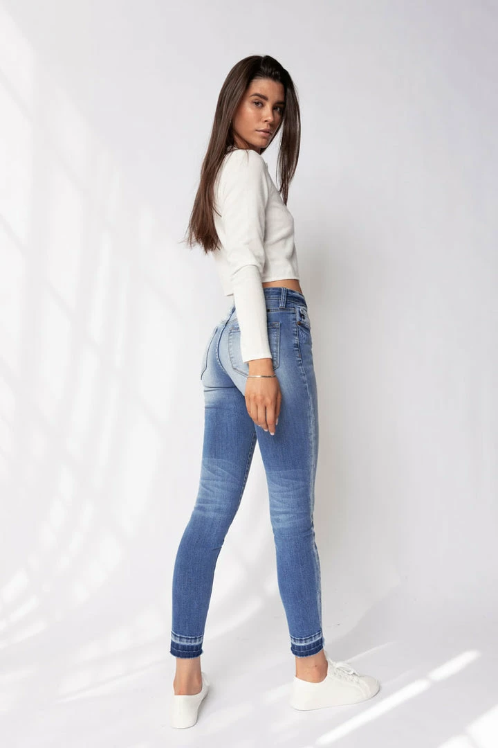 Denim with released raw hem detail that features light fading and whisker details. Our Darleen High Rise Jeans sit above the waistline as they taper down the leg to reveal an ankle skinny silhouette that’s made with soft, stretch denim. Features a classic five-pocket design, single-button front, and zip-fly closure.