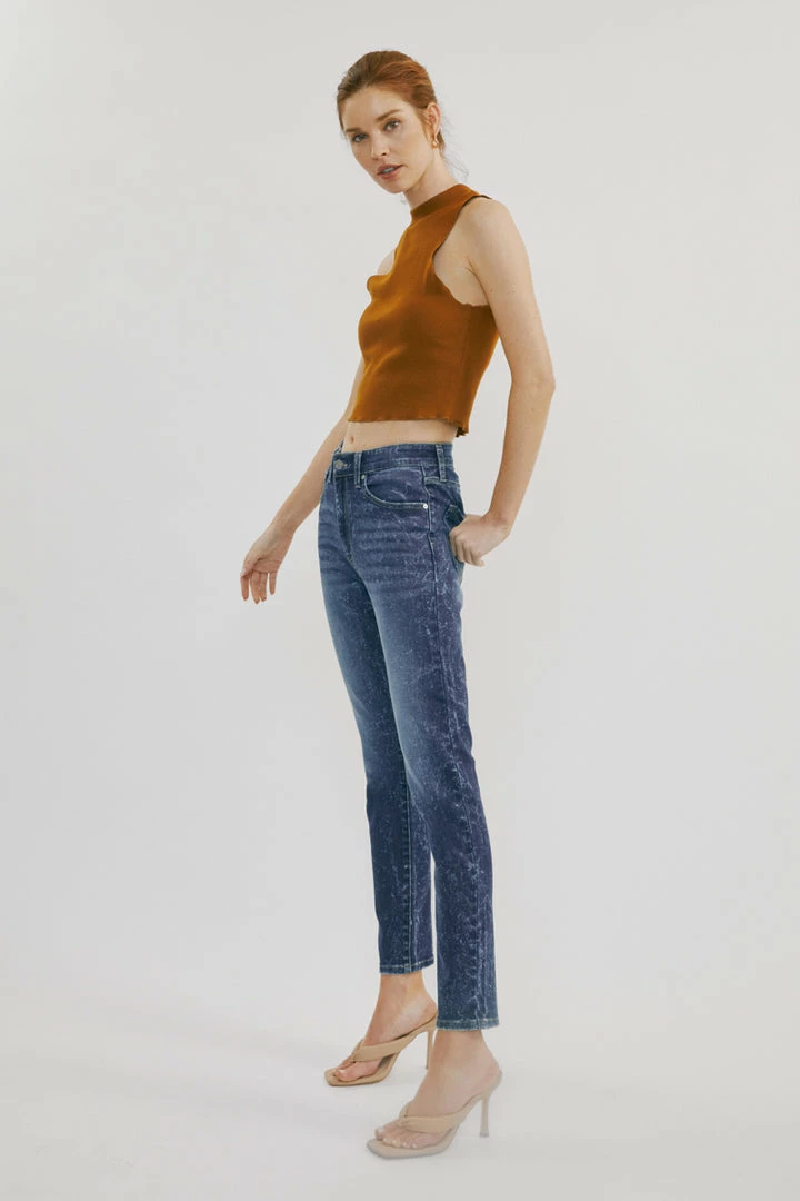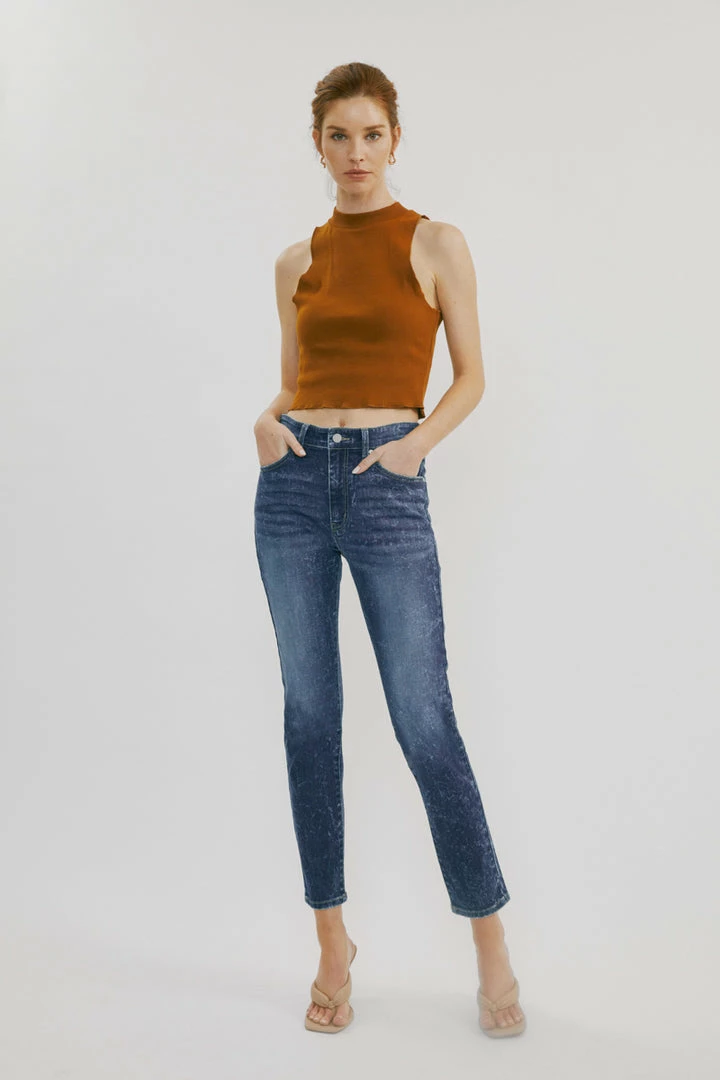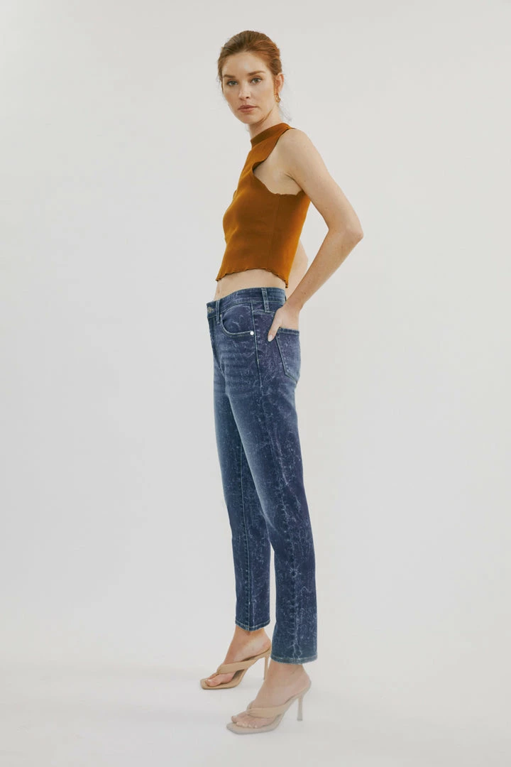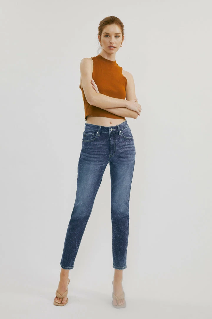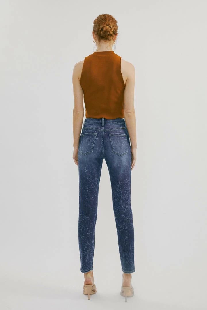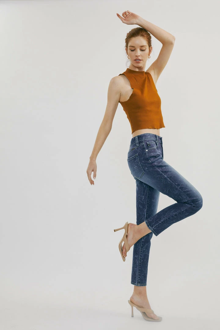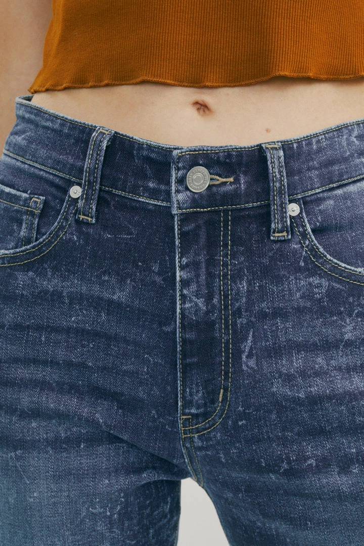 Our Deb High Rise Cigarette Leg Jeans feature a spattered acid wash on a faded dark blue denim wash with whiskering and contrast stitching. Made with comfortable stretch denim that is lightweight and won’t lose its shape after each wear. Comes with a classic 5 pocket design, a single button front, and a zip fly.