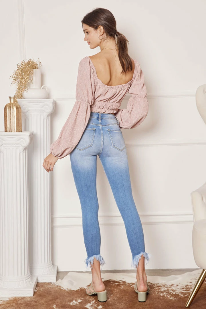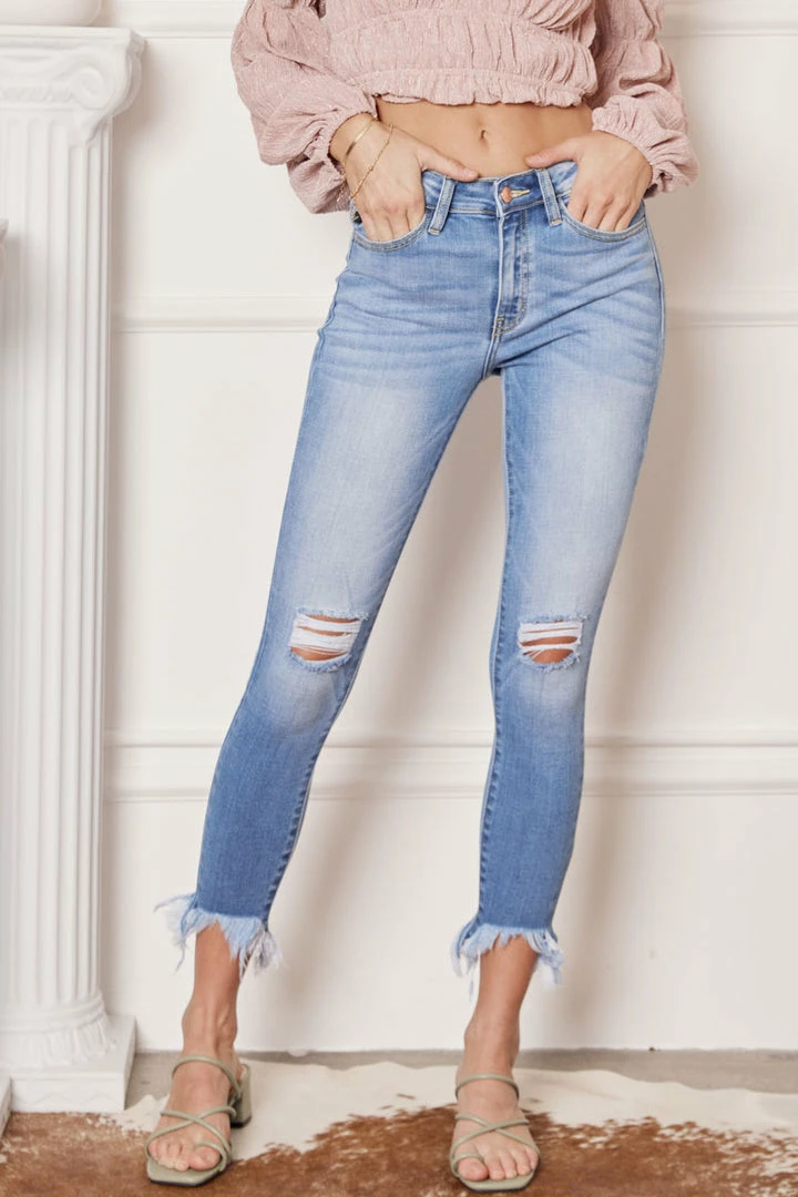 Light washed ankle-length skinny that lifts and shapes your every curve with good comfort. Featuring white fading, whiskering, a touch of distress, and a fringed hem.