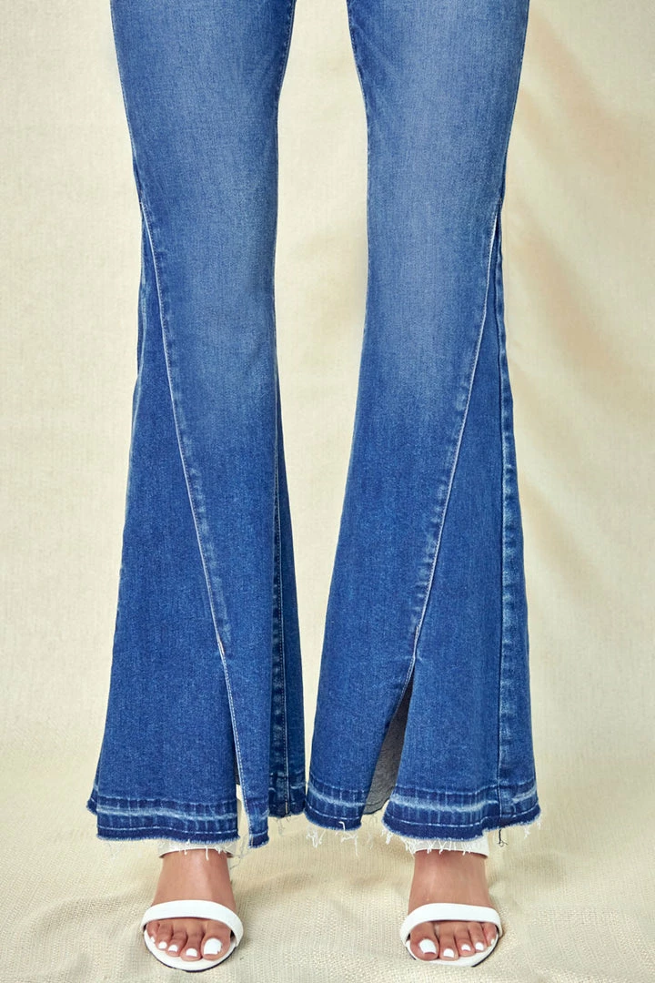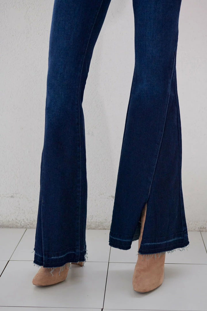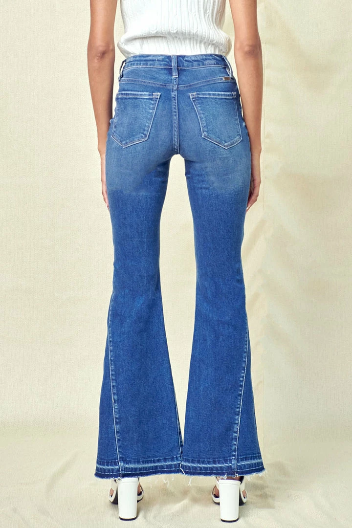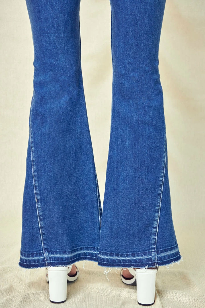 Show off your style with this pair of Desiree flare jeans with silhouette-enhancing medium-washed and dark-washed flare jeans crafted from soft denim, featuring light whiskering, fading, distress detail, 5-pocket design, and single button closure.Â