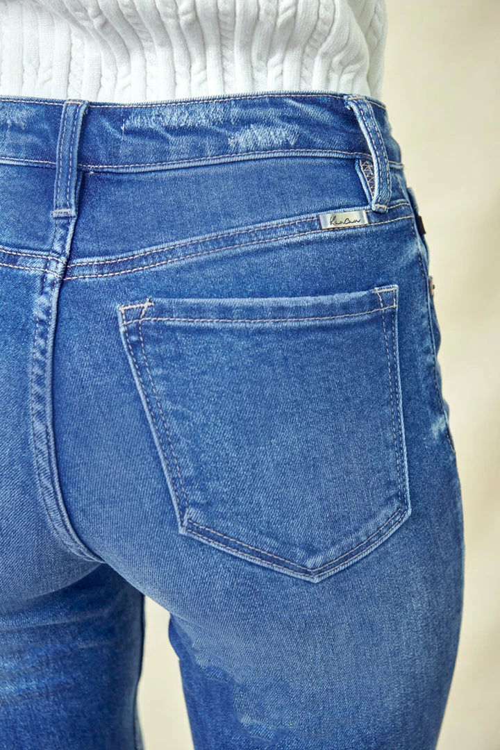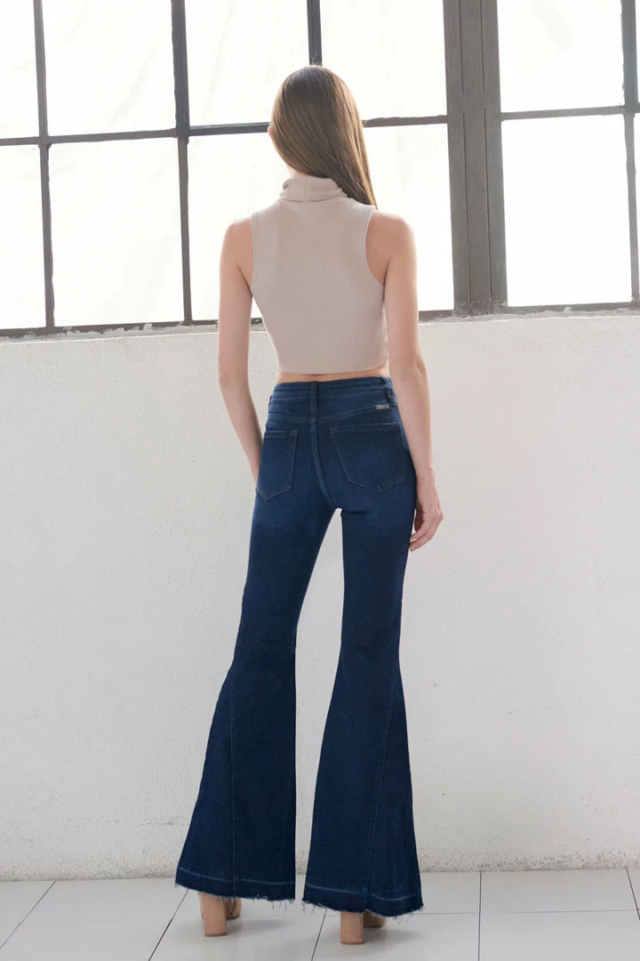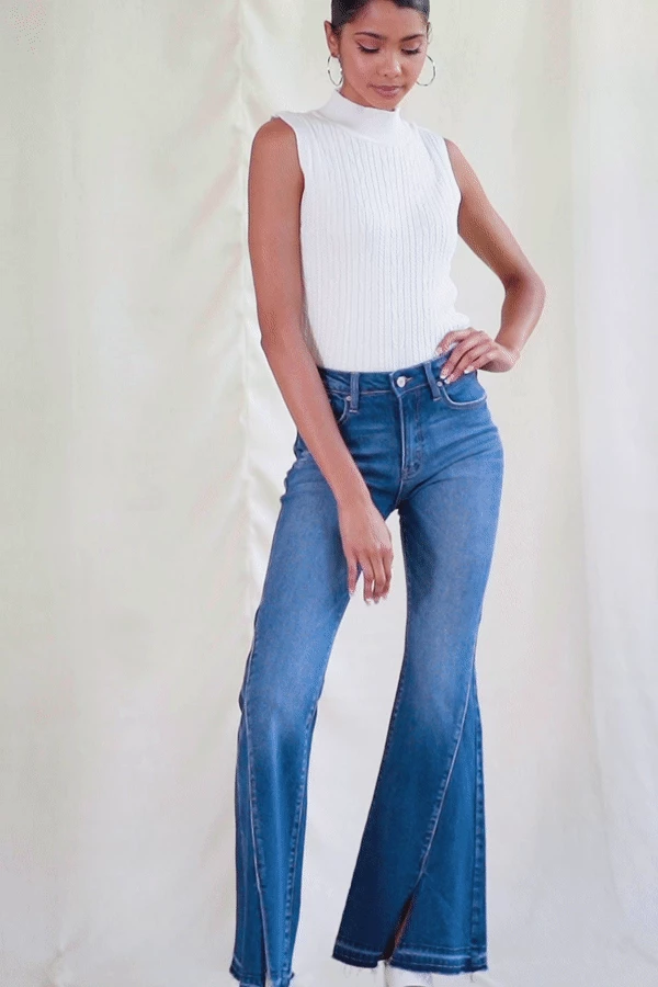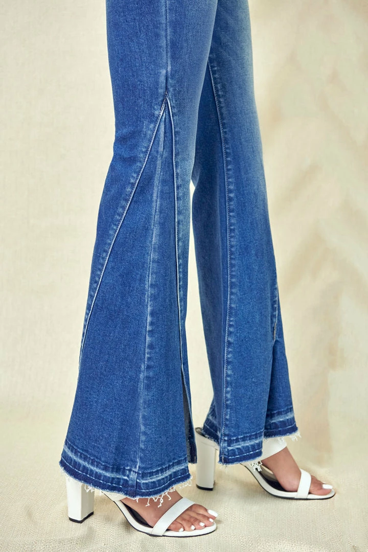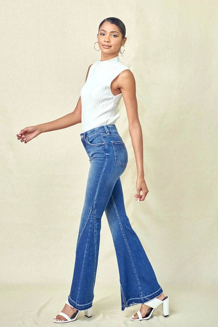 Show off your style with this pair of Desiree flare jeans with silhouette-enhancing medium-washed and dark-washed flare jeans crafted from soft denim, featuring light whiskering, fading, distress detail, 5-pocket design, and single button closure.Â