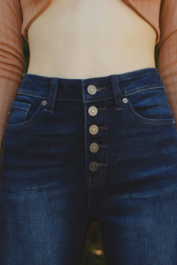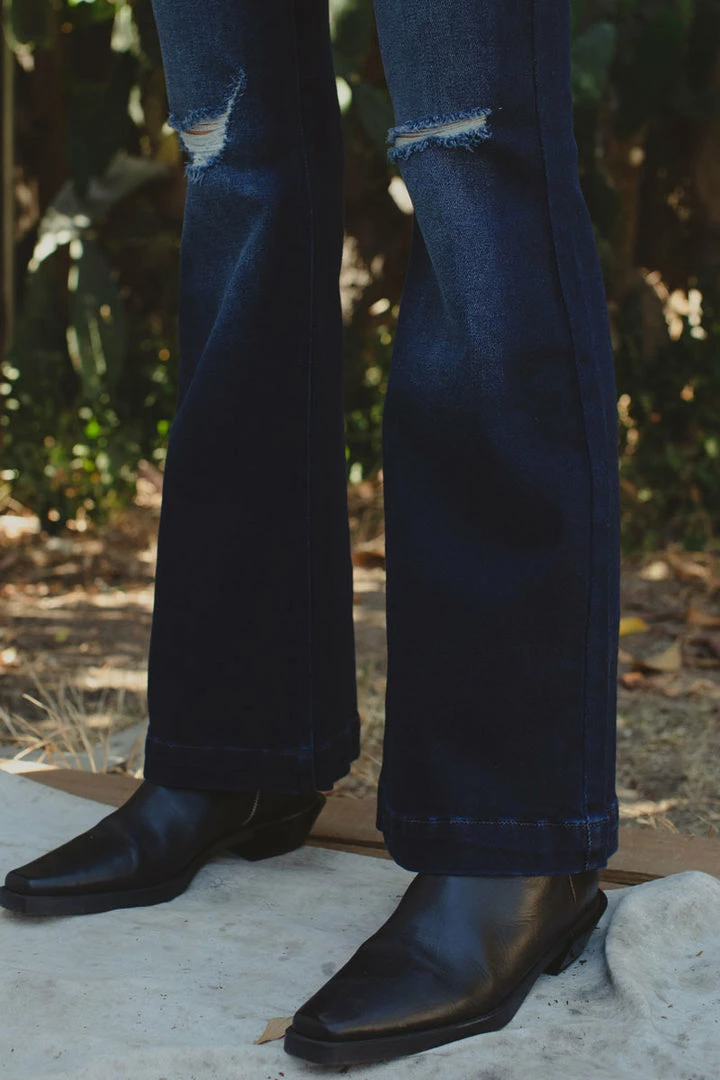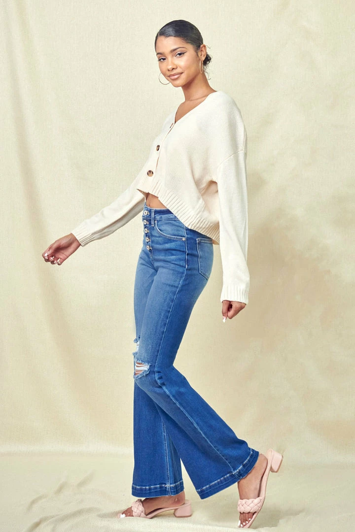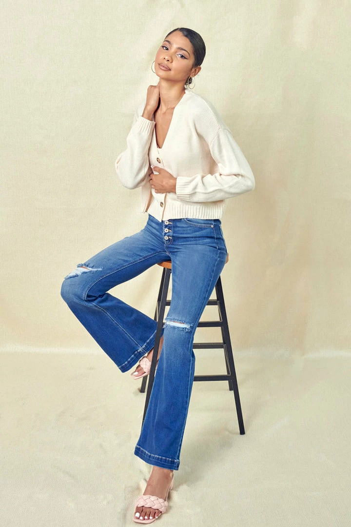 Update your wardrobe with this pair of stylish flare jeans featuring whiskering, fading, an ultra high rise waistline to cinch in the waist, 5-button closures at front, distressing details at the knees, and a 5-button front closure with zip fly.