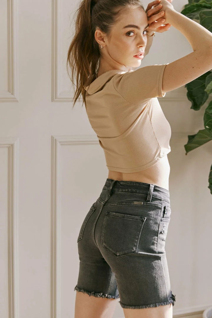 Our Dolly High Rise Bermuda Shorts come in fitted washed-black denim for a flattering silhouette that will hug your every curve. Sits above the natural waistline for a trendy fit that tapers down the thigh and leg. Made with super-stretch denim that allows you to move freely with ease as it reverts to its natural fit after each wear. Features a classic five-pocket design with single-button front and zip fly closure, finished with black-colored hardware.