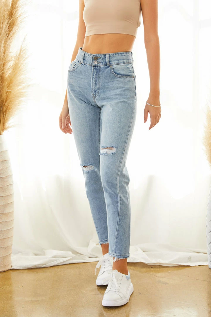 Our Dorrine High Rise Mom Jeans come with minor distress and a destructed hemline for a subtle worn-in look. Sits high above the natural waistline as it relaxes down the leg creating a loose-fitting silhouette that’s flattering and goes well with any outfit. Made with rigid denim that’s durable yet flexible enough to move with your body. Features a classic five-pocket design, two-button front, and zip-fly closure.