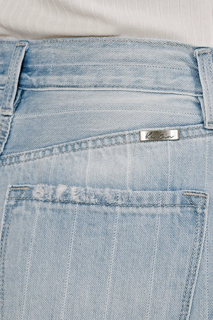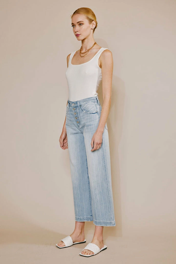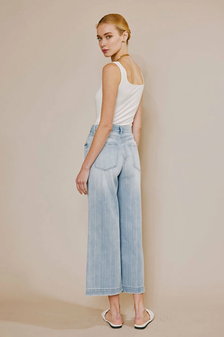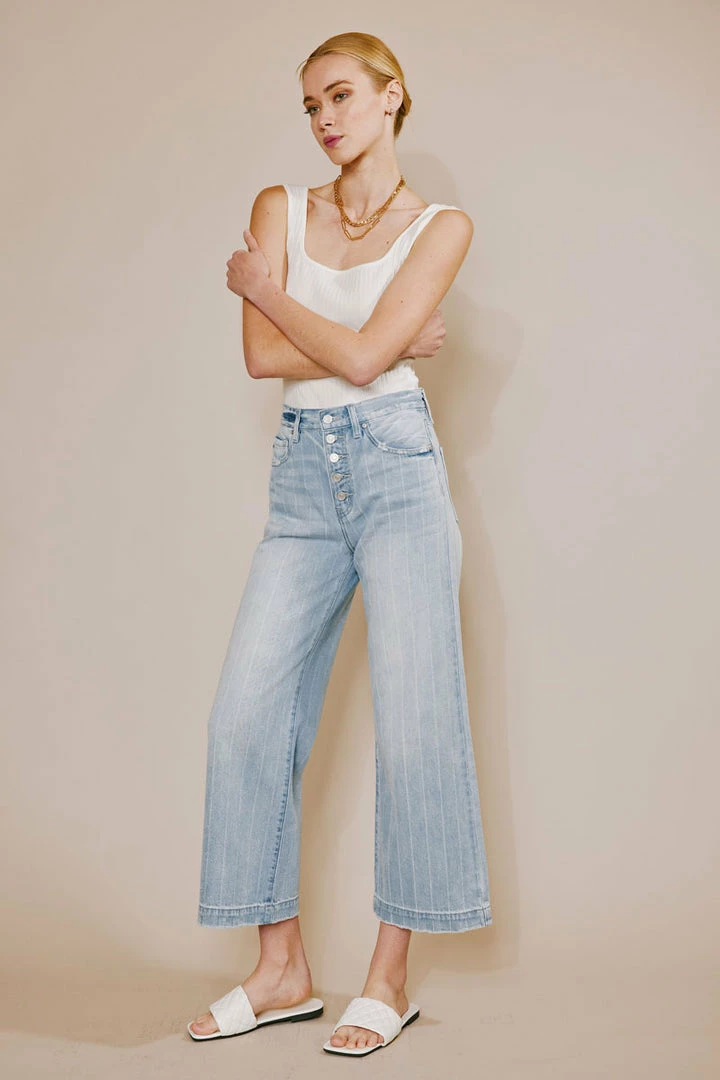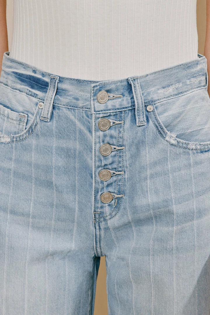 The 90s are back and calling your name to grab these striped wide-leg-styled jeans! Comes in a light blue wash with subtle pocket distress and subtle frayed hem with distress. Made with rigid lightweight denim for comfort. Features an exposed button fly and 5-pocket design.Â