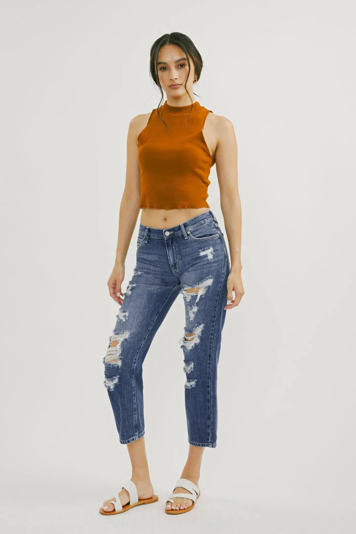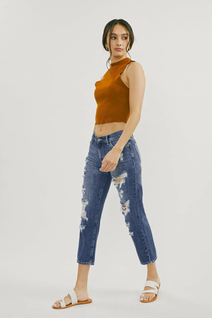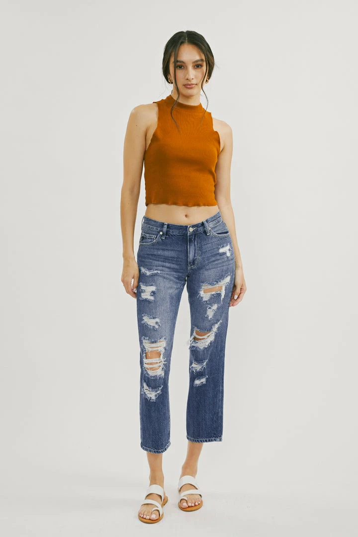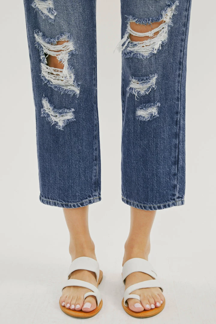 A medium-washed blue jean with heavily distressed details that give this piece a worn-in, rugged look that’s perfect for any season wear. Sits right at the natural waistline for an easy fit as it relaxes down the thigh. A relaxed denim jean that gives you just the right amount of edge that you can choose to dress up, or down. Comes in a rigid denim that holds its shape even after repeated wear with a classic 5-pocket design, single-button front, and zip-fly closure.