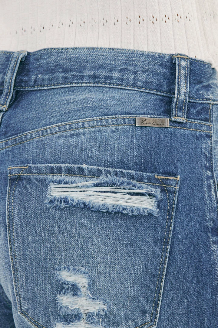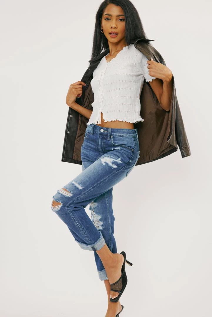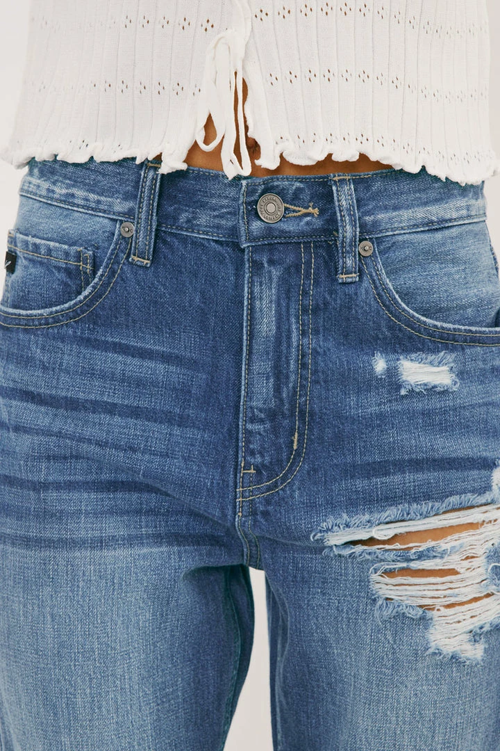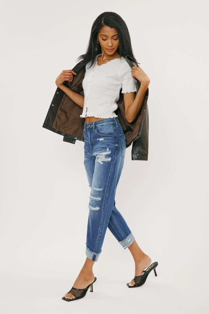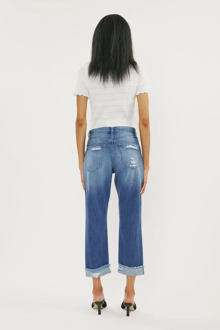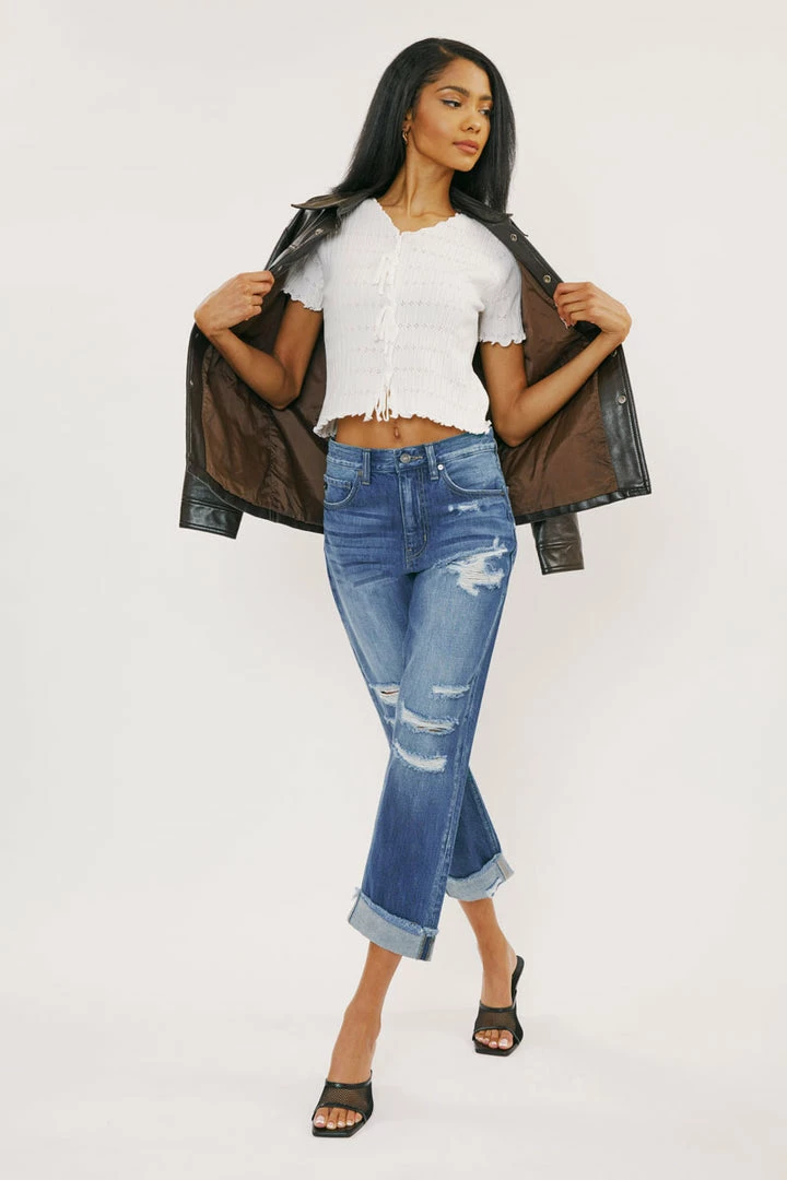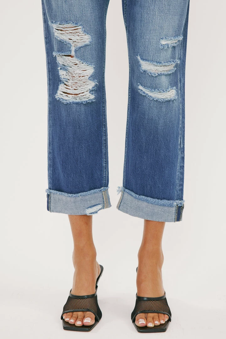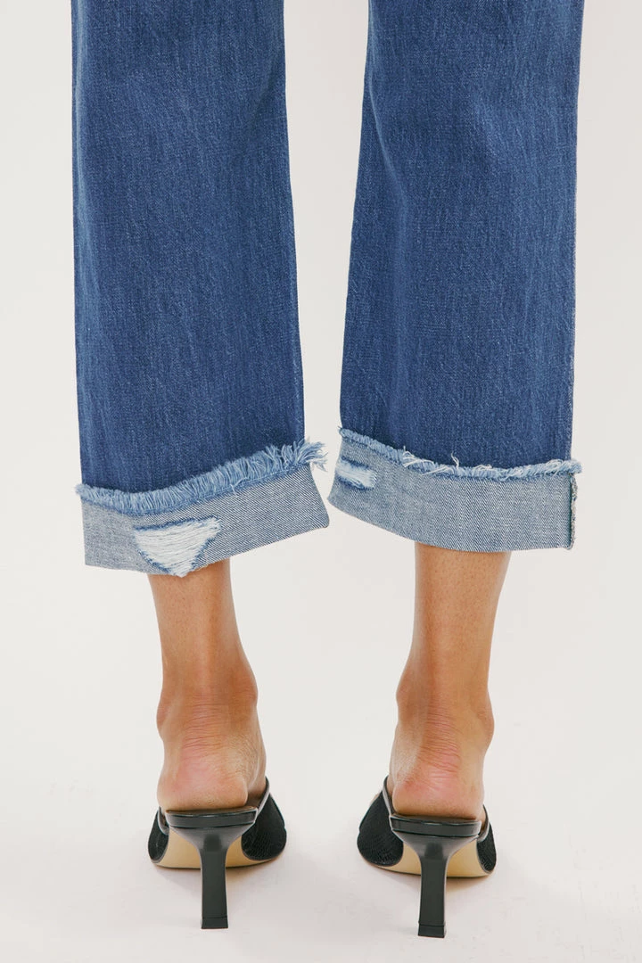 Show off your sleek yet trendy style with our Eloise high-rise straight-leg jeans featuring optimal destruction, fading, whiskering, and cuffed hems. Made with rigid non-stretch denim for a classic authentic denim look. Features a 5 pocket design, a single-button closure, and a zip fly.