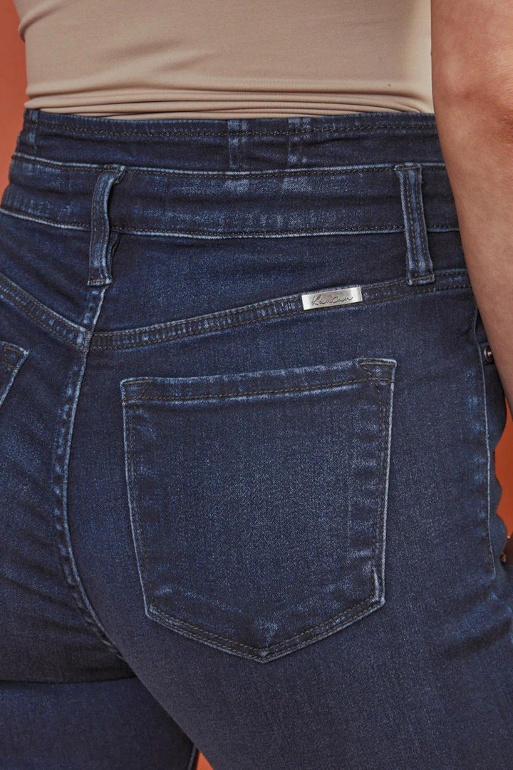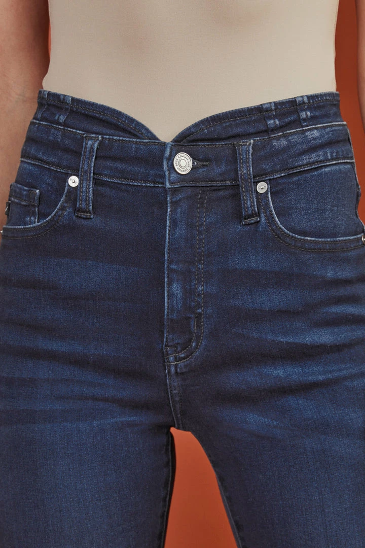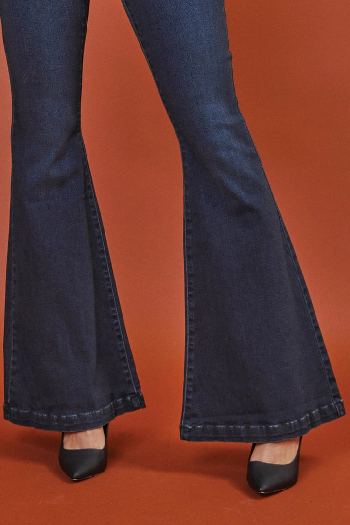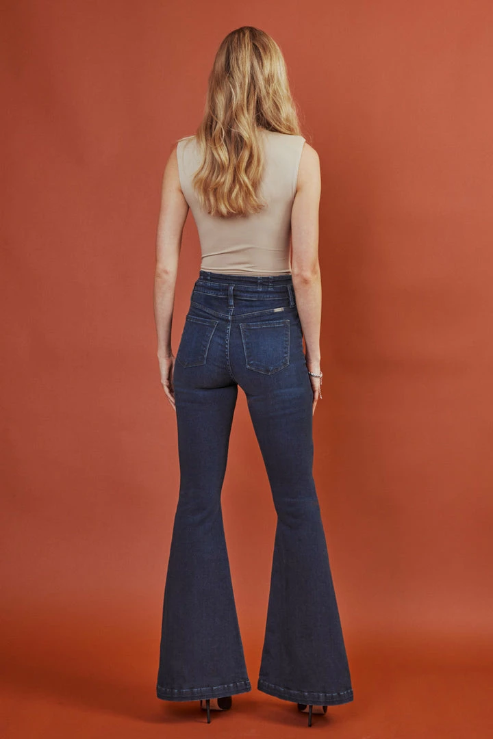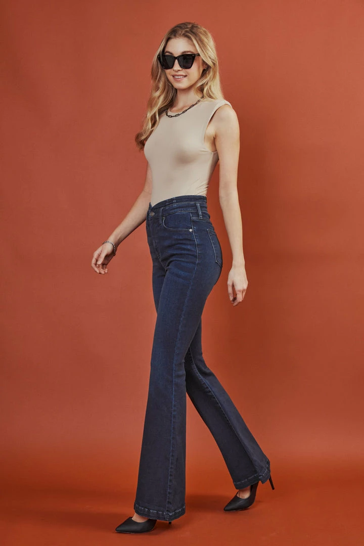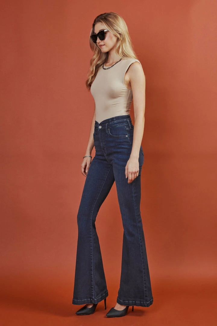 Dark wash stretch denim with 3-D whiskering and a unique v-front waist that elongates the body with a high rise and sleek flare silhouette. Our Elowen Jean creates a unique style that’s emphasized with waist design elements and its rich blue color. Stretch denim makes wearing this piece feel comfortable and easy while its retention holds its flare shape after wear. Features a classic five-pocket design, single-button front, and zip-fly closure. Finished with silver-colored hardware.