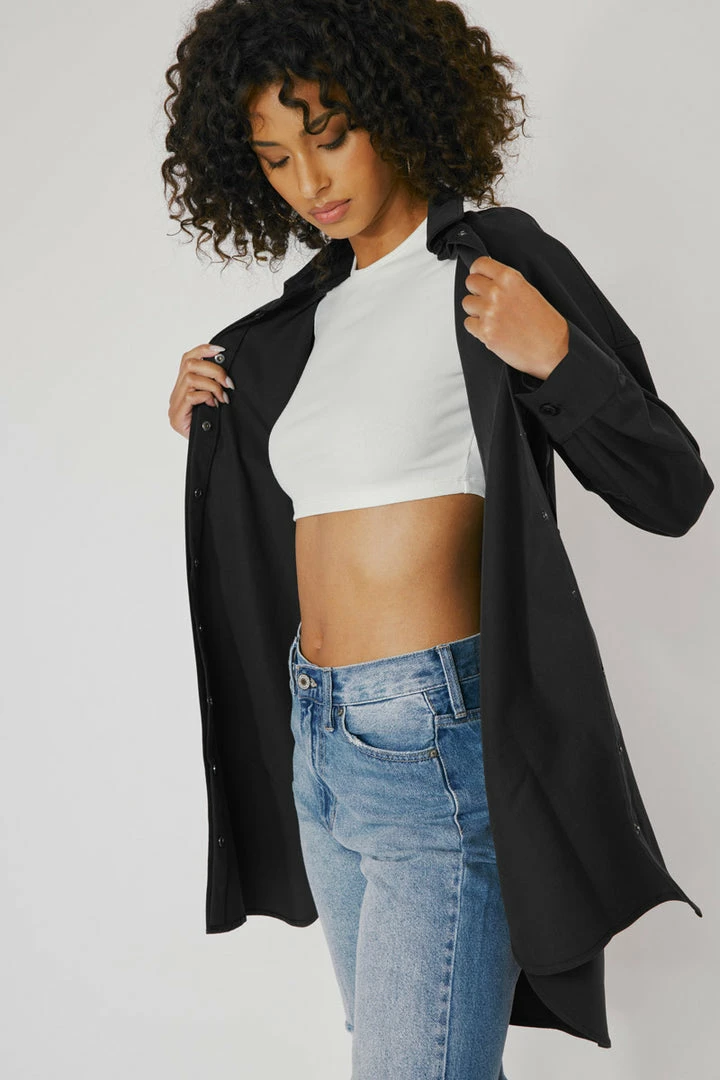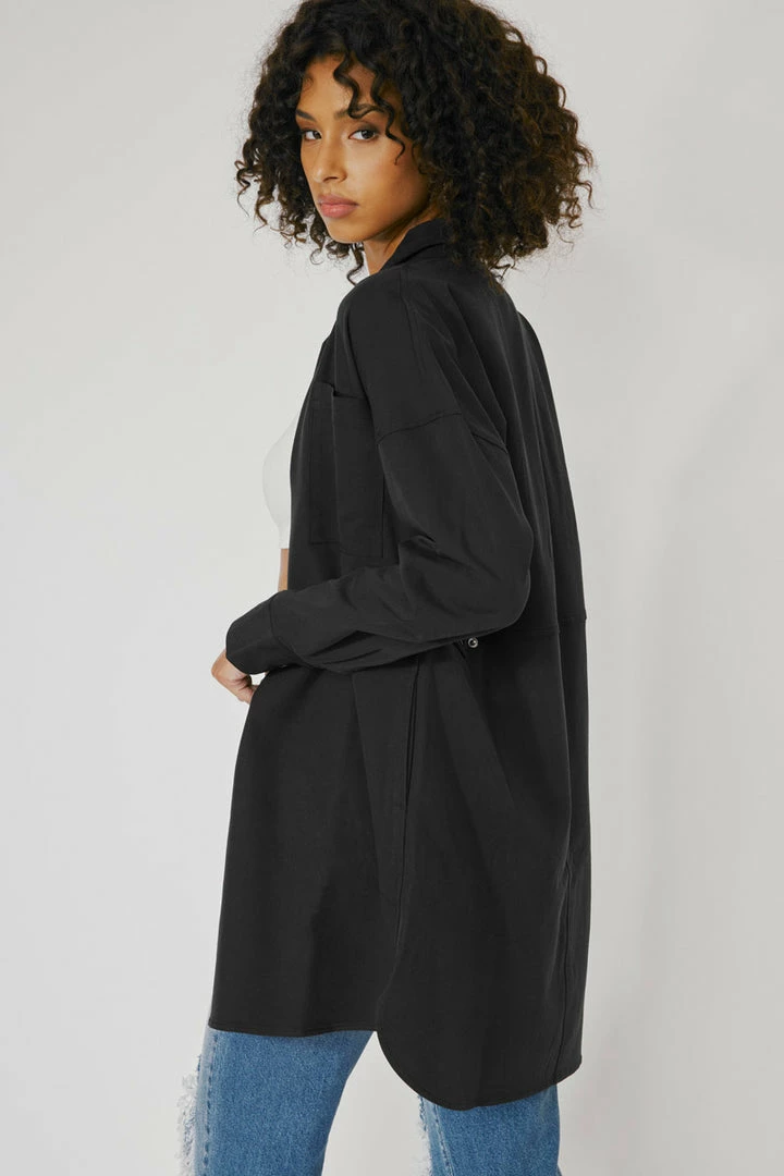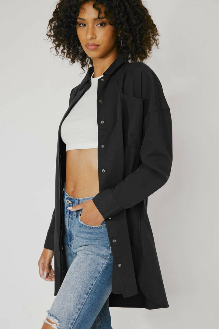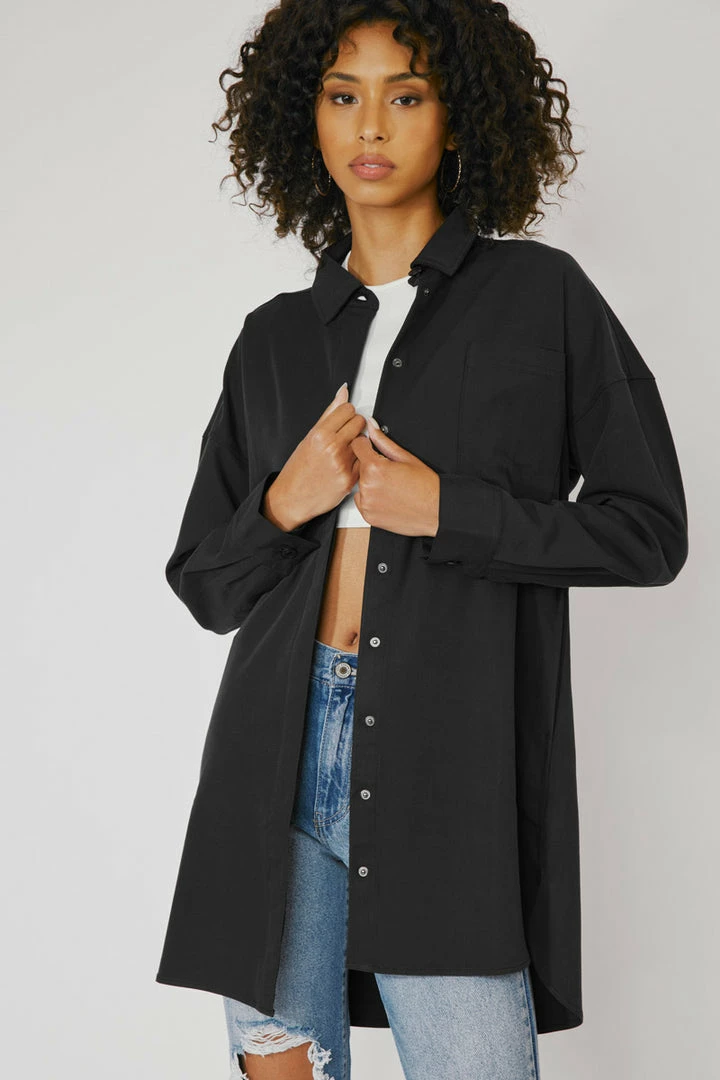 Dress up with our Emery Dress Shirt. It is the perfect wardrobe piece that can be paired with minimalistic jewelry for a classy and chic outfit. The dress shirt comes in a classic black wash and has a side slit detail. Features a front patch pocket, 2 side pockets, and a snap button closure.Â