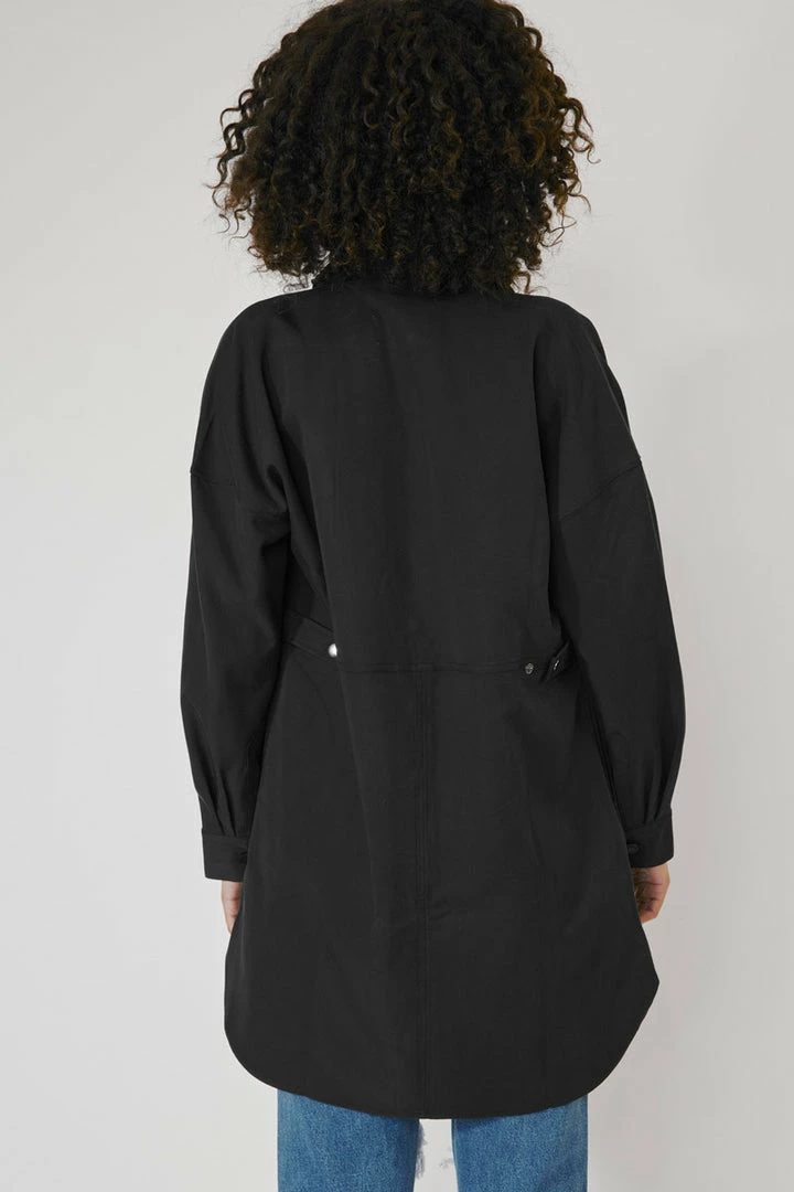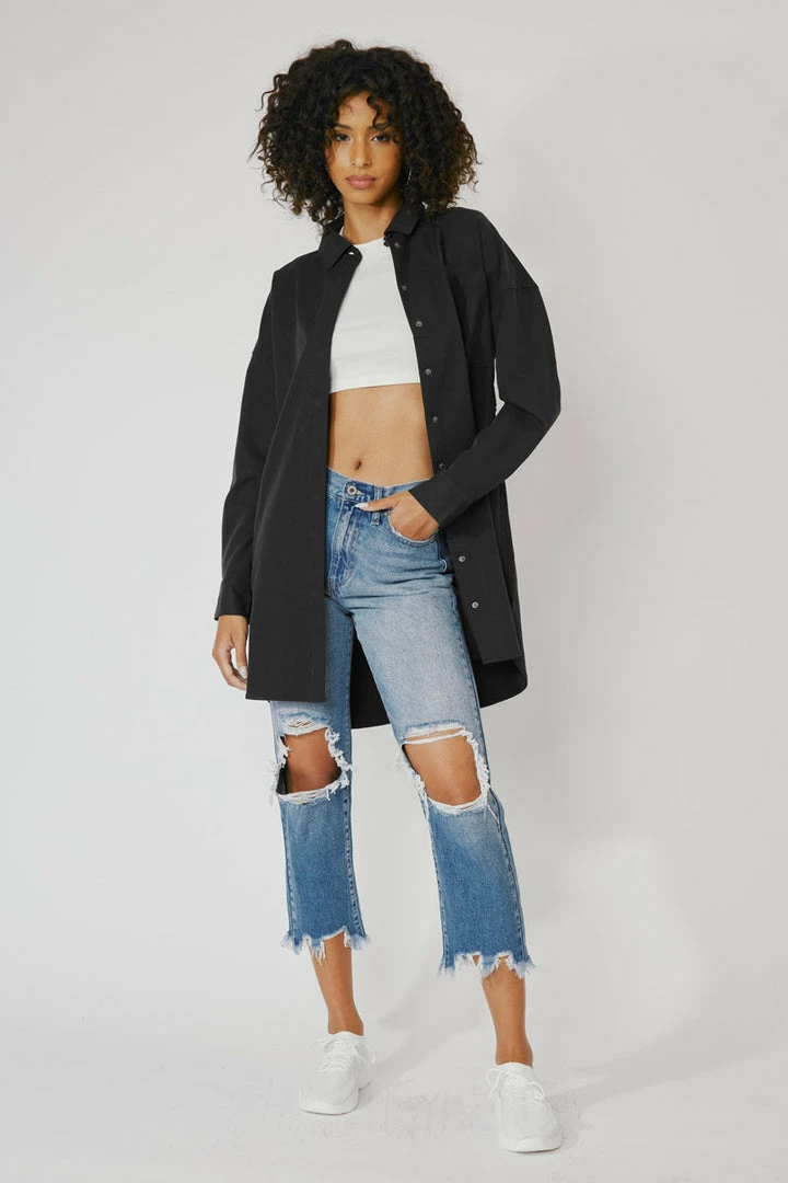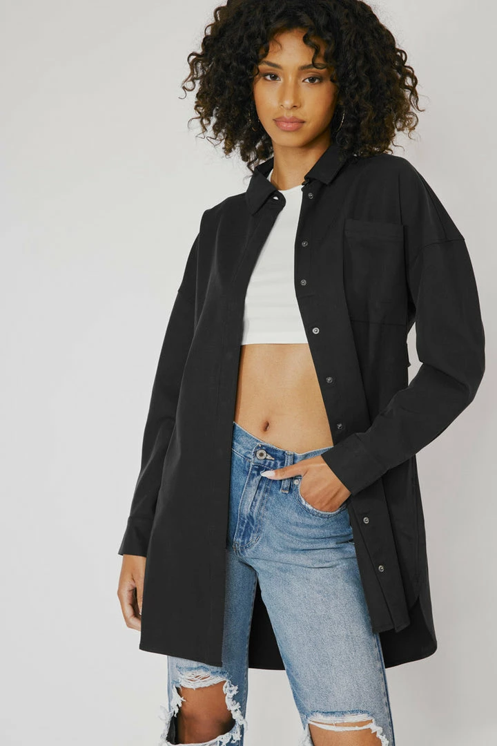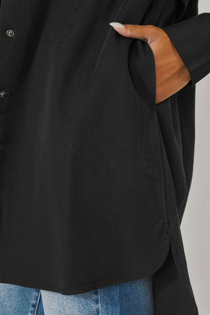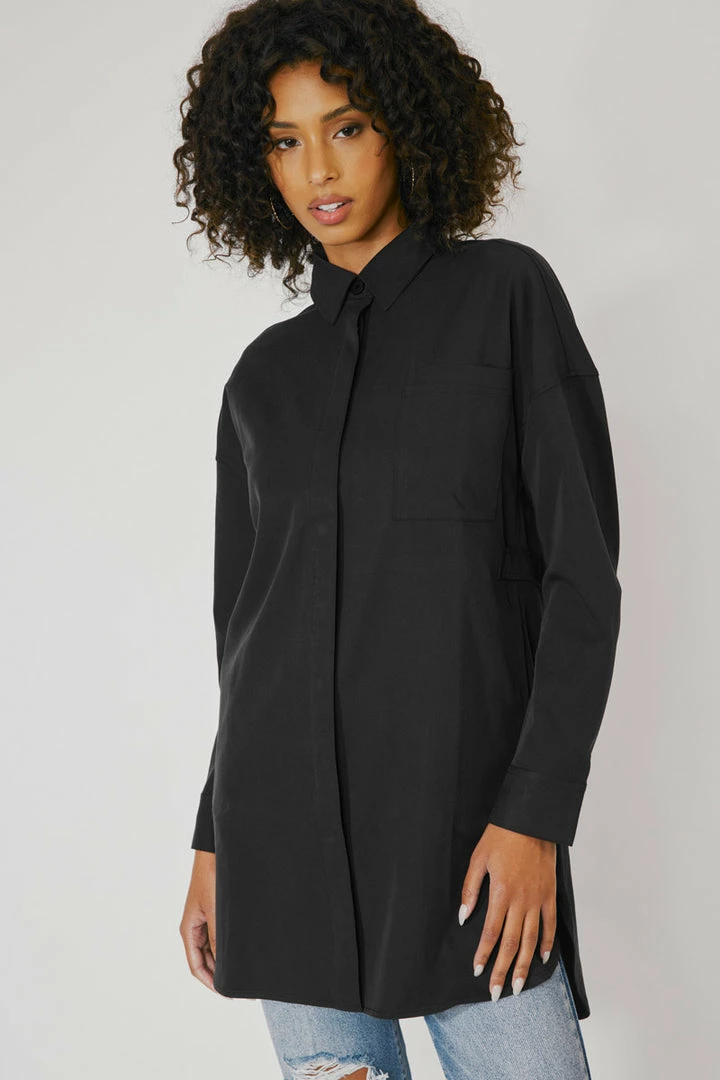 Dress up with our Emery Dress Shirt. It is the perfect wardrobe piece that can be paired with minimalistic jewelry for a classy and chic outfit. The dress shirt comes in a classic black wash and has a side slit detail. Features a front patch pocket, 2 side pockets, and a snap button closure.Â