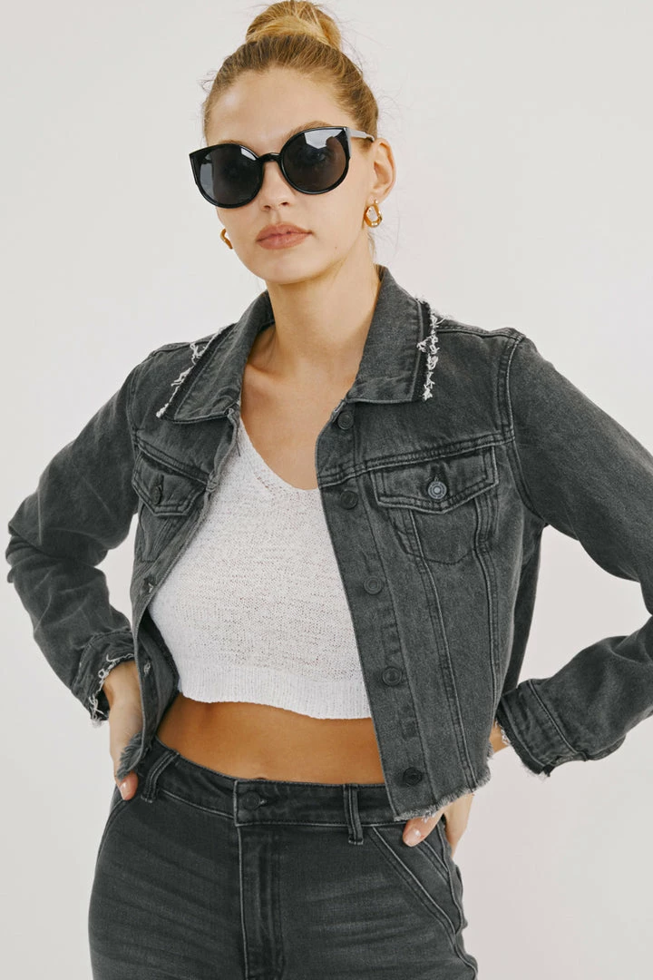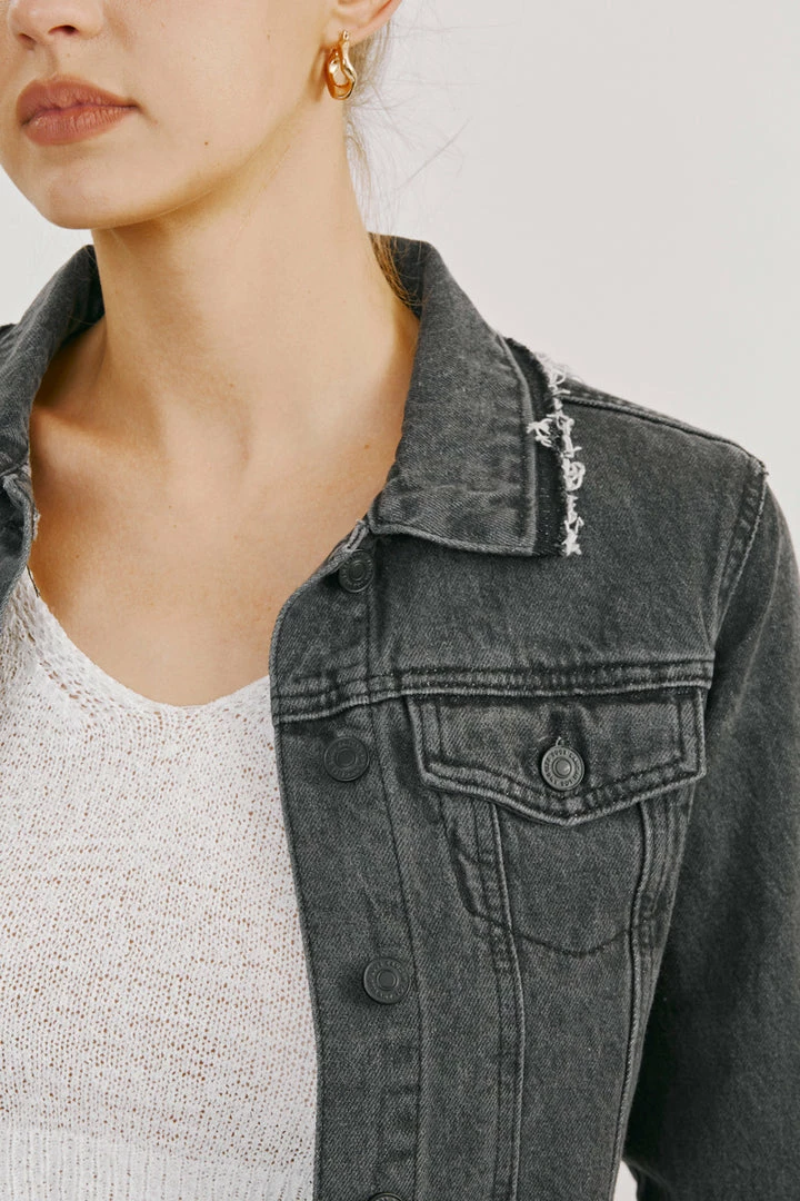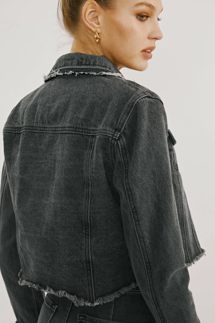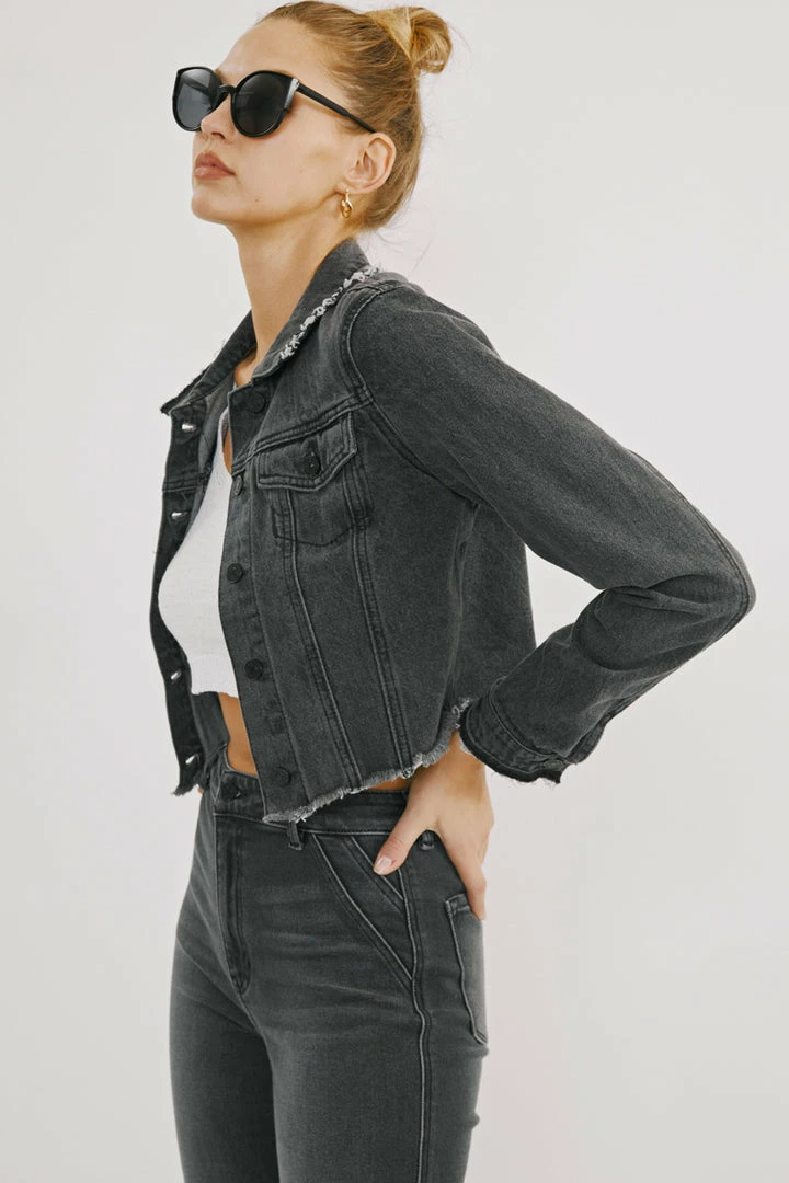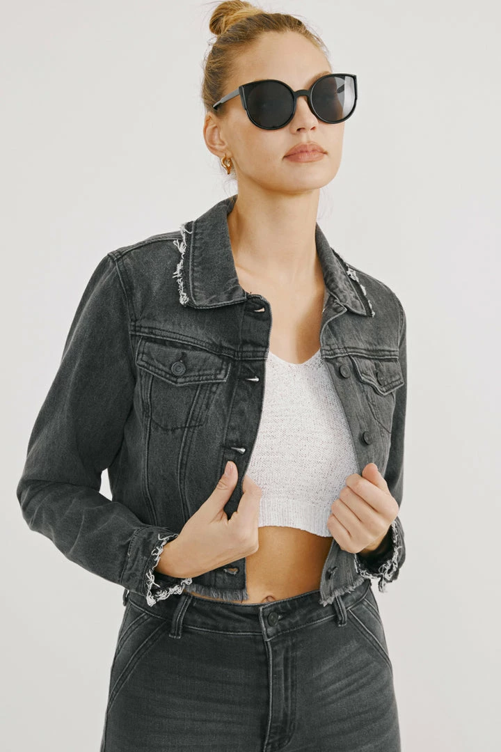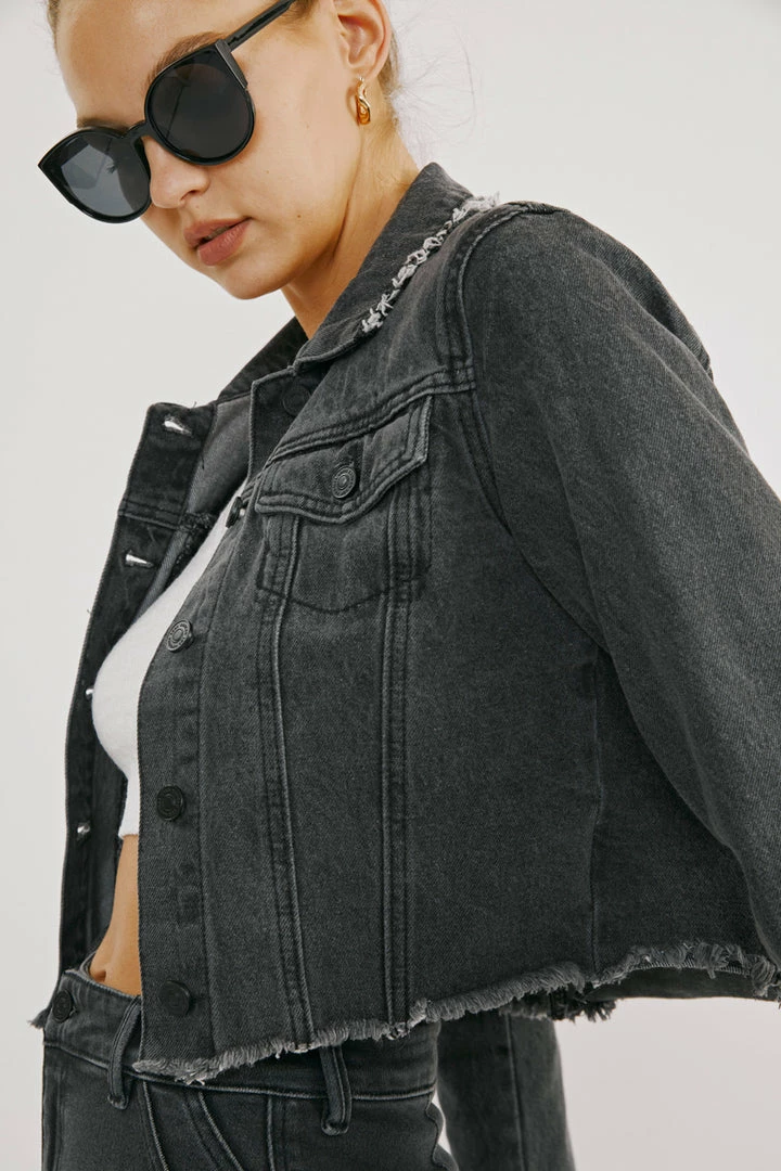 Faded grey and medium wash cropped jacket that is sure to keep you warm on a colder day but still give you style. Our Erika denim jacket has an edgy hip vibe, perfect for throwing on over a T-shirt or knitted top. Features light distress along it’s raw released hem on the collar and cuff, and frayed bottom edges that give it a more lived-in look. Features two button-flap pockets at the chest, and contrast darker grey along the bottom of the sleeves.Â