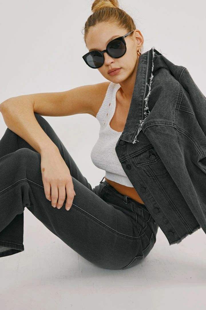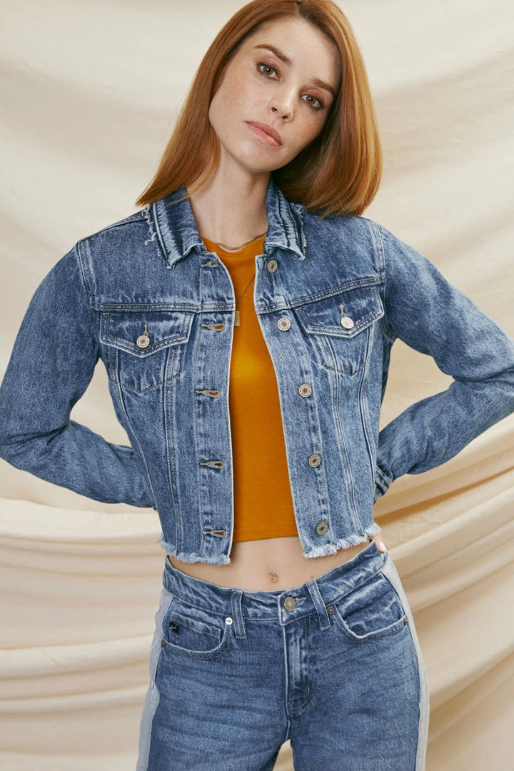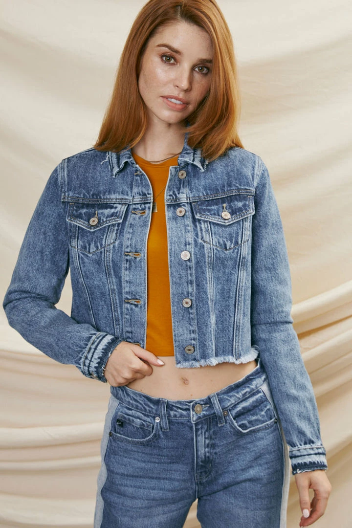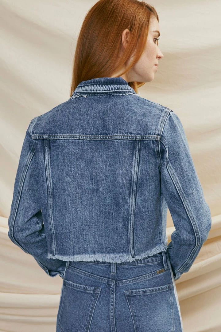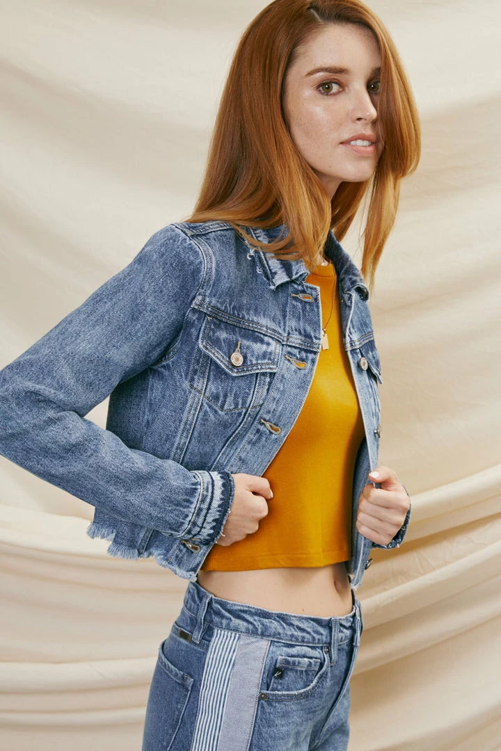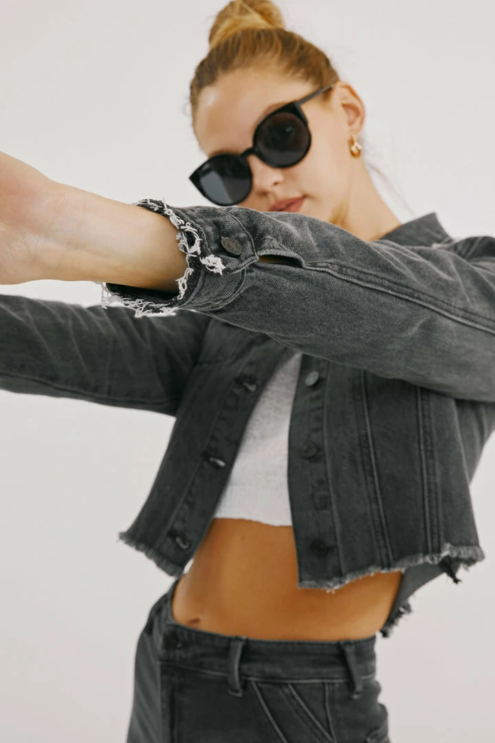 Faded grey and medium wash cropped jacket that is sure to keep you warm on a colder day but still give you style. Our Erika denim jacket has an edgy hip vibe, perfect for throwing on over a T-shirt or knitted top. Features light distress along it’s raw released hem on the collar and cuff, and frayed bottom edges that give it a more lived-in look. Features two button-flap pockets at the chest, and contrast darker grey along the bottom of the sleeves.Â