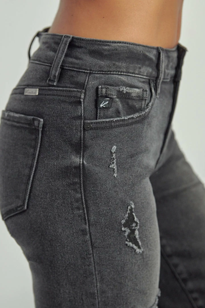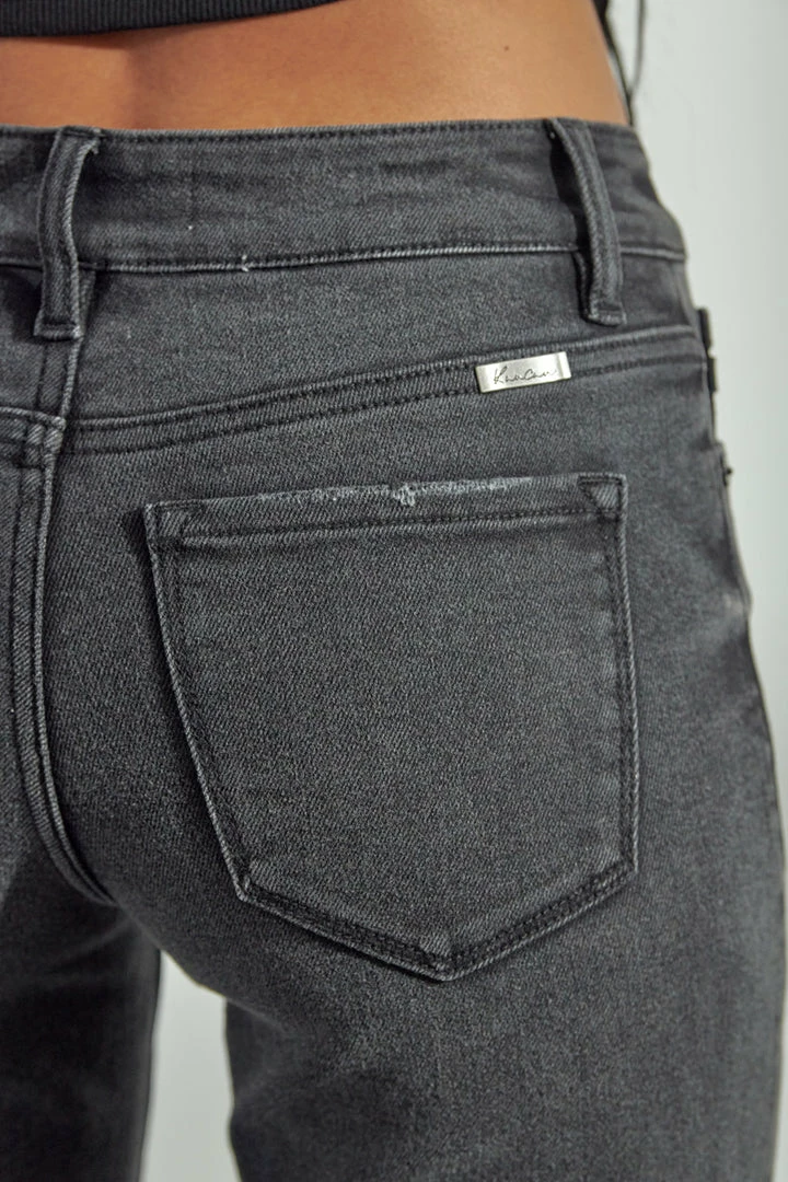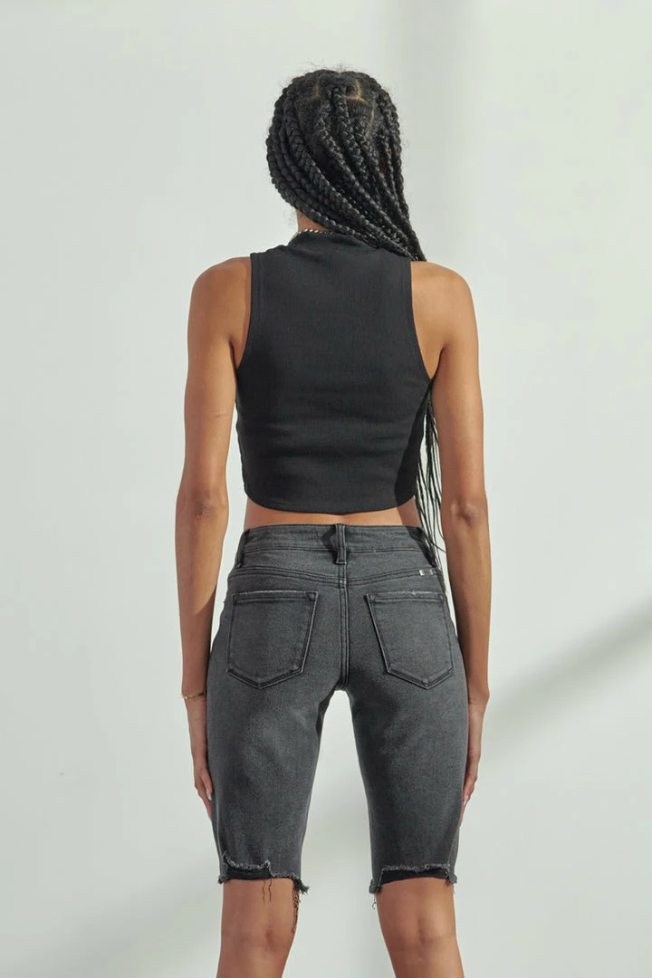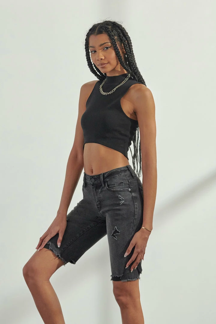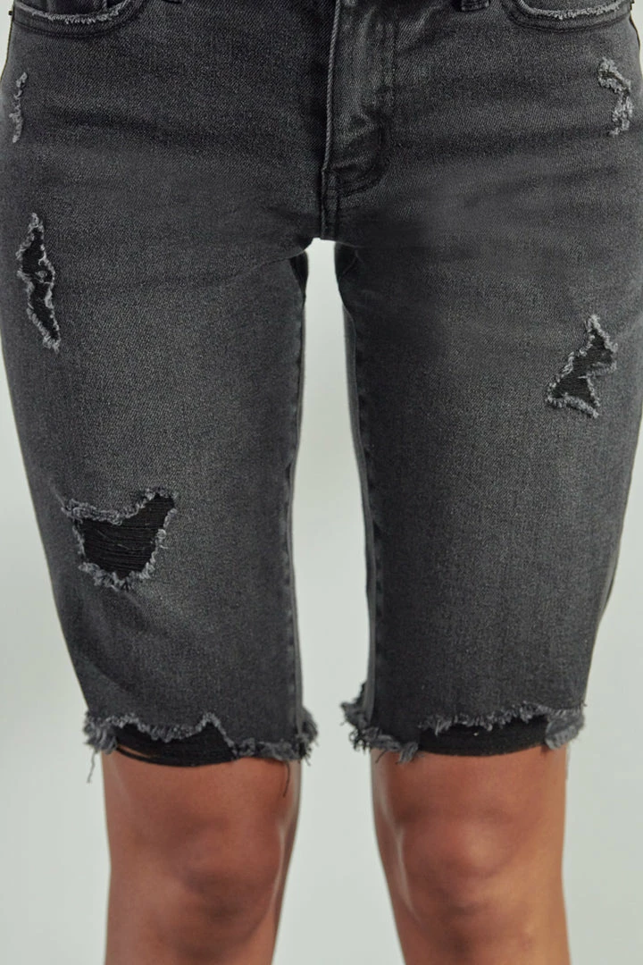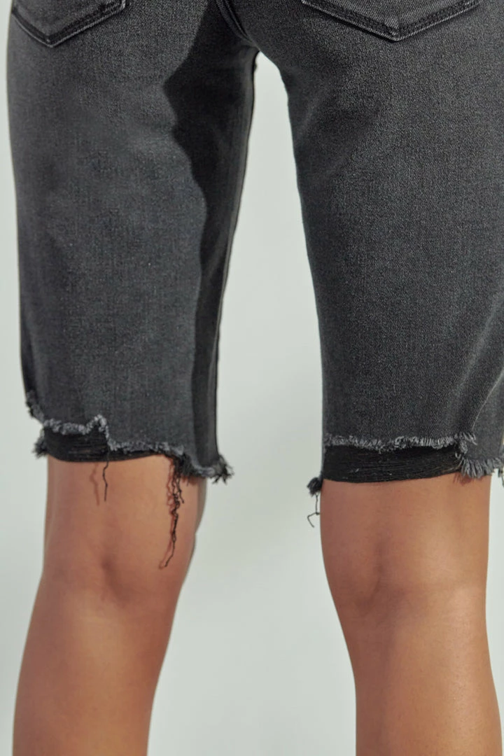 Our Estelle Mid Rise Bermuda Shorts come in black denim with distress and a raw hem design for an edgy, worn-in look. Sits right at the natural waistline for an easy fit that tapers down the leg for a form-fitting style, perfect for dressing up your summer wardrobe. Made with super-stretch denim that’s breathable and comfortable. Features a classic five-pocket design, single-button front, and zip fly closure. finished with black-colored hardware.