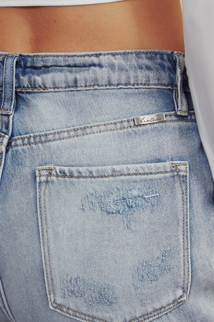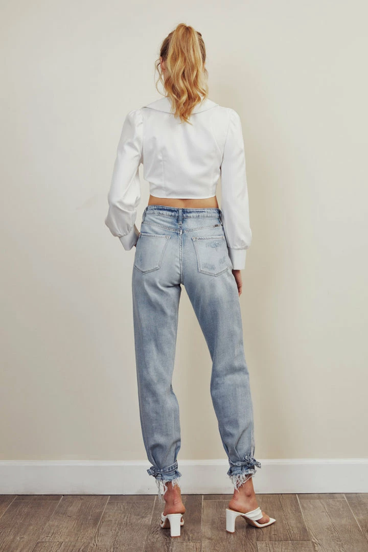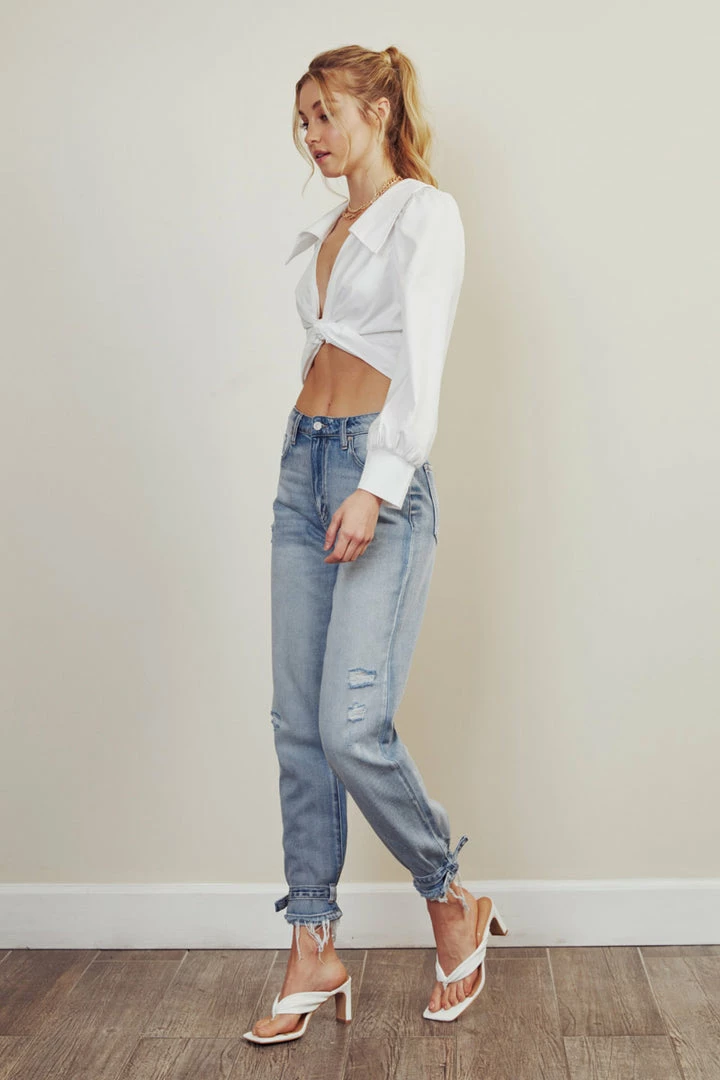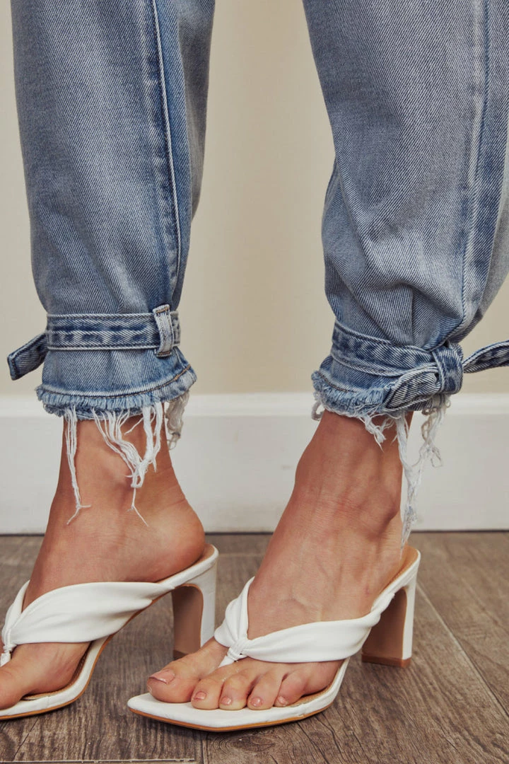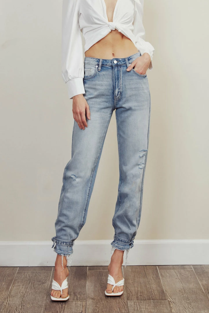 Light wash denim structures with subtle faded details and distress come together to form this unique jogger style. Our Ezeral High Rise Jogger sits above the natural waistline as it lightly parachutes down the leg and finishes at the hemline that features buckle detailing. Made with rigid non-stretch denim that’s comfortable and lightweight. Features a classic five-pocket design, single-button front, and zip-fly closure. Finished with single-colored hardware.