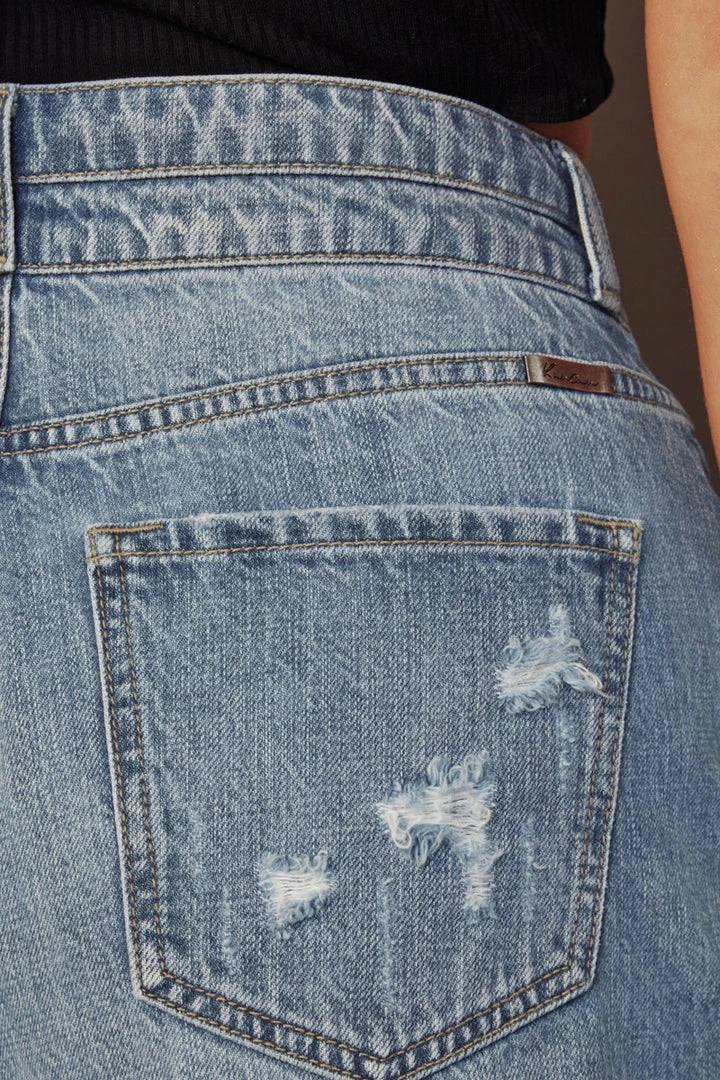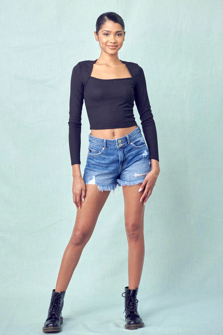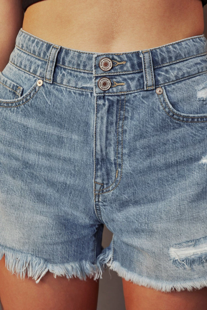 Our Farah high-rise short gives an edgy vibe that’s perfect for everyday wear. Pairs best with casual tees or crop tops for a comfortably chic look. Featuring whiskering, fading, distressed details, frayed hem, 5-pocket design, and a double-button closure with zip fly.