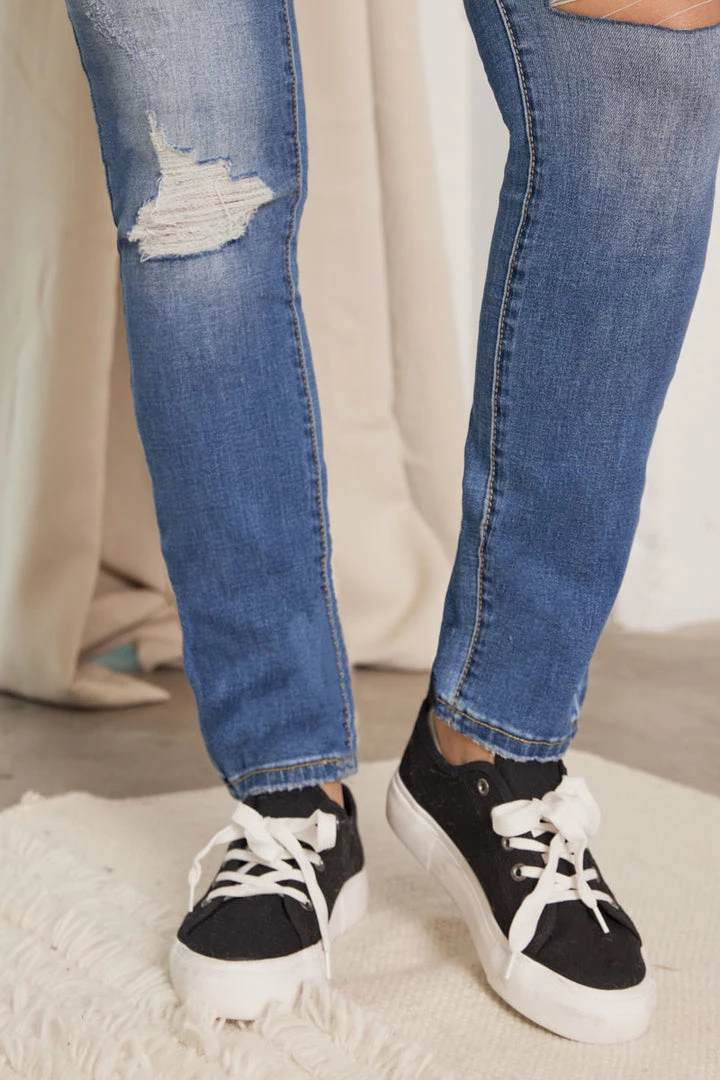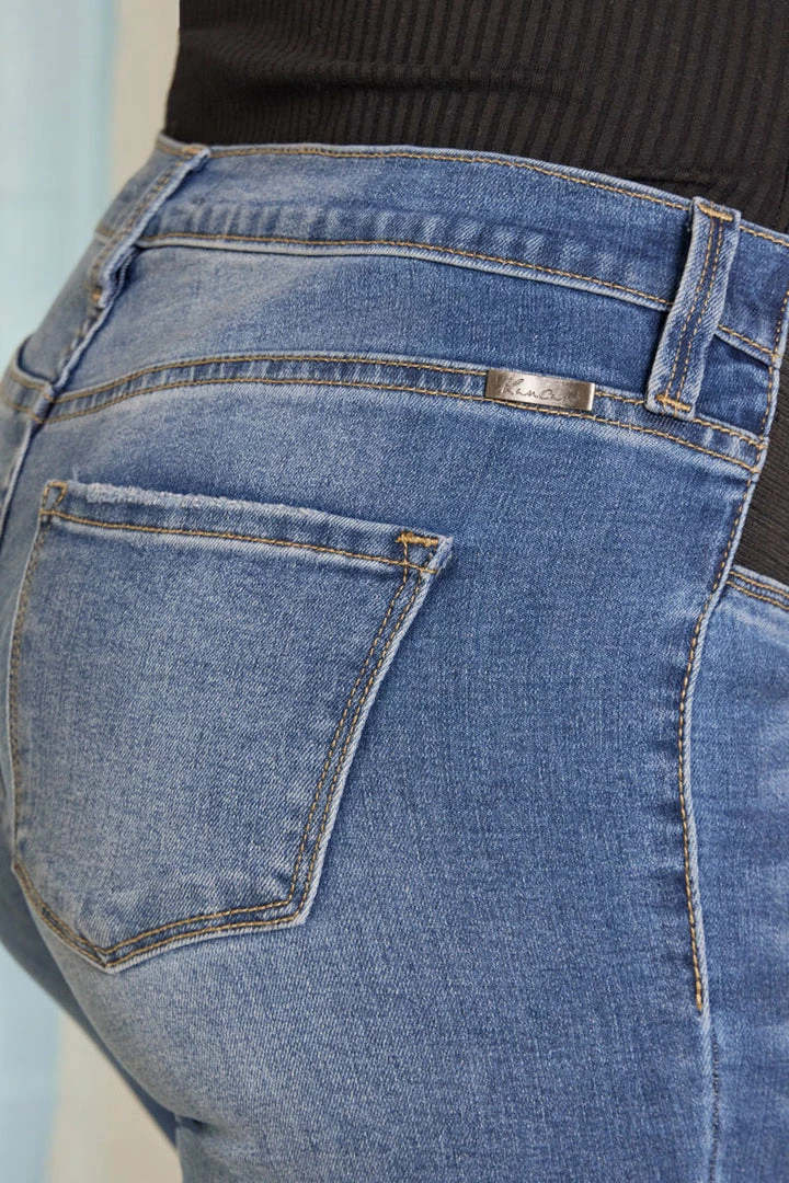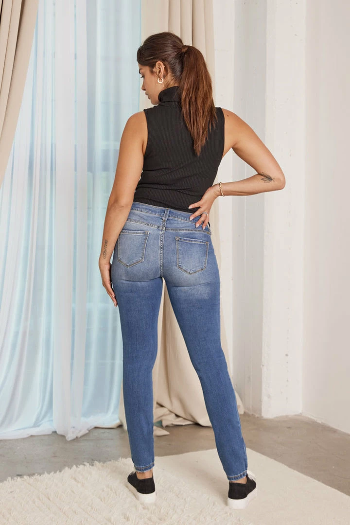 A medium-washed maternity jean featuring a full stretch waistband. Features beautiful fading, 3D whiskering, and a classic super skinny fit that will keep you looking stylish. Comes in a 7″ rise and is made with soft, stretch denim for a comfortable and breathable design. Features a classic five-pocket design and a single button closure sealed closure.